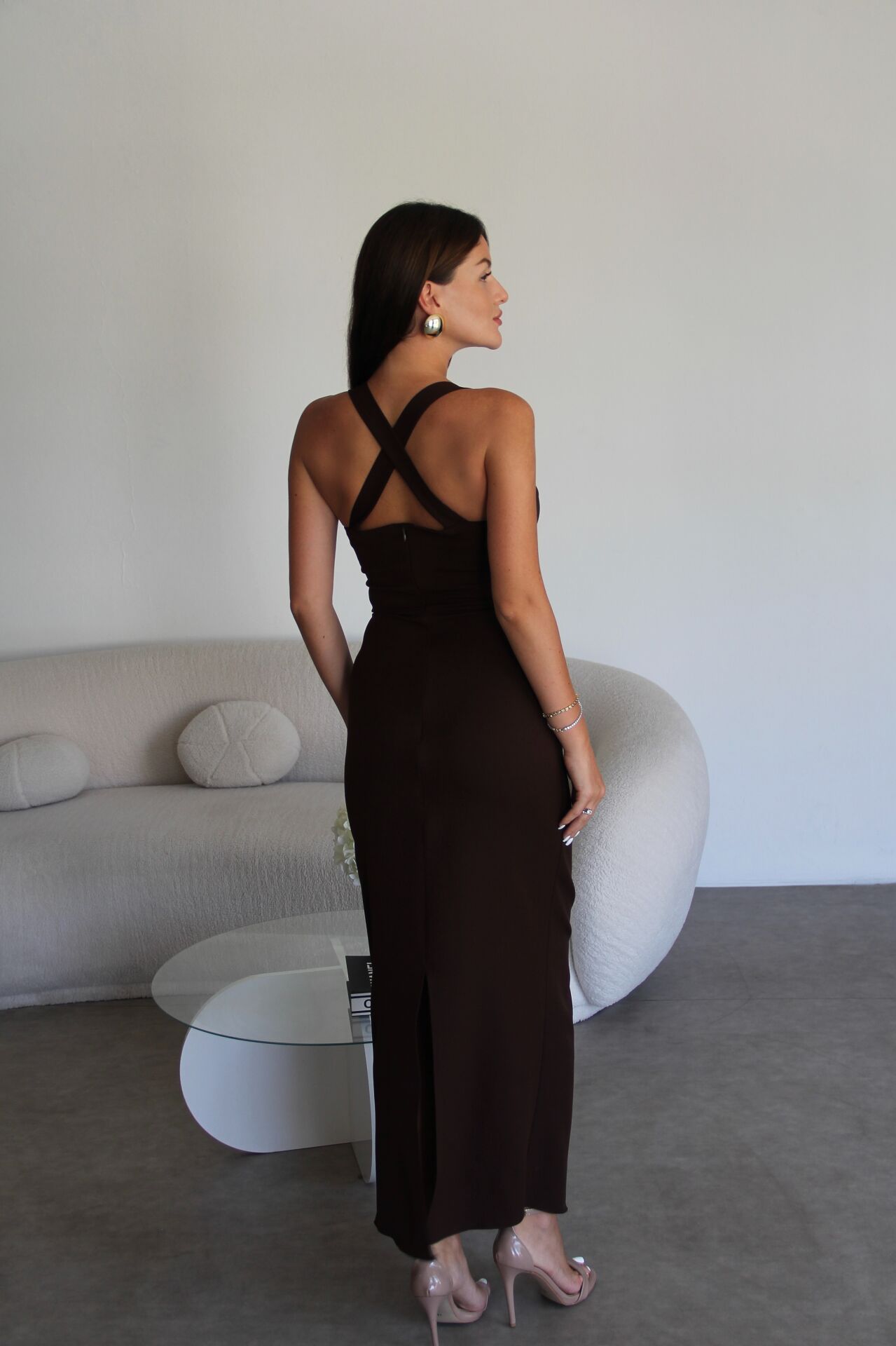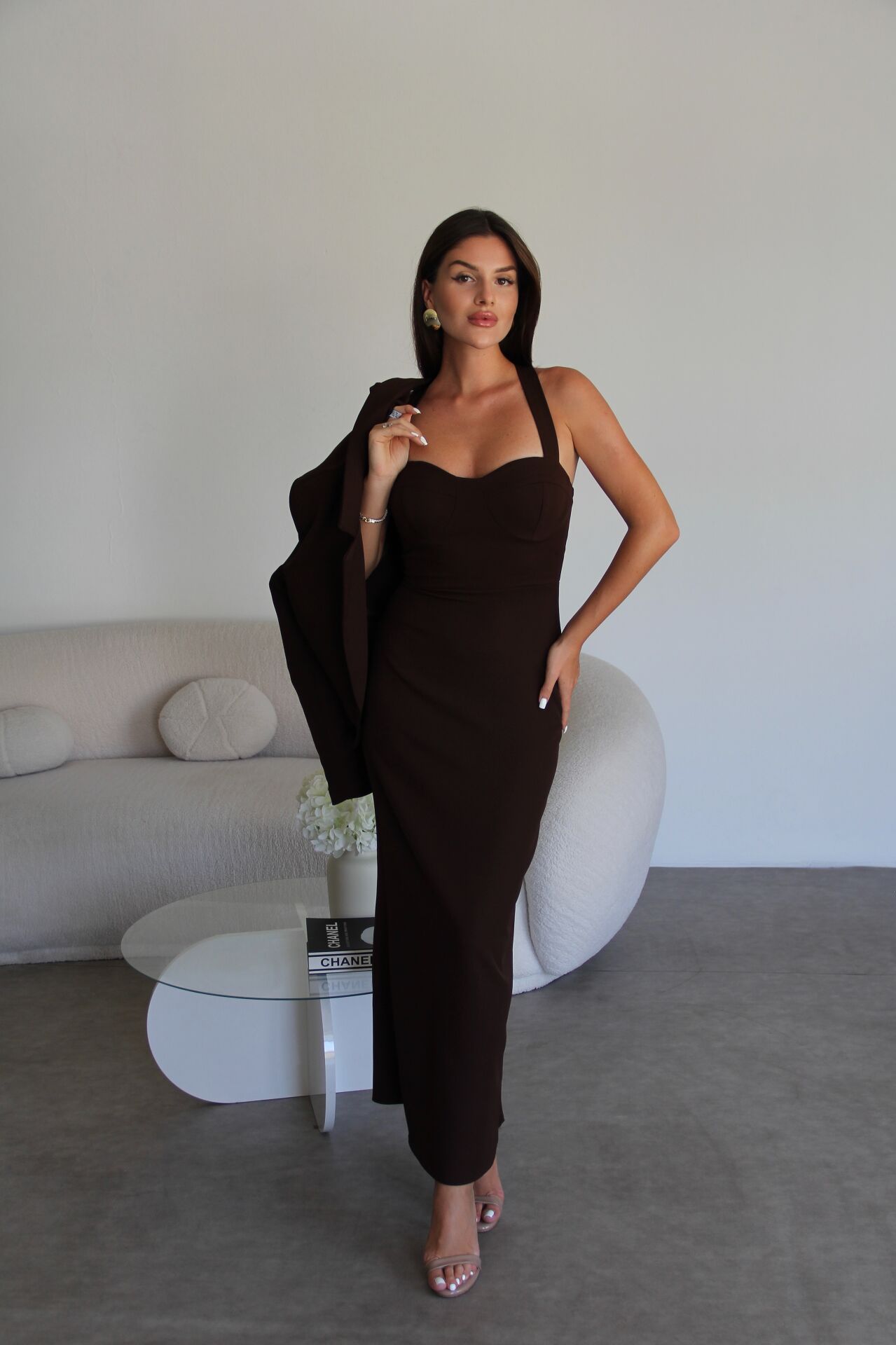 Kahve Askılı Elbise ve Kısa Crop Ceketli Alt Üst Premium Tasarım Takım