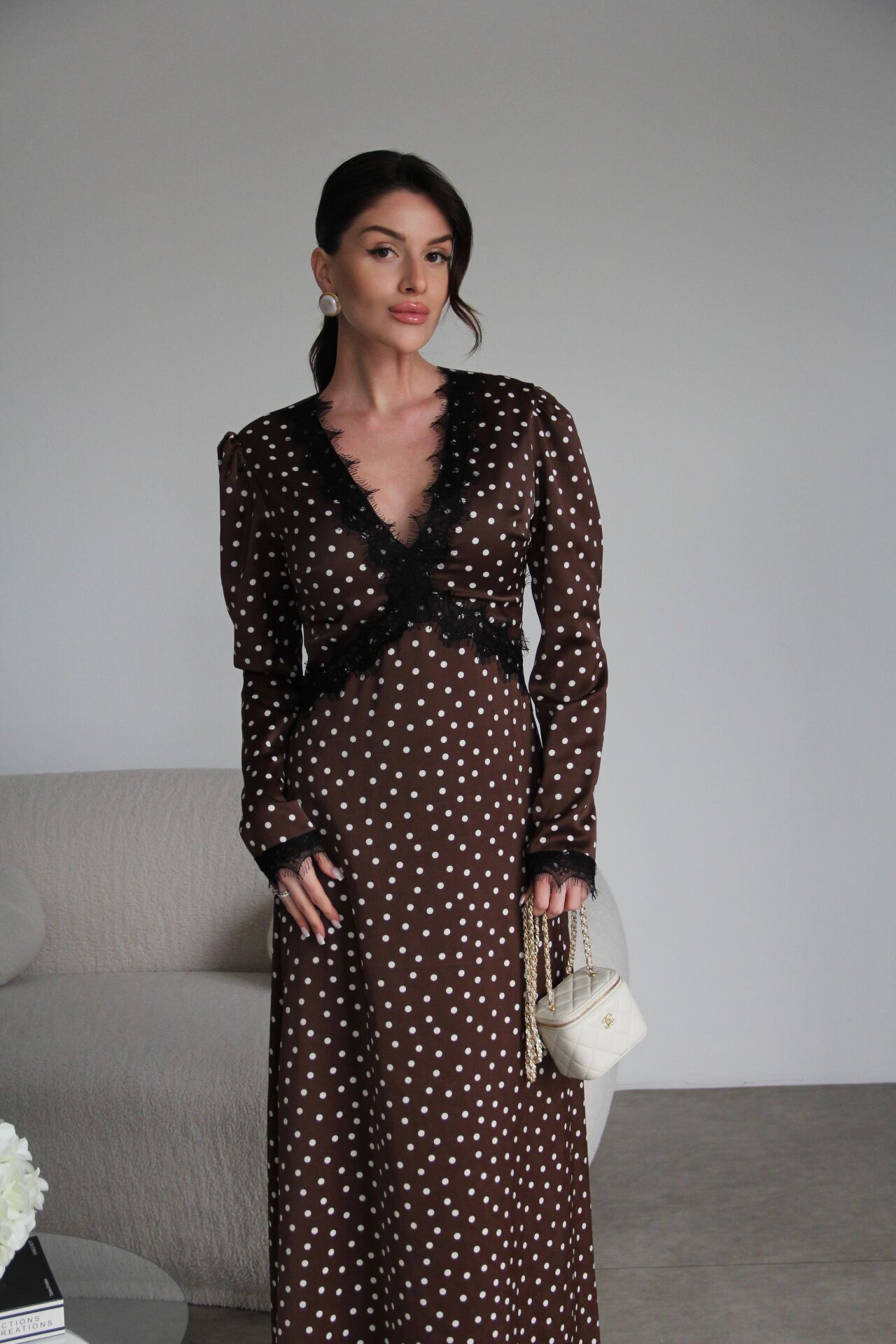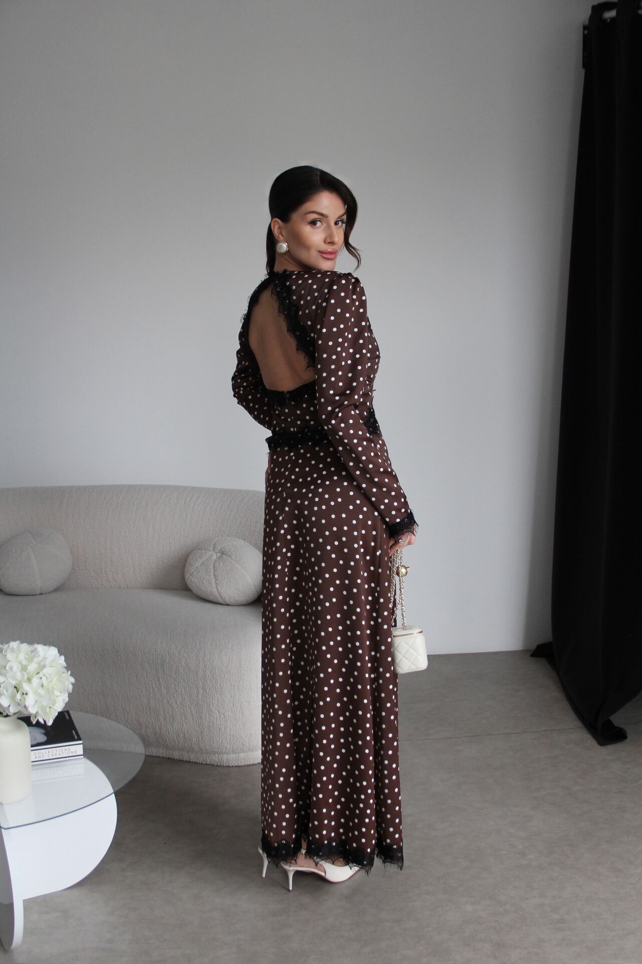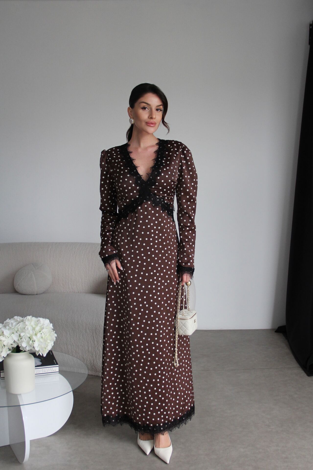 Kahve Dantel Detaylı Sırt Dekolteli Premium Maxi Uzun Puantiyeli Saten Elbise