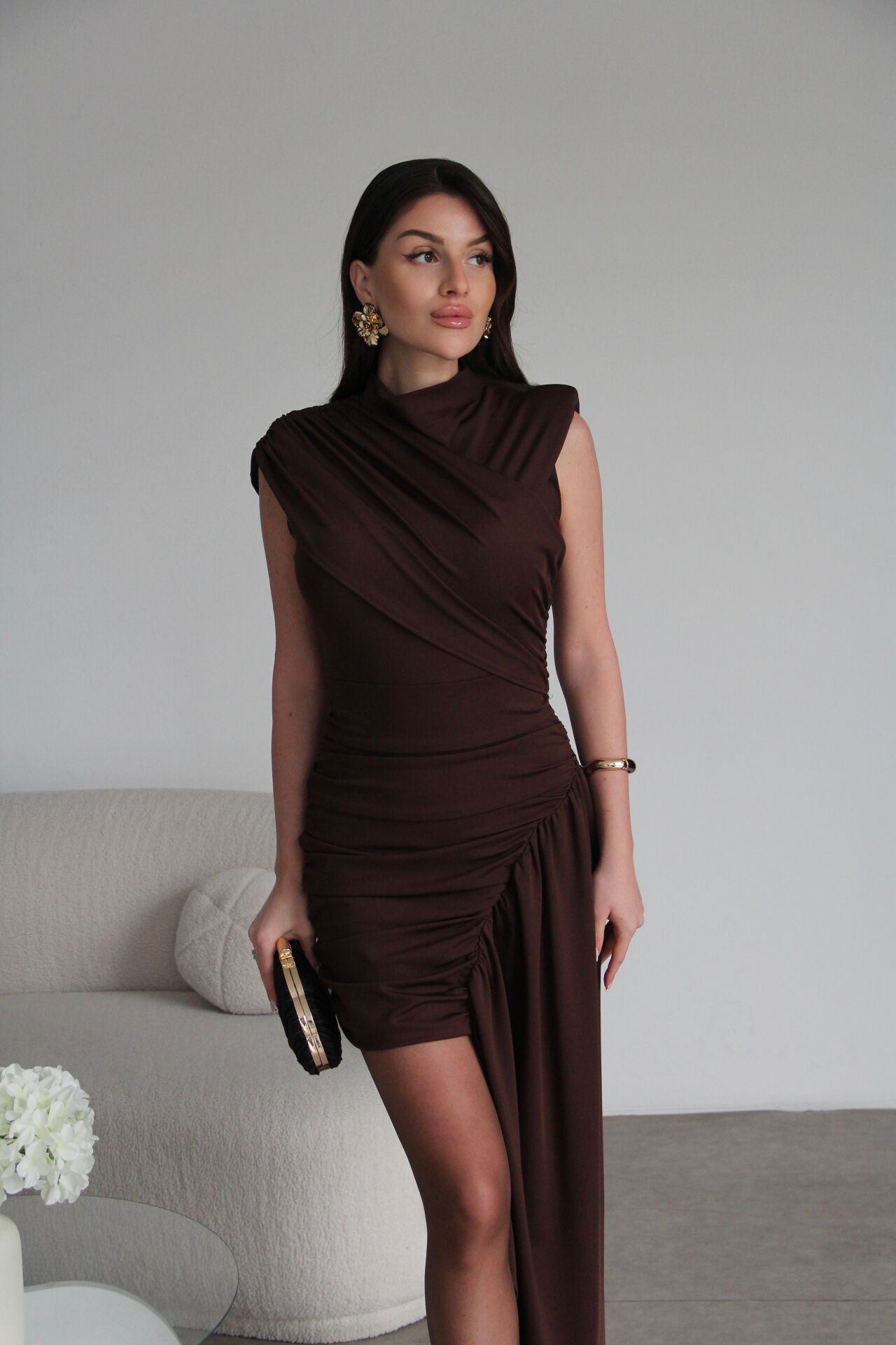 Kahve Dik Yaka Asimetrik Detaylı Vatkılı Maxi Uzun Premium Drapeli Elbise