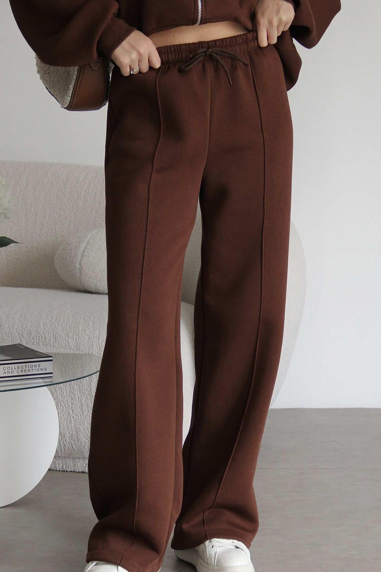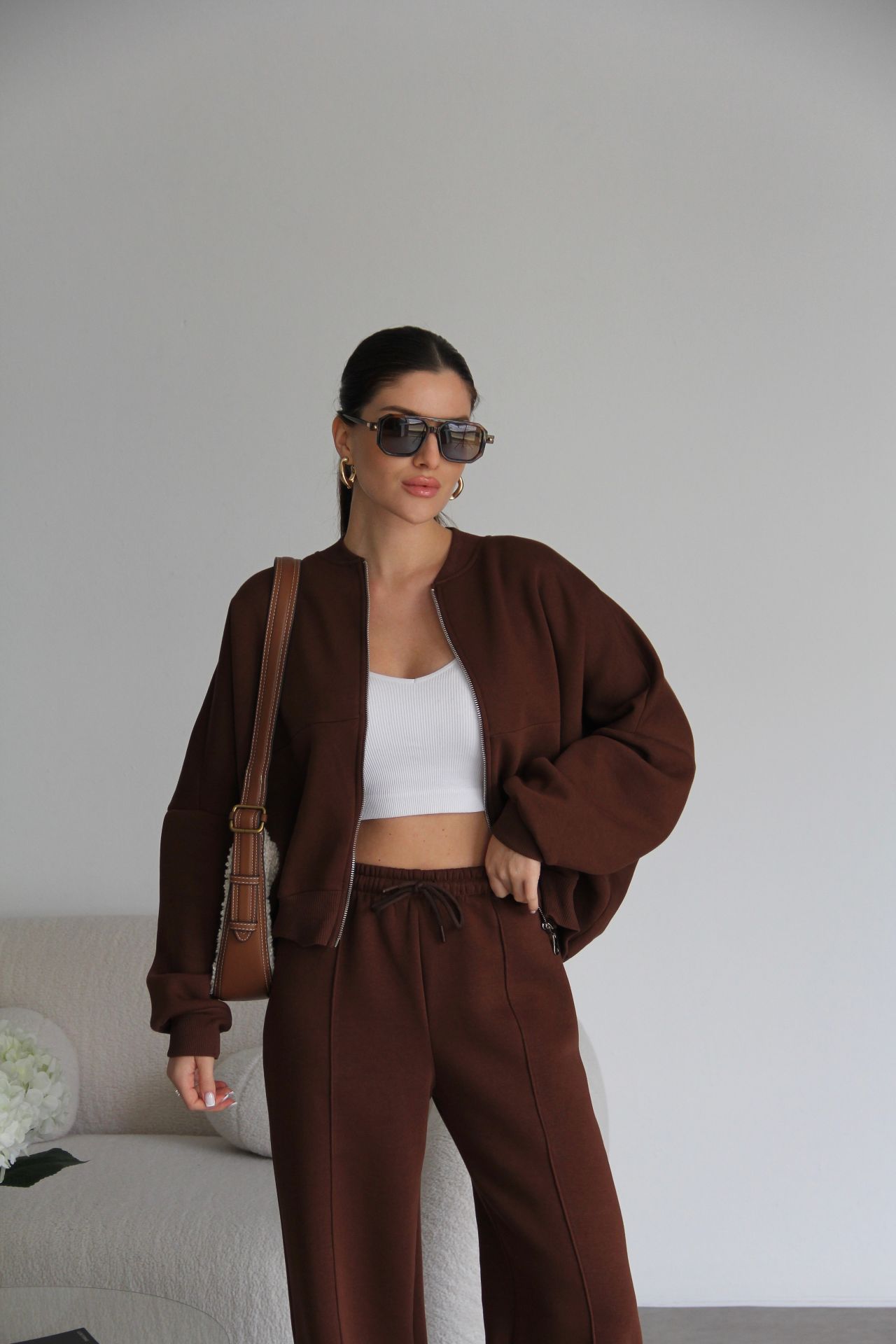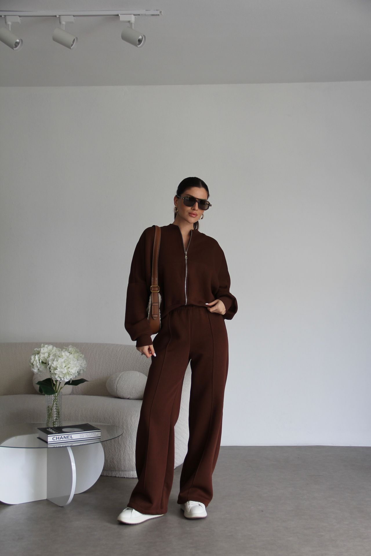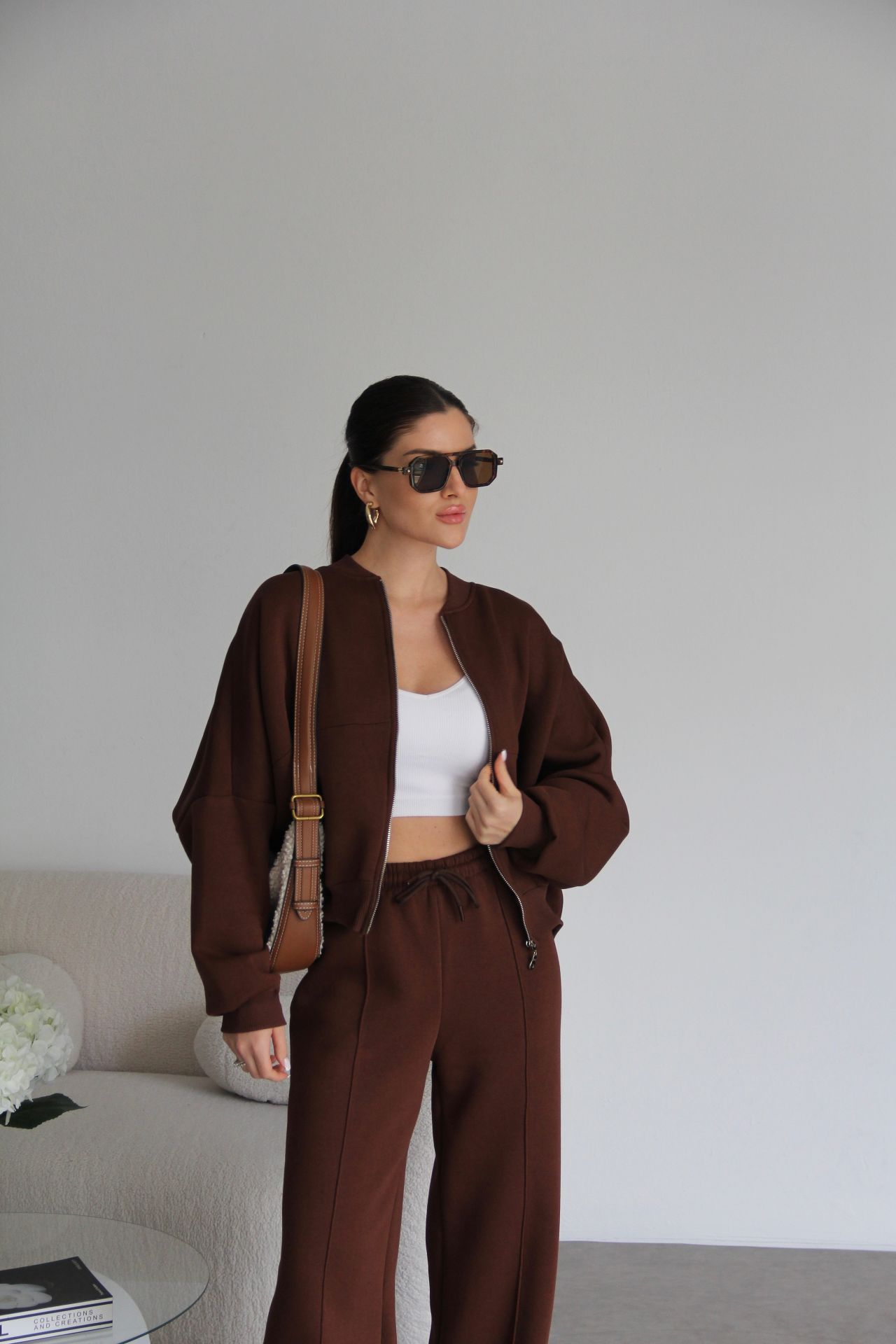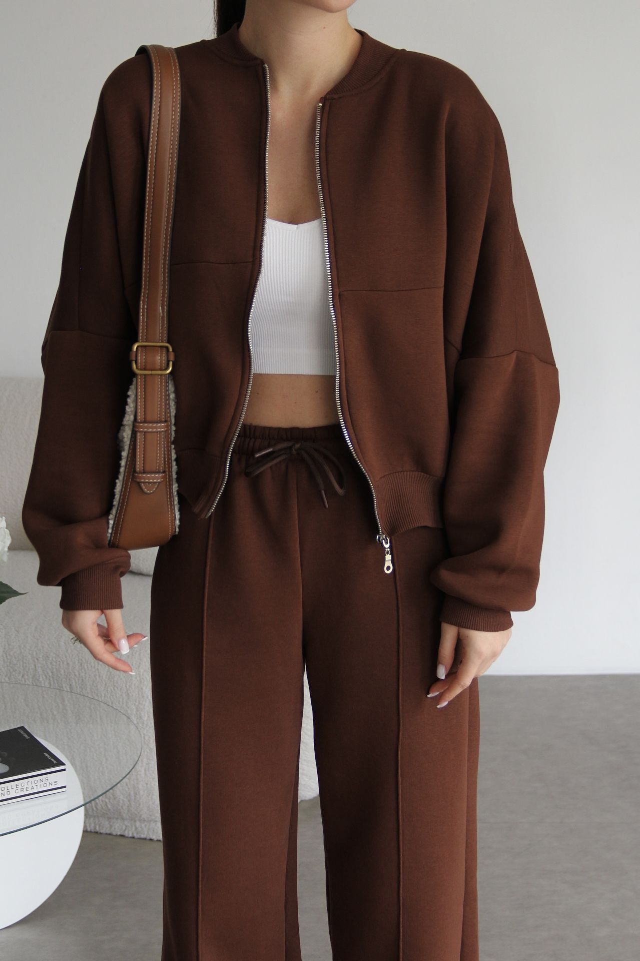 Kahve Fermuarlı Şardonlu Alt Üst Premium Eşofman Takımı