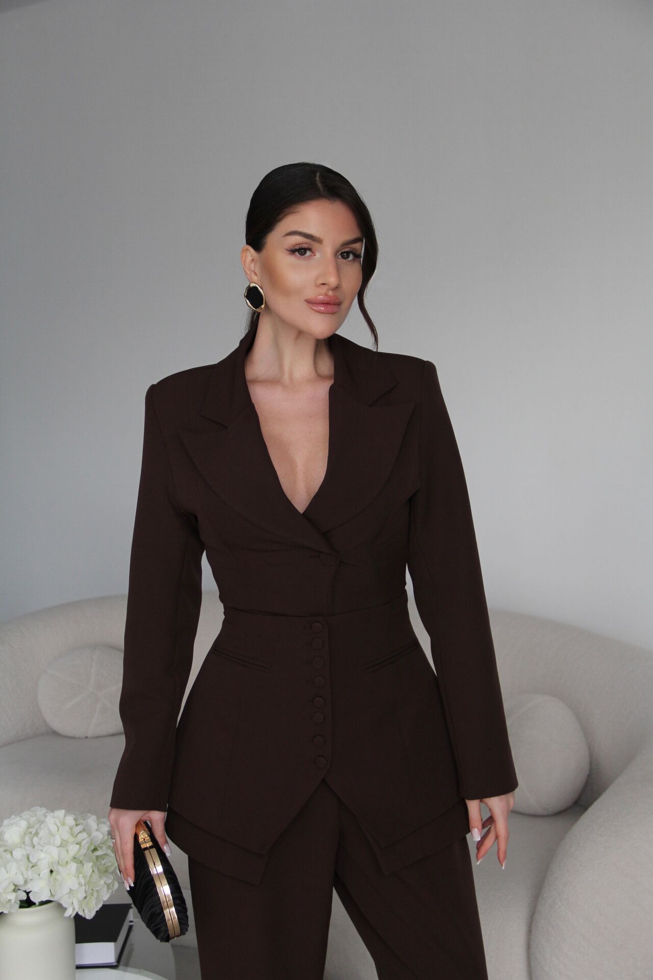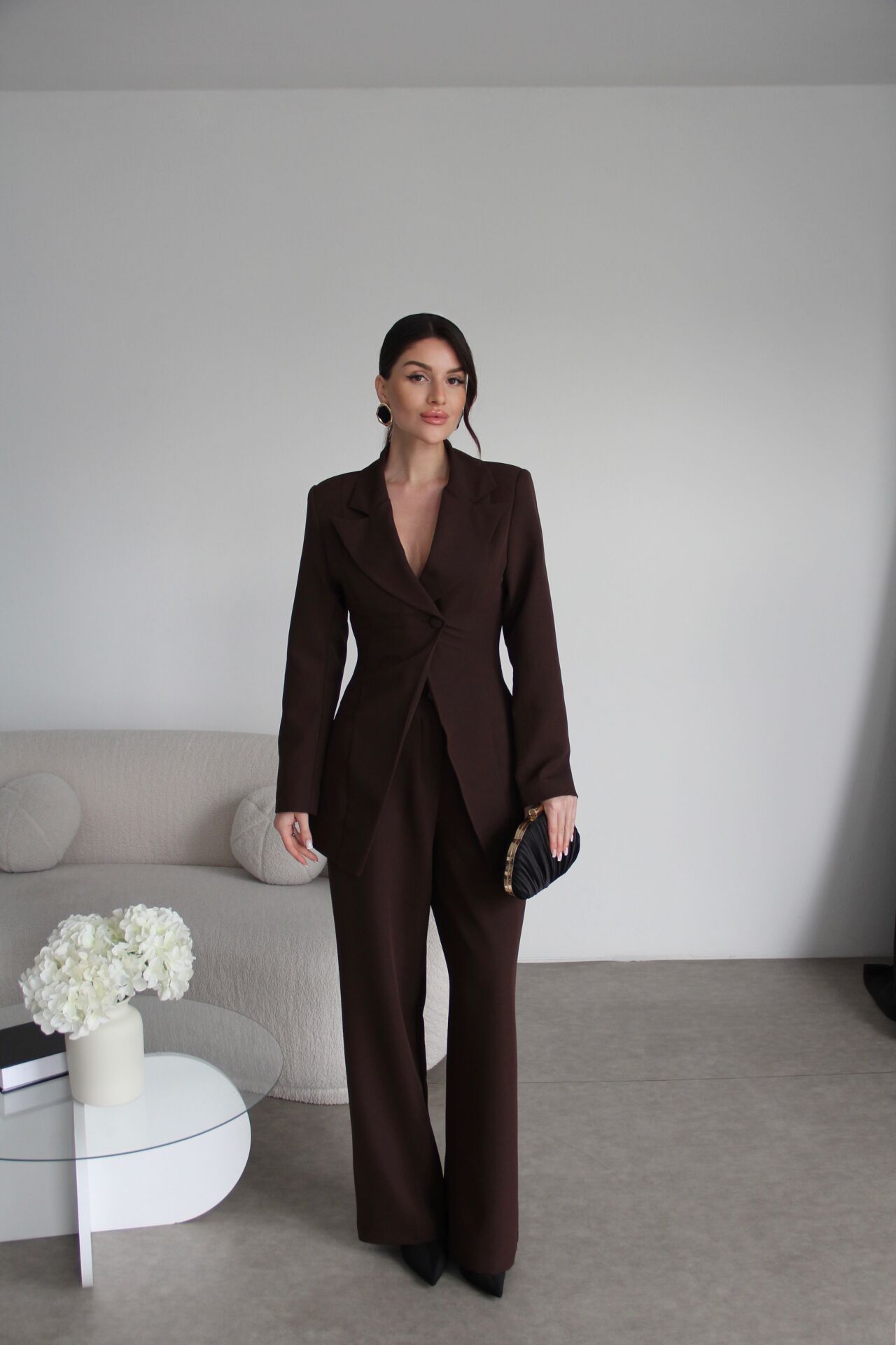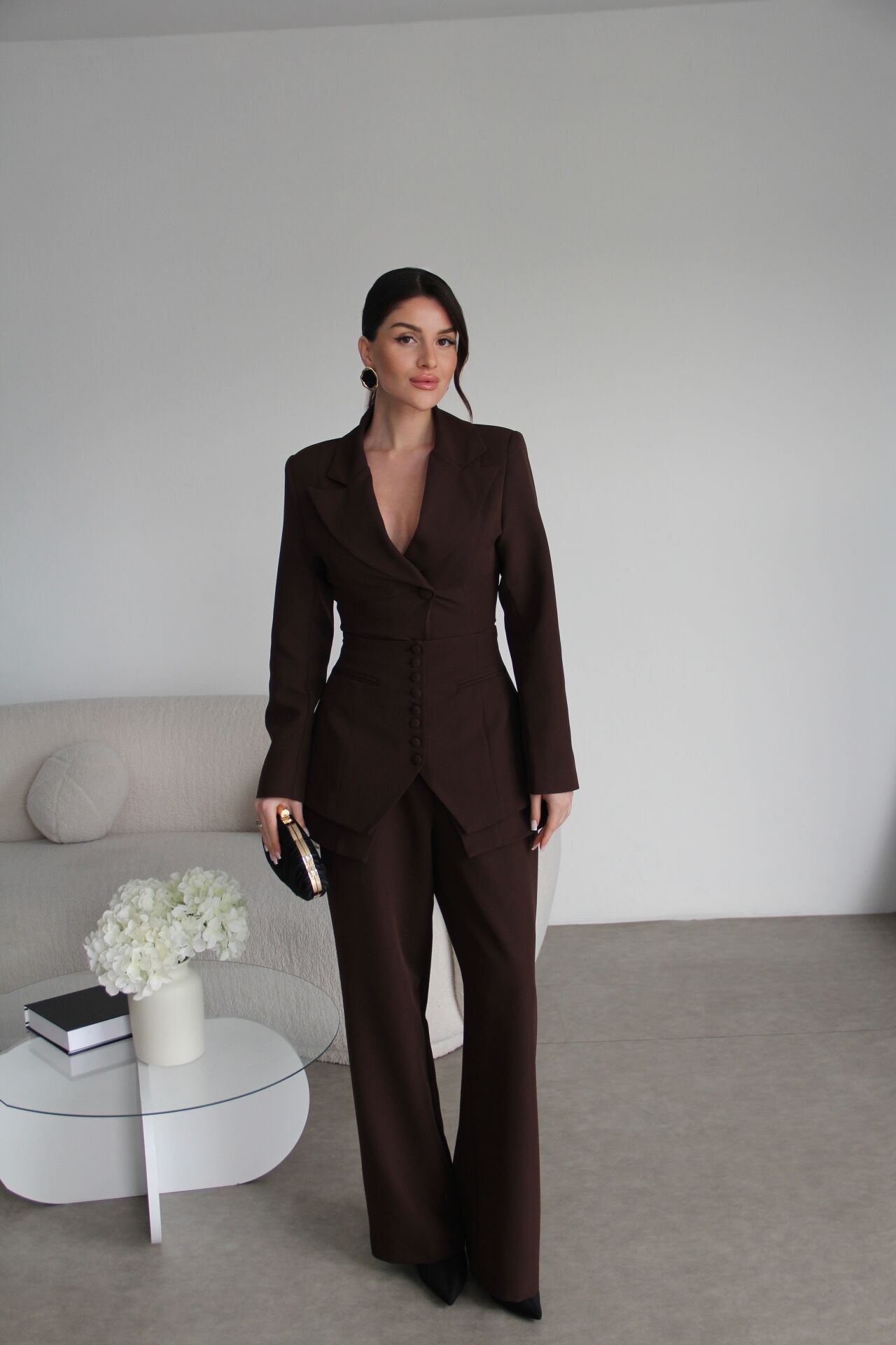 Zarif tasarımıyla dikkat çeken korseli tek düğmeli ceket ve palazzo pantolon, özel günlerinizde şıklığınızı tamamlar.