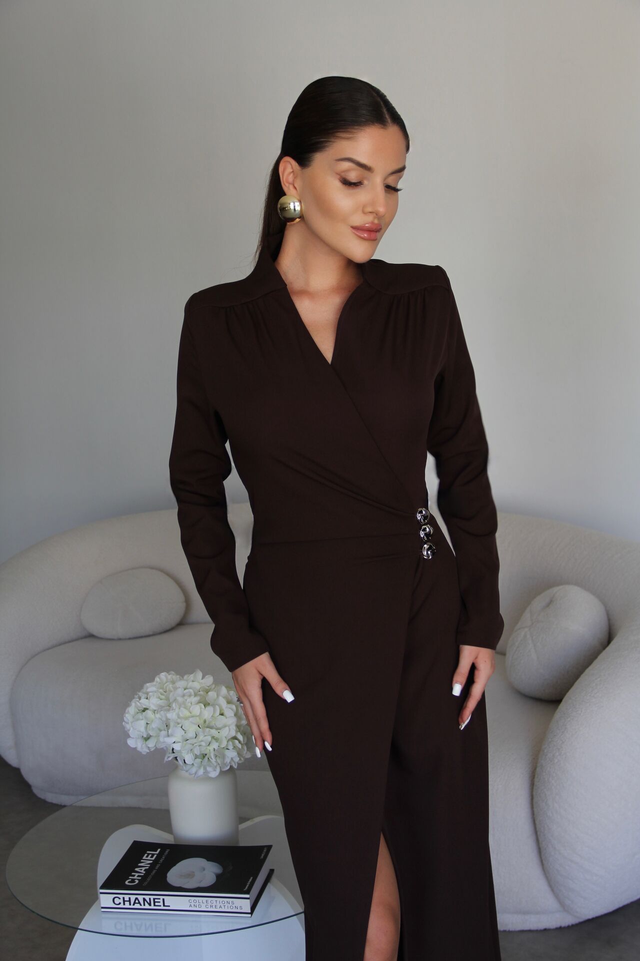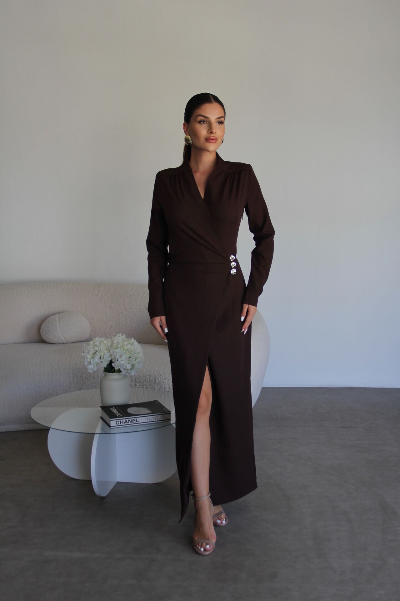 Kahve Kruvaze Yaka Drapeli Gold Düğme Detaylı Uzun Premium Elbise