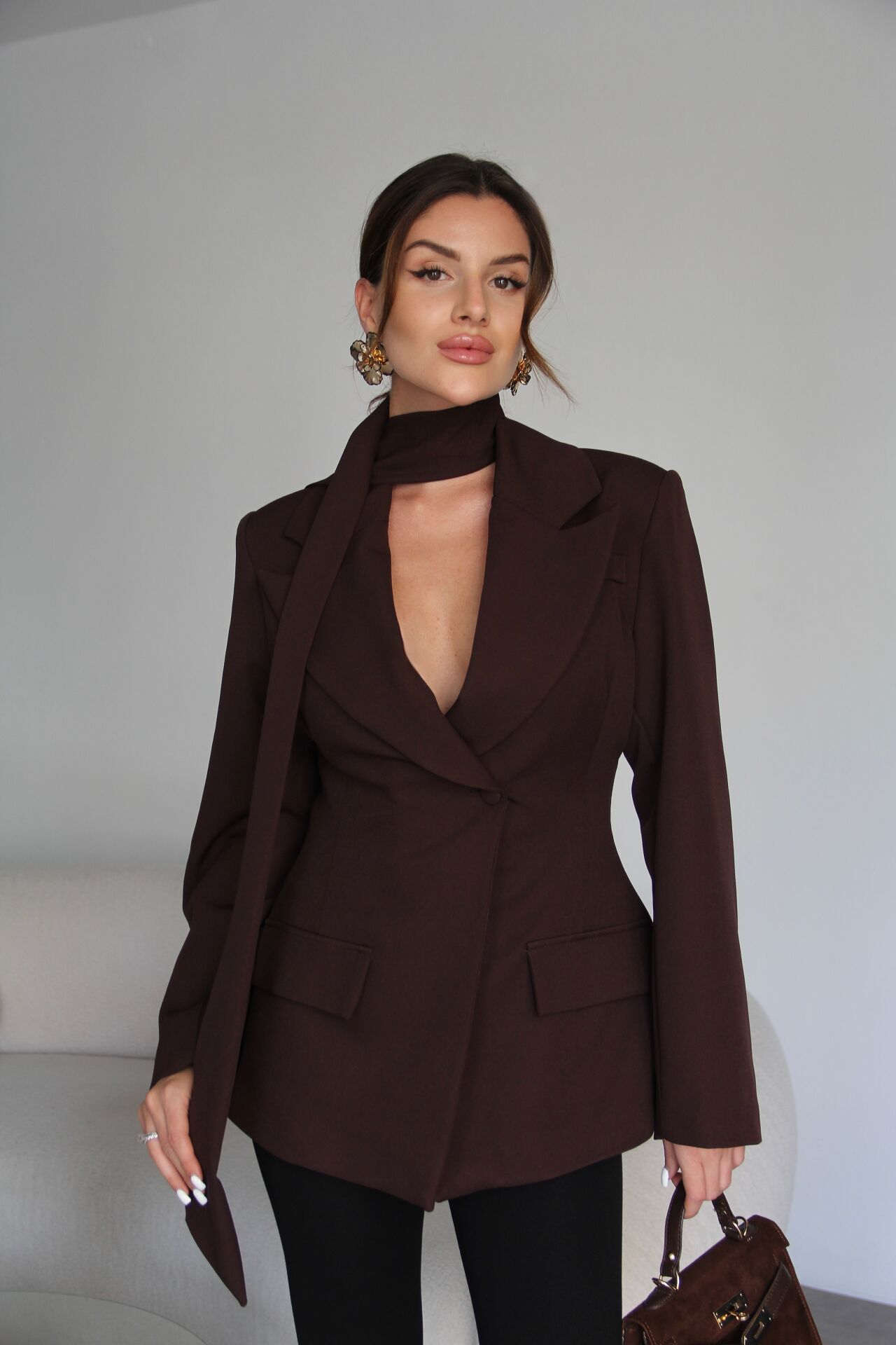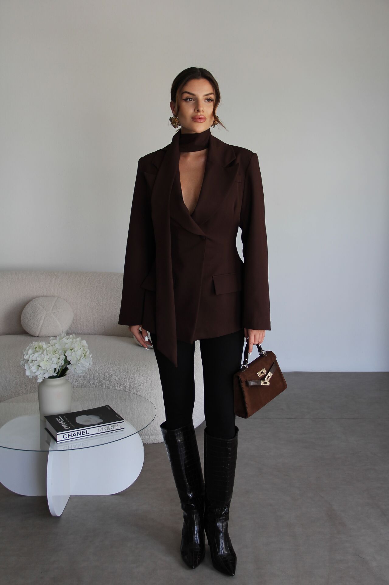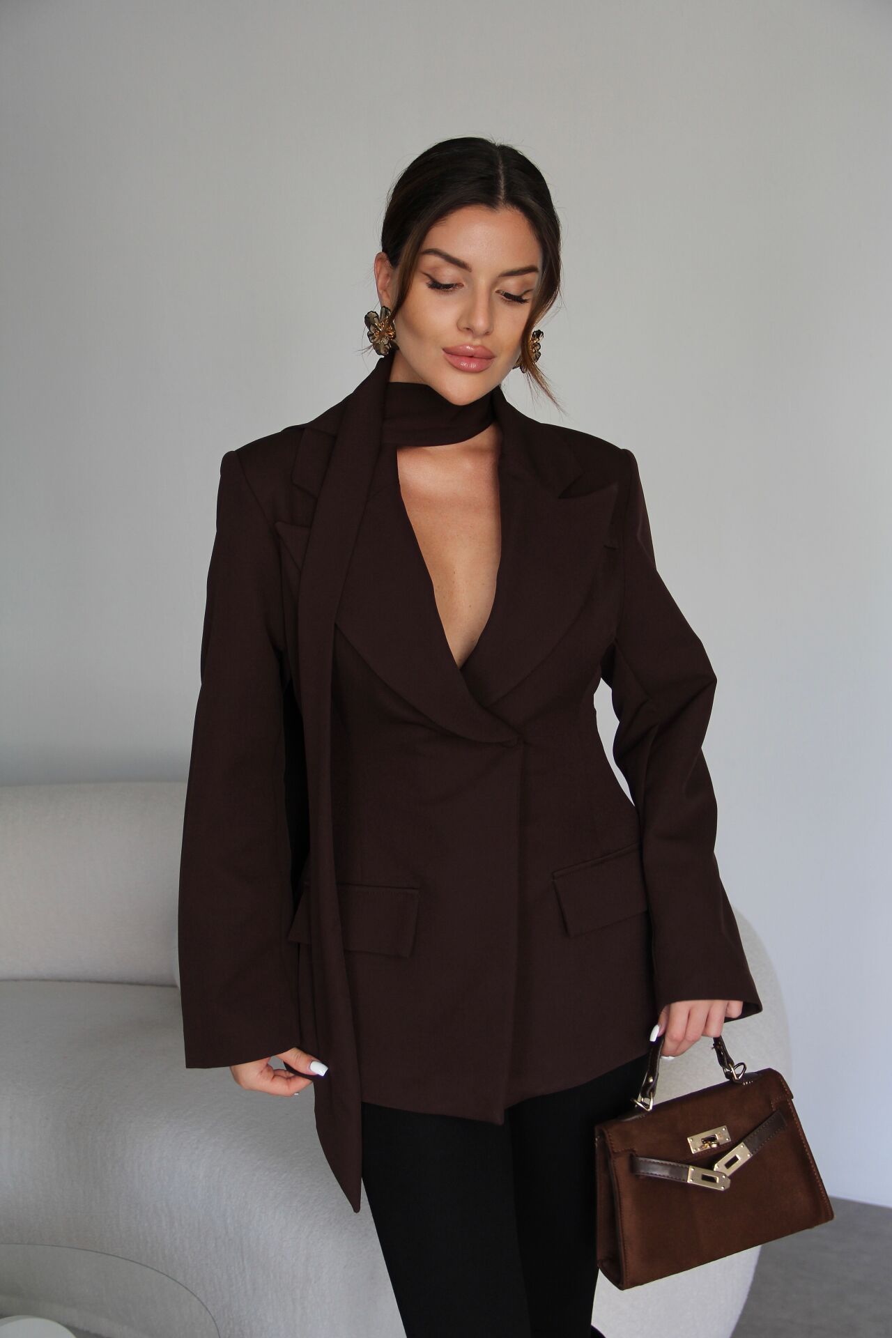 Kahve Şal Detaylı Astarlı Premium Tasarım Kruvaze Ceket