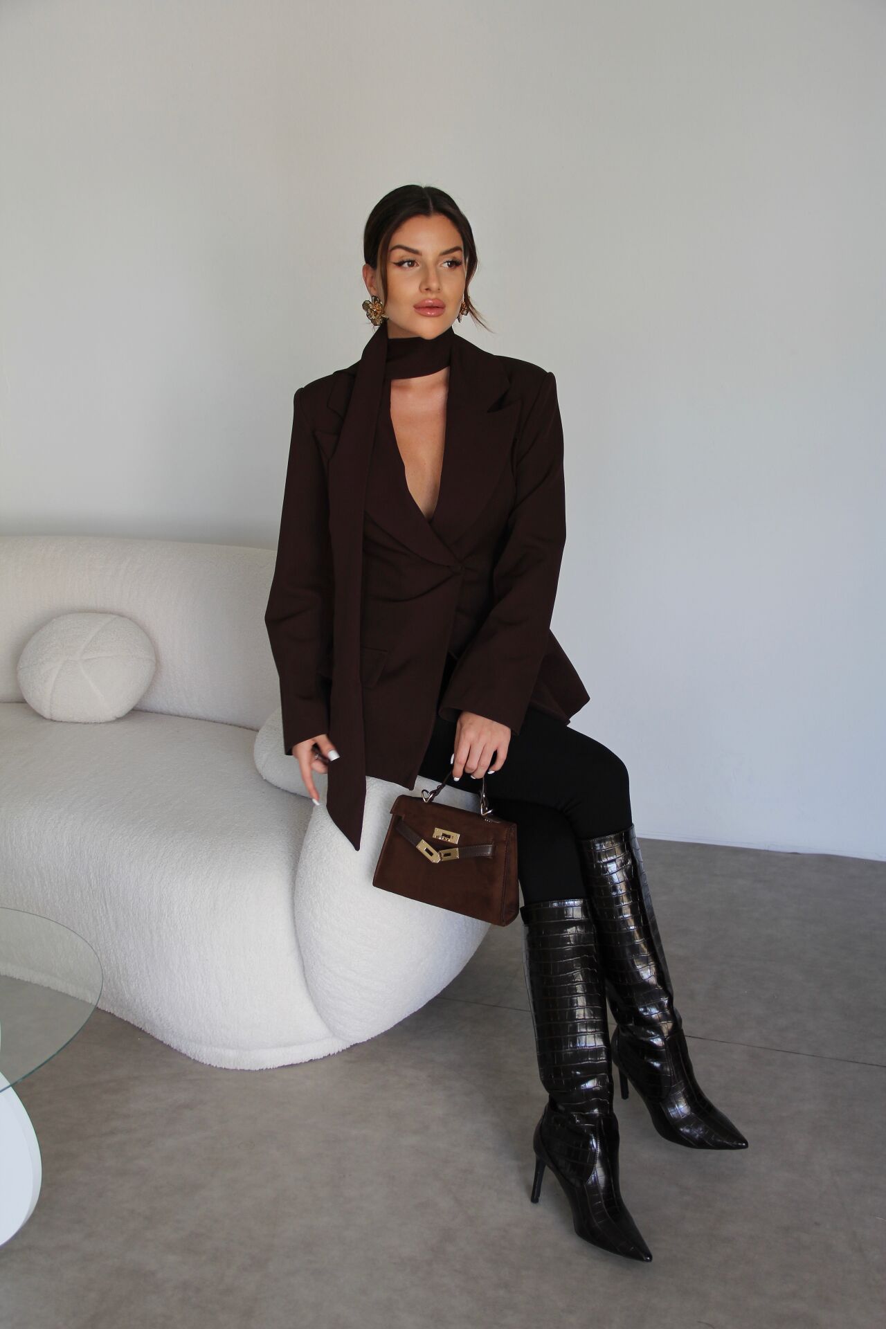 Kahve Şal Detaylı Astarlı Premium Tasarım Kruvaze Ceket (Ön Sipariş:17:11)