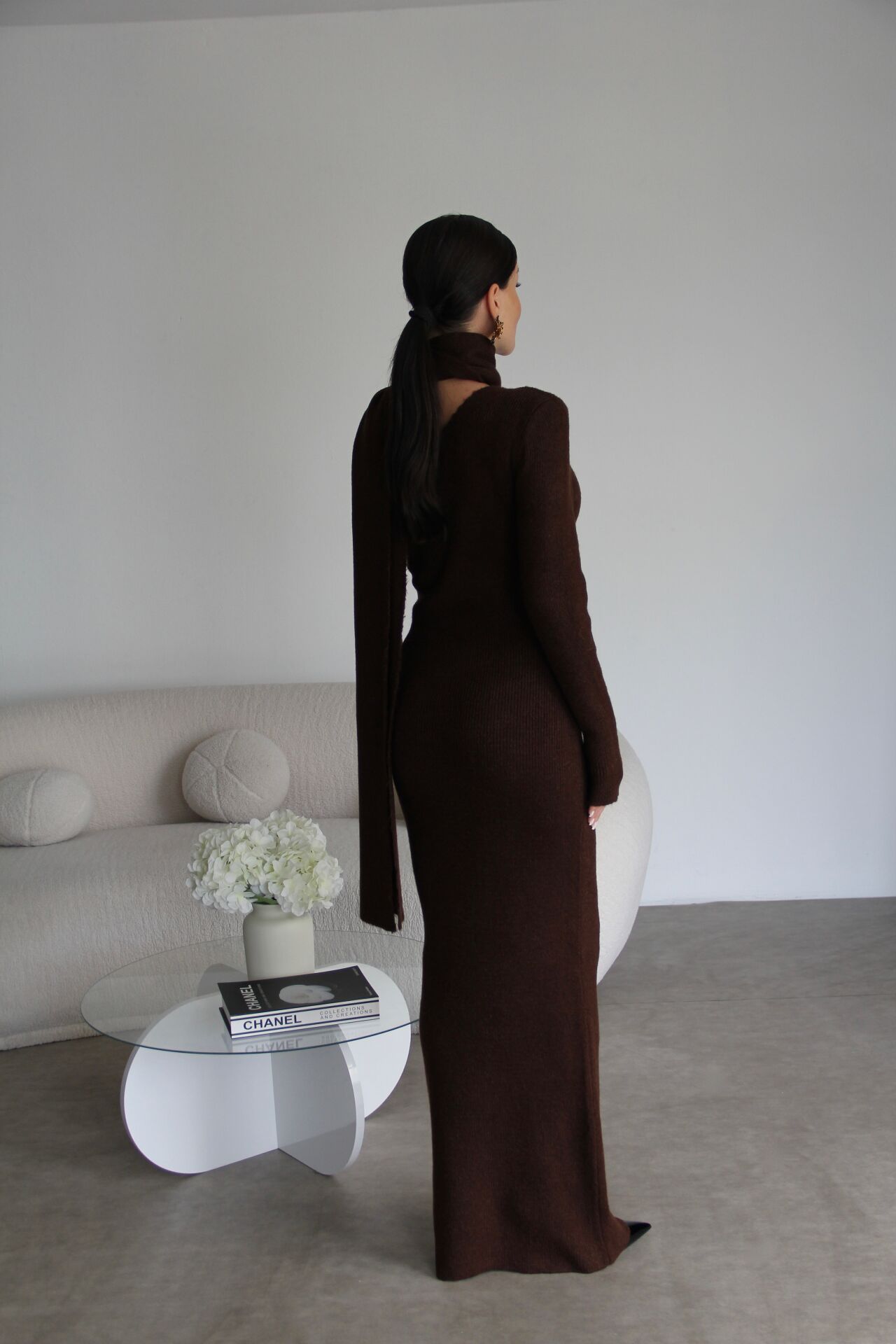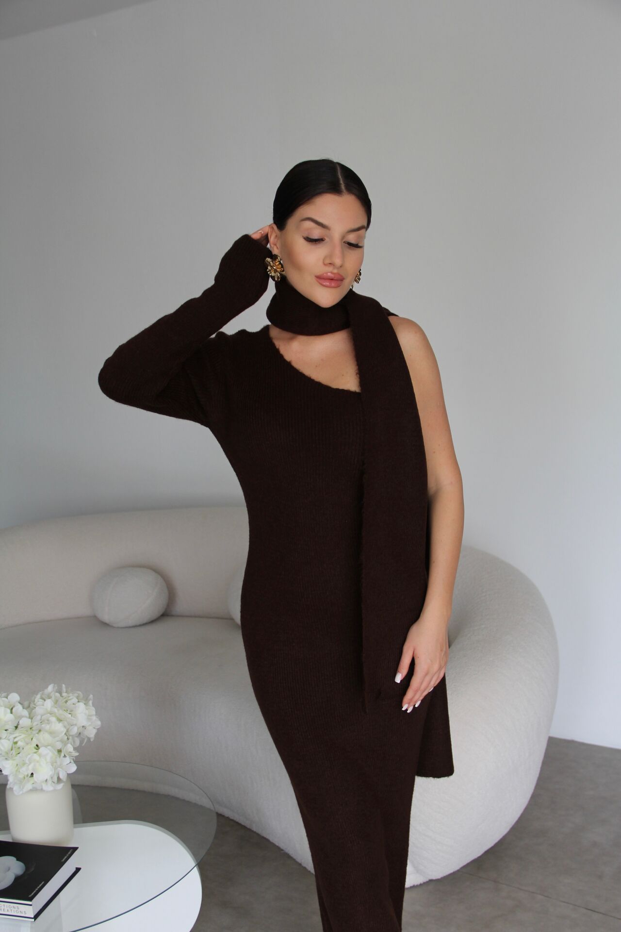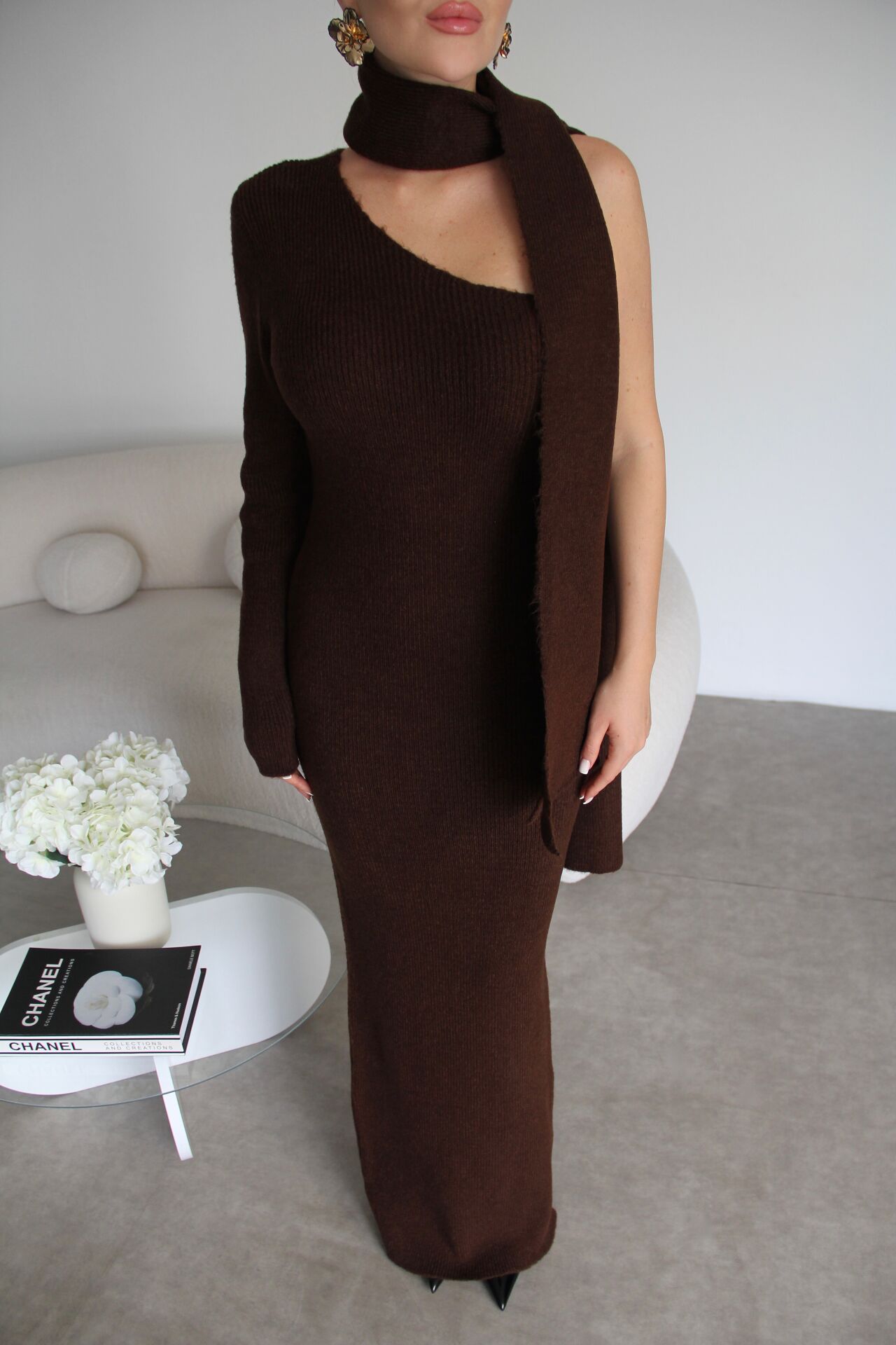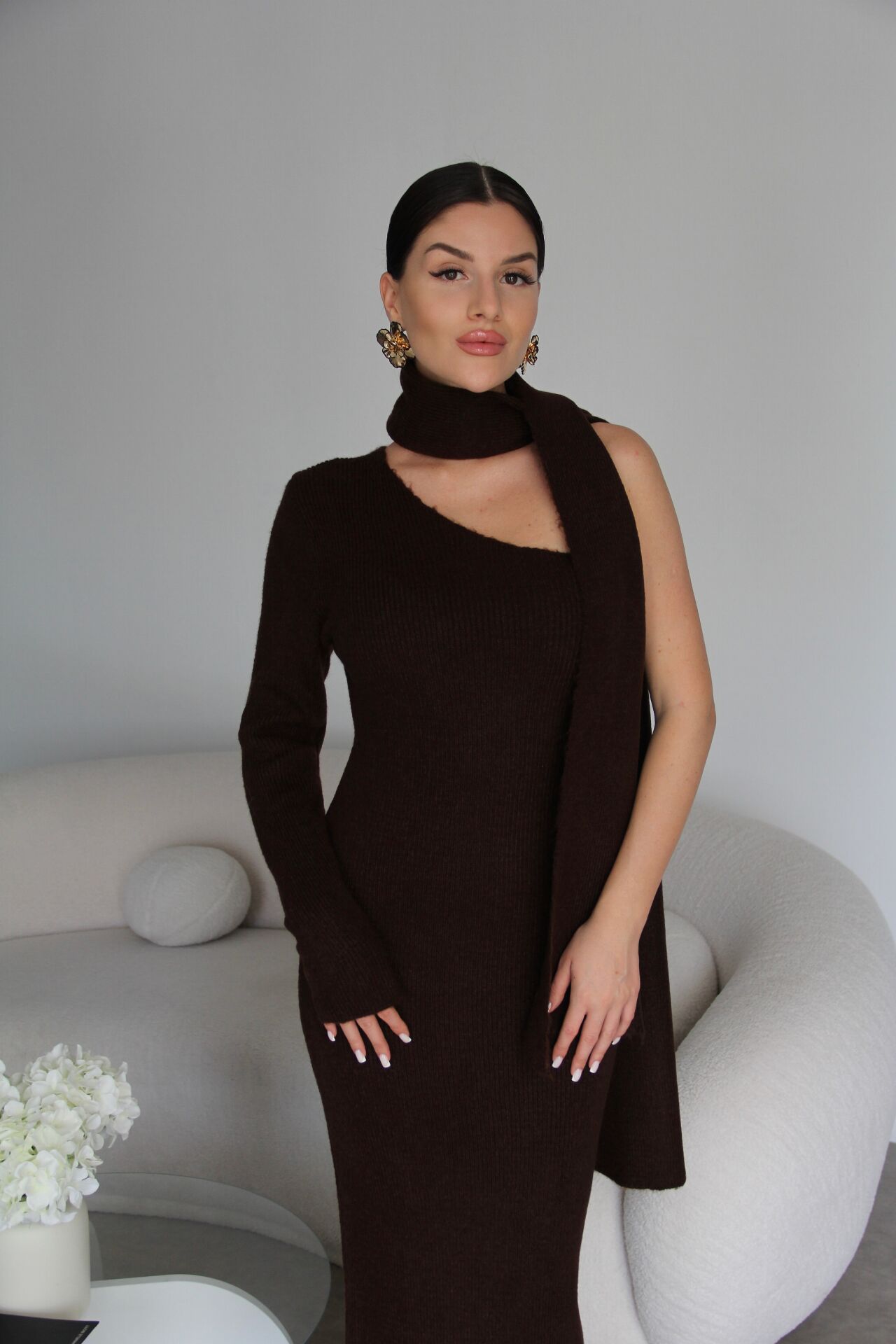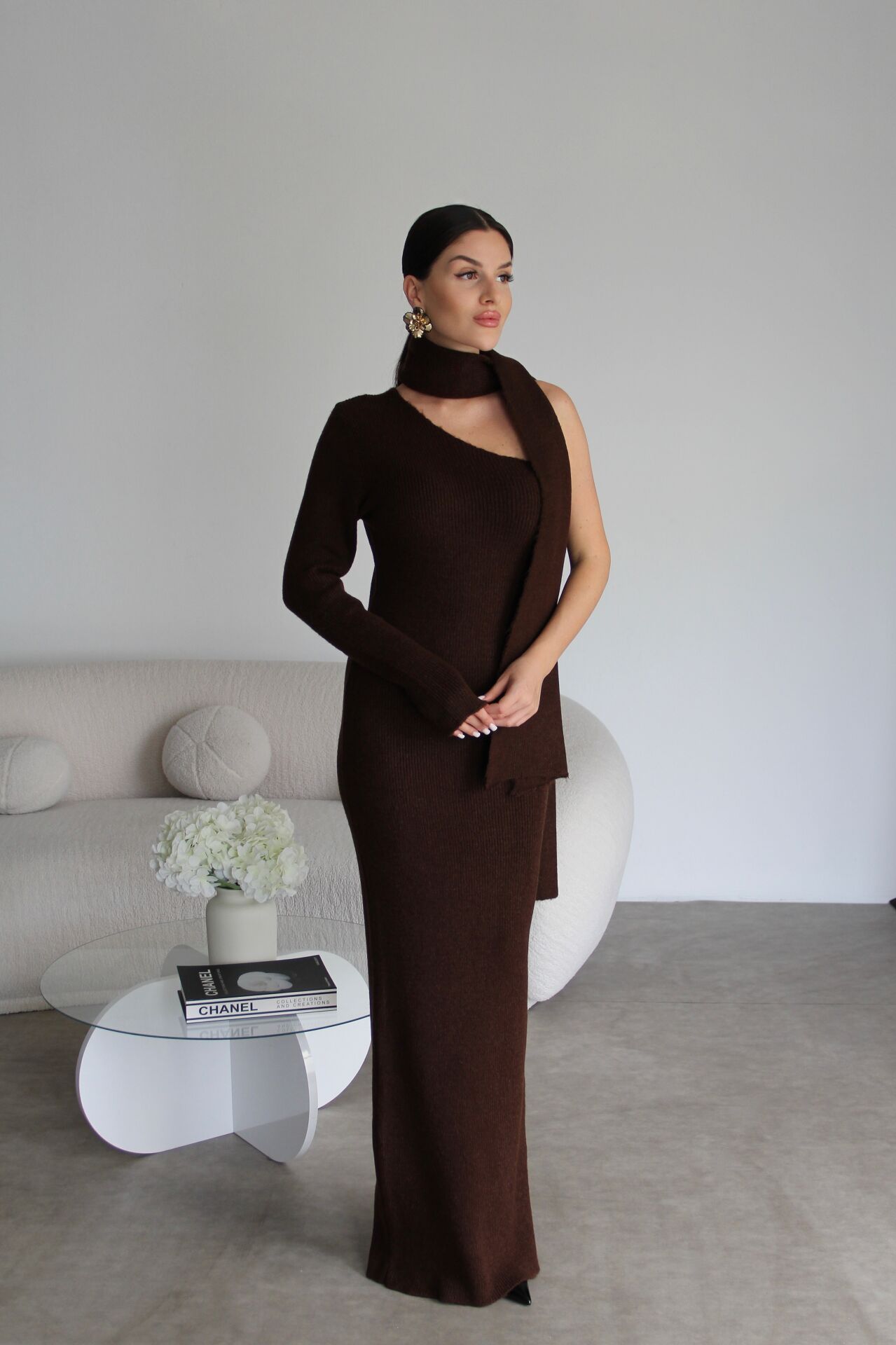 Kahve Şal Detaylı Tek Omuz MAXİ UZUN Triko Yün Elbise