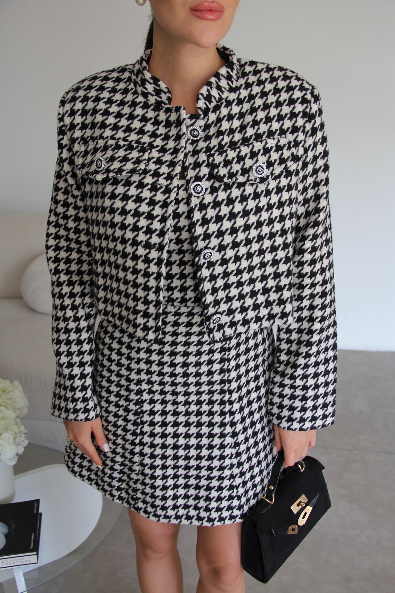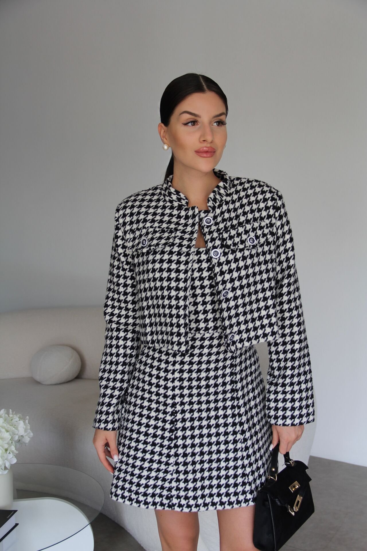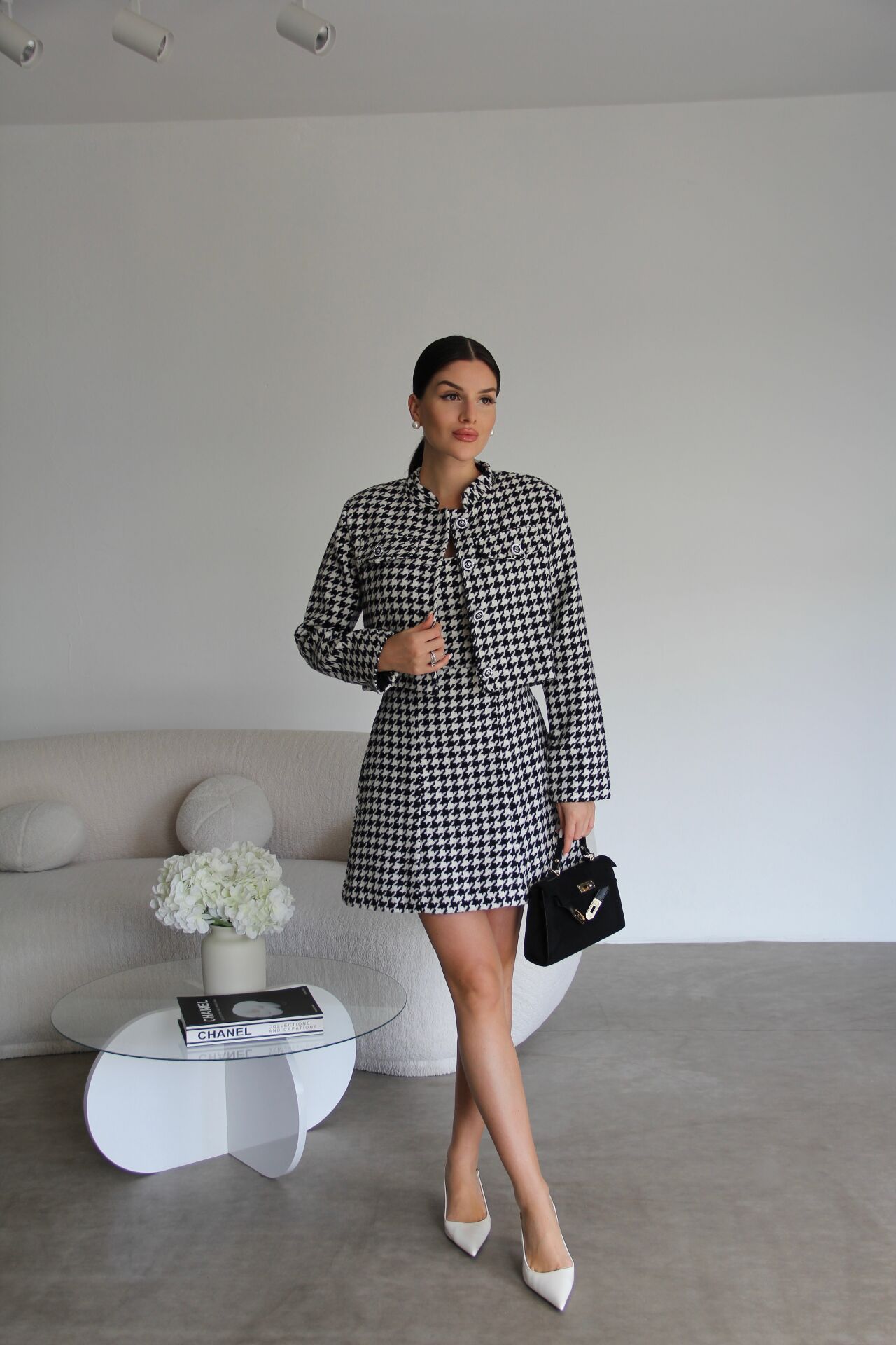 Kaz Ayağı Deseni Askılı Mini Elbise ve Kısa Crop Ceketli Premium Tüvit Takım