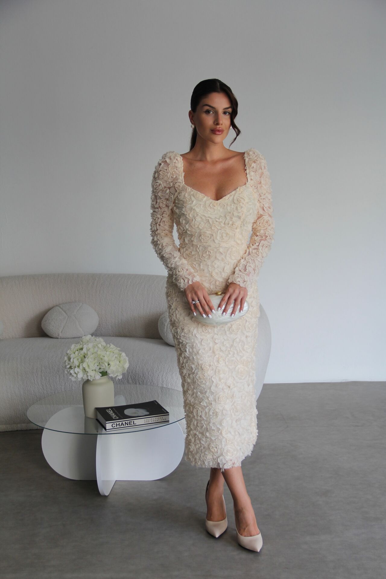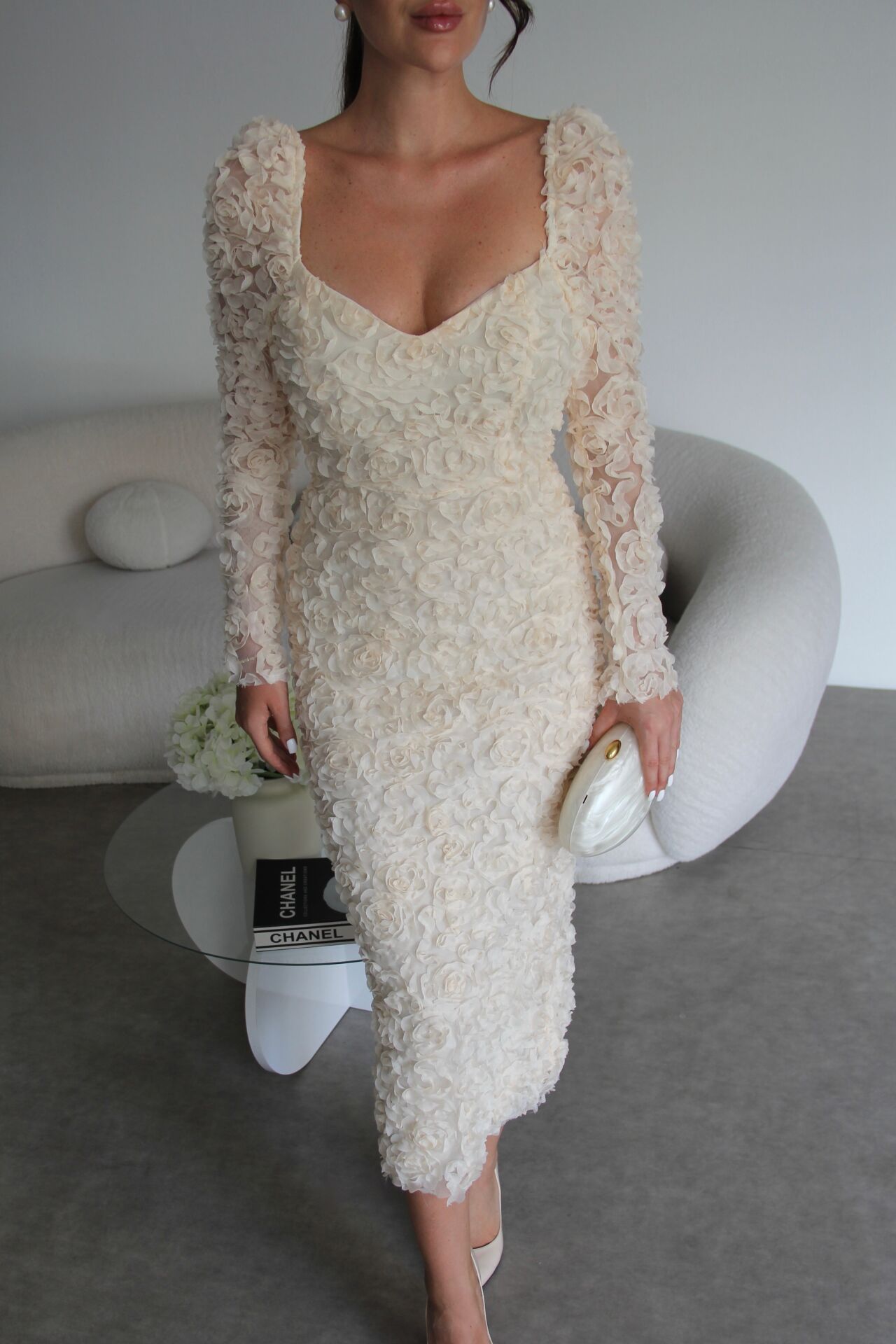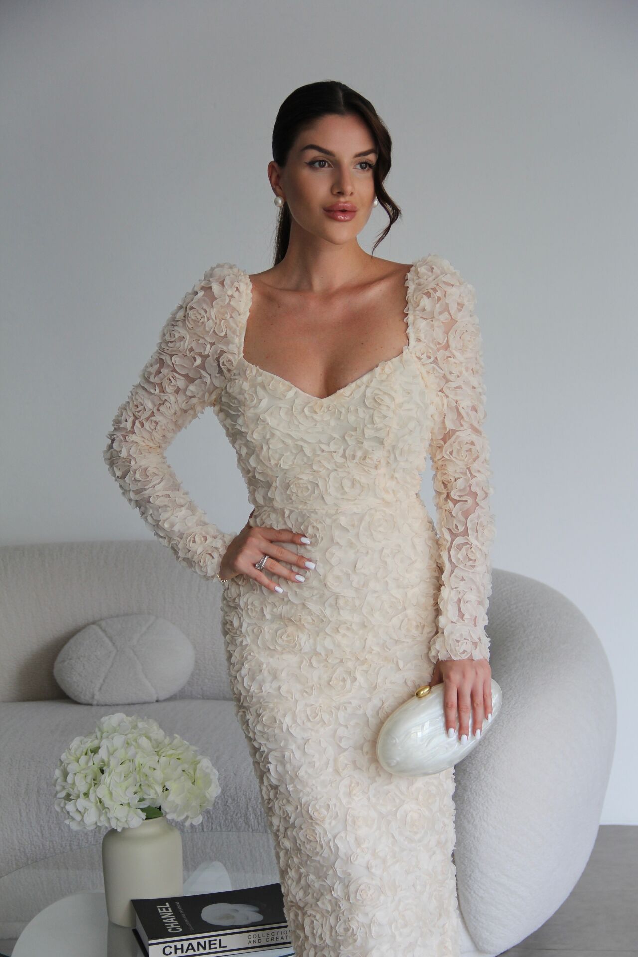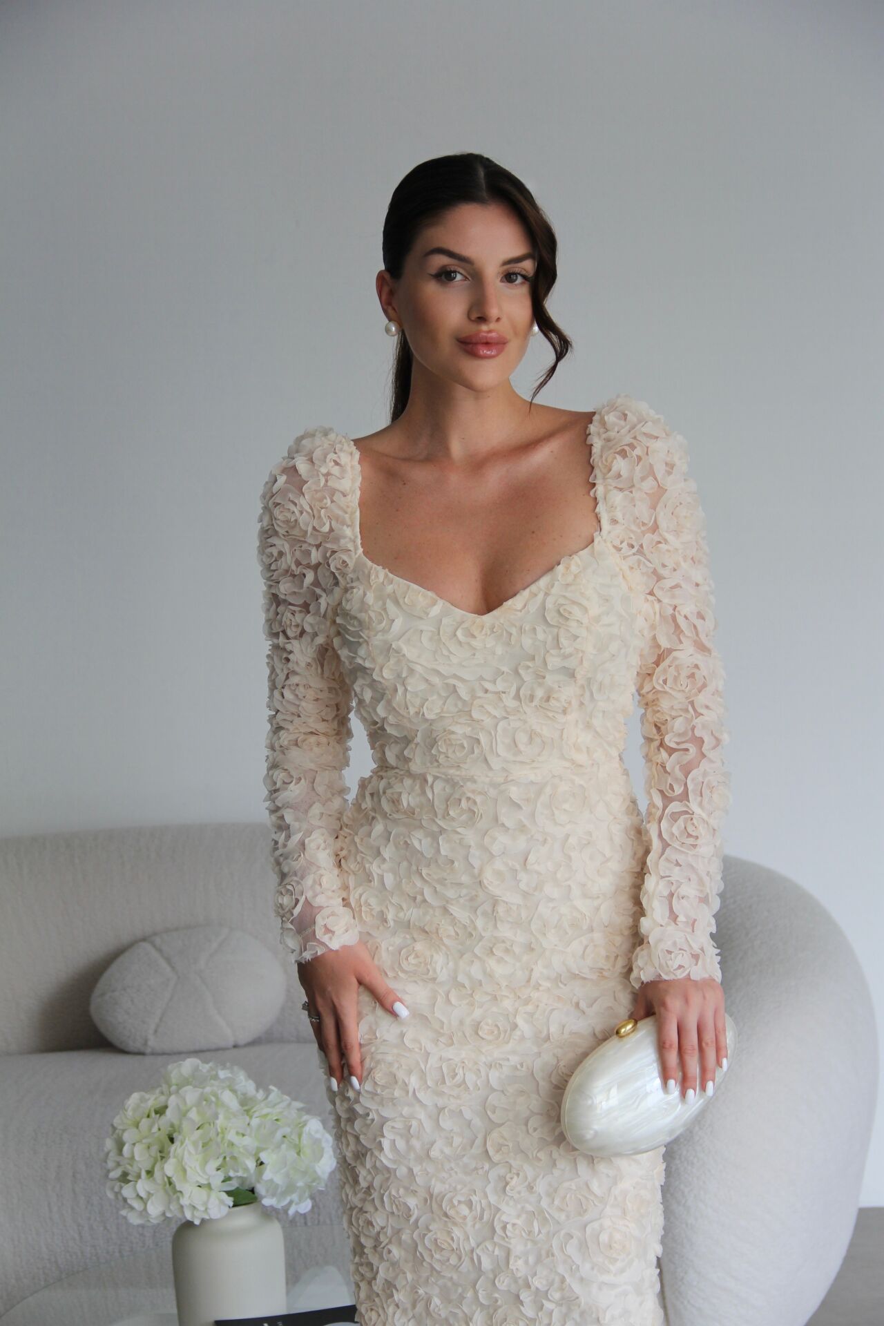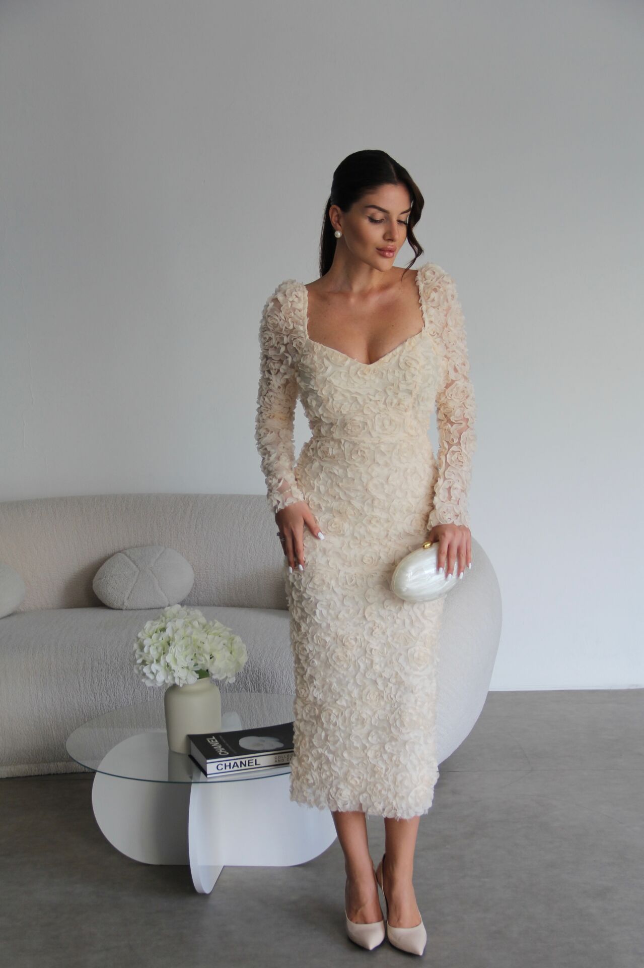 - Julidress Çok Yüksek Kalite DAR KESİM Krem 3 Boyutlu Gül Desenli Straplez Yaka Astarlı Premium Tasarım Elbise