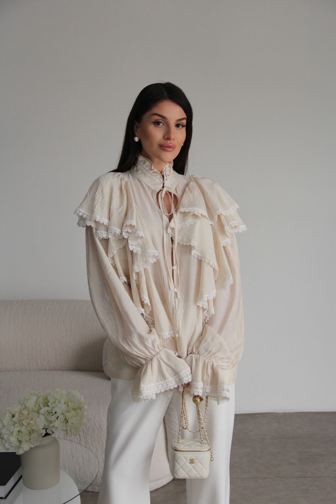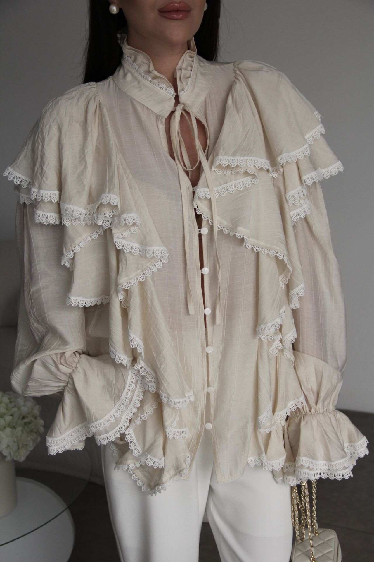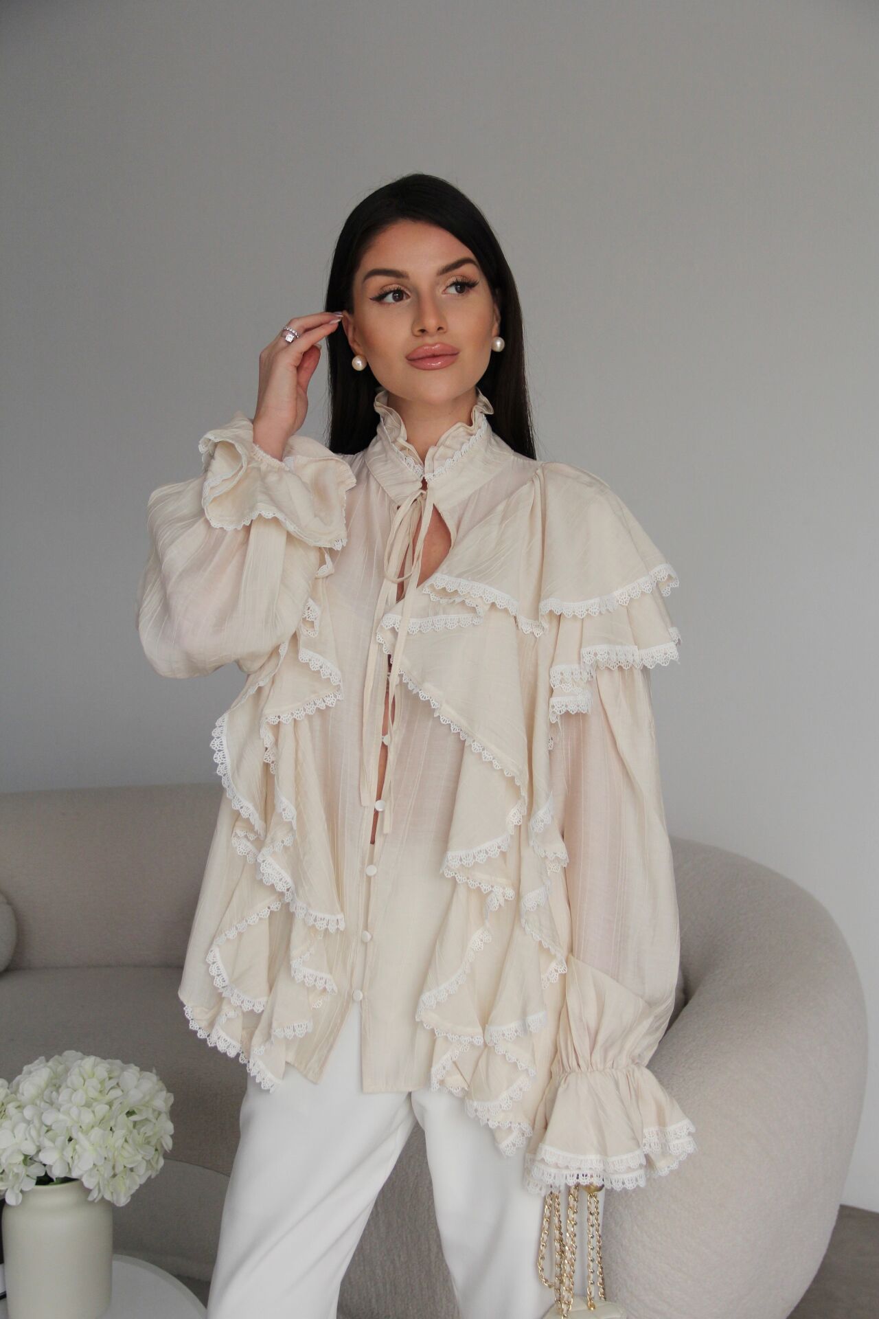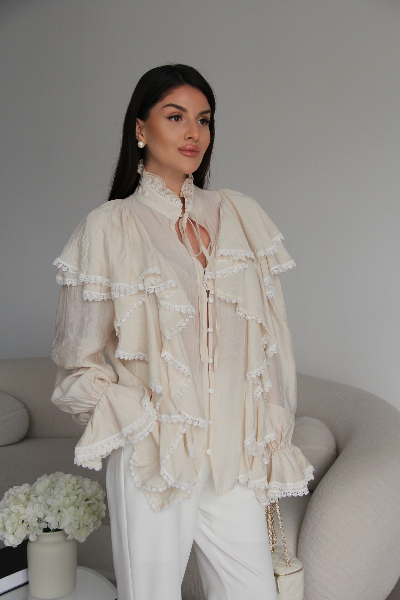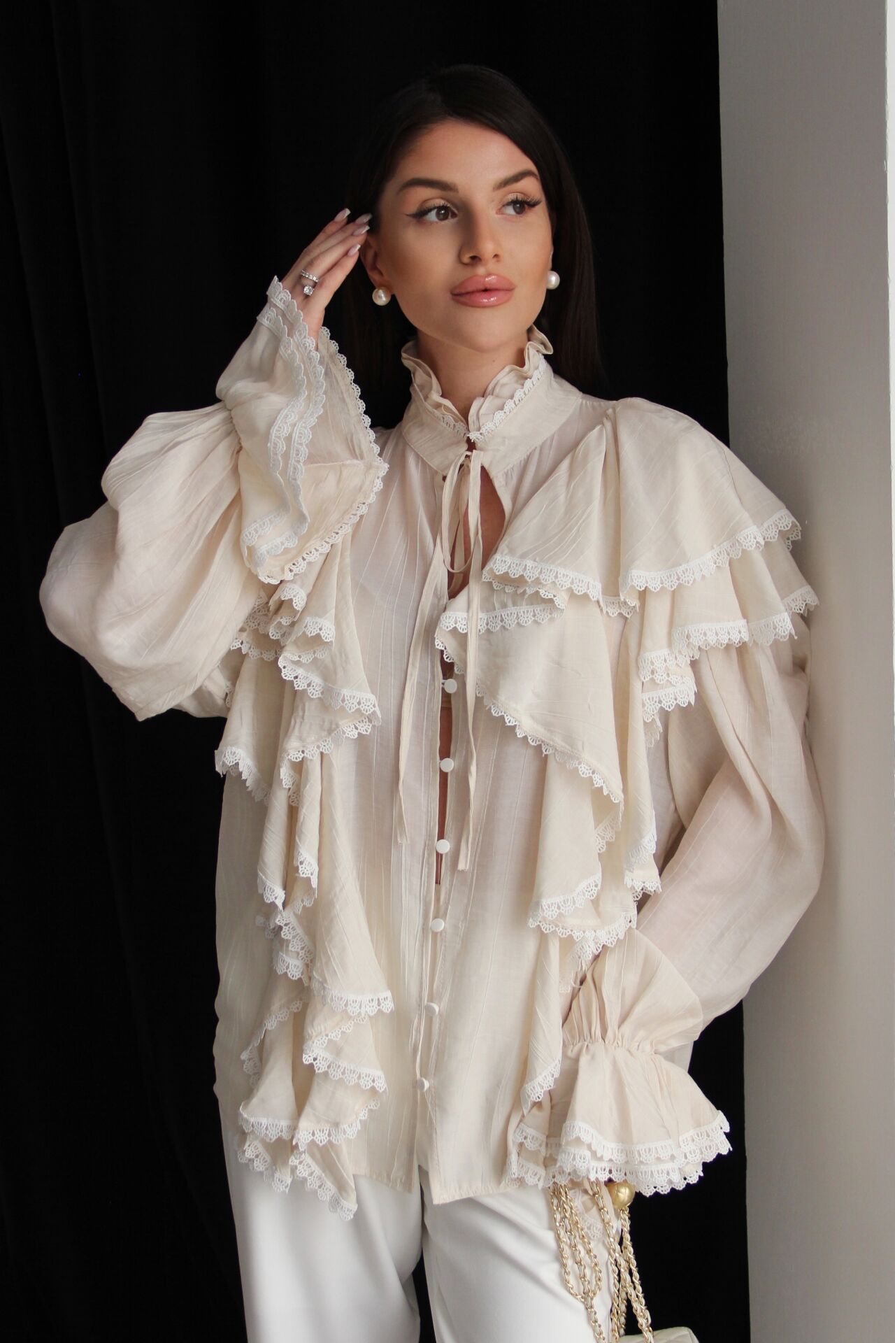 Krem Bej Dantel ve Bağlama Detaylı Premium Gömlek