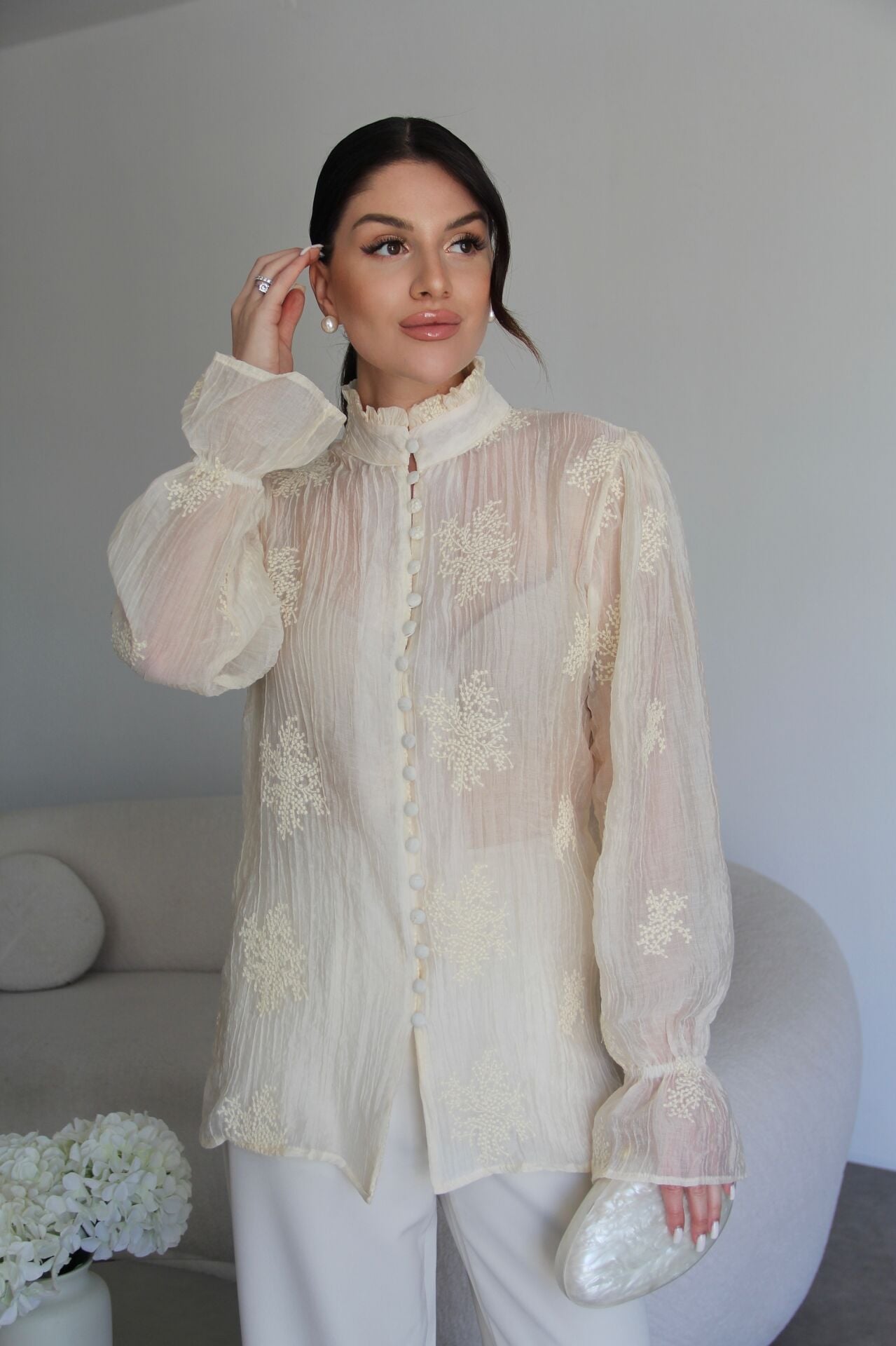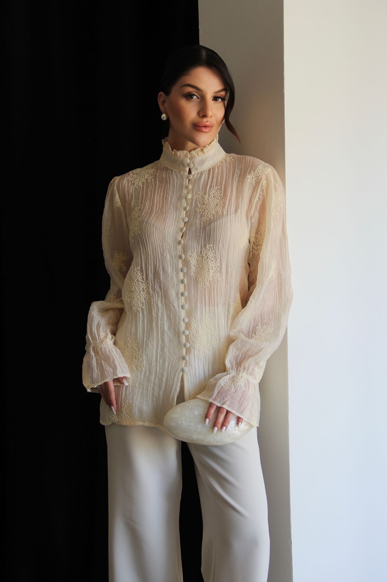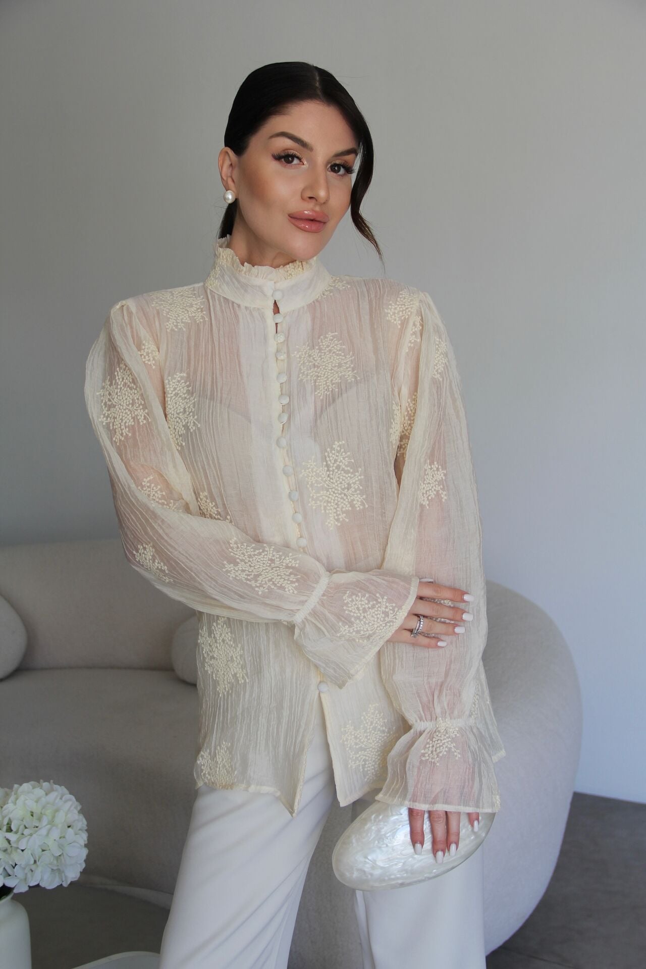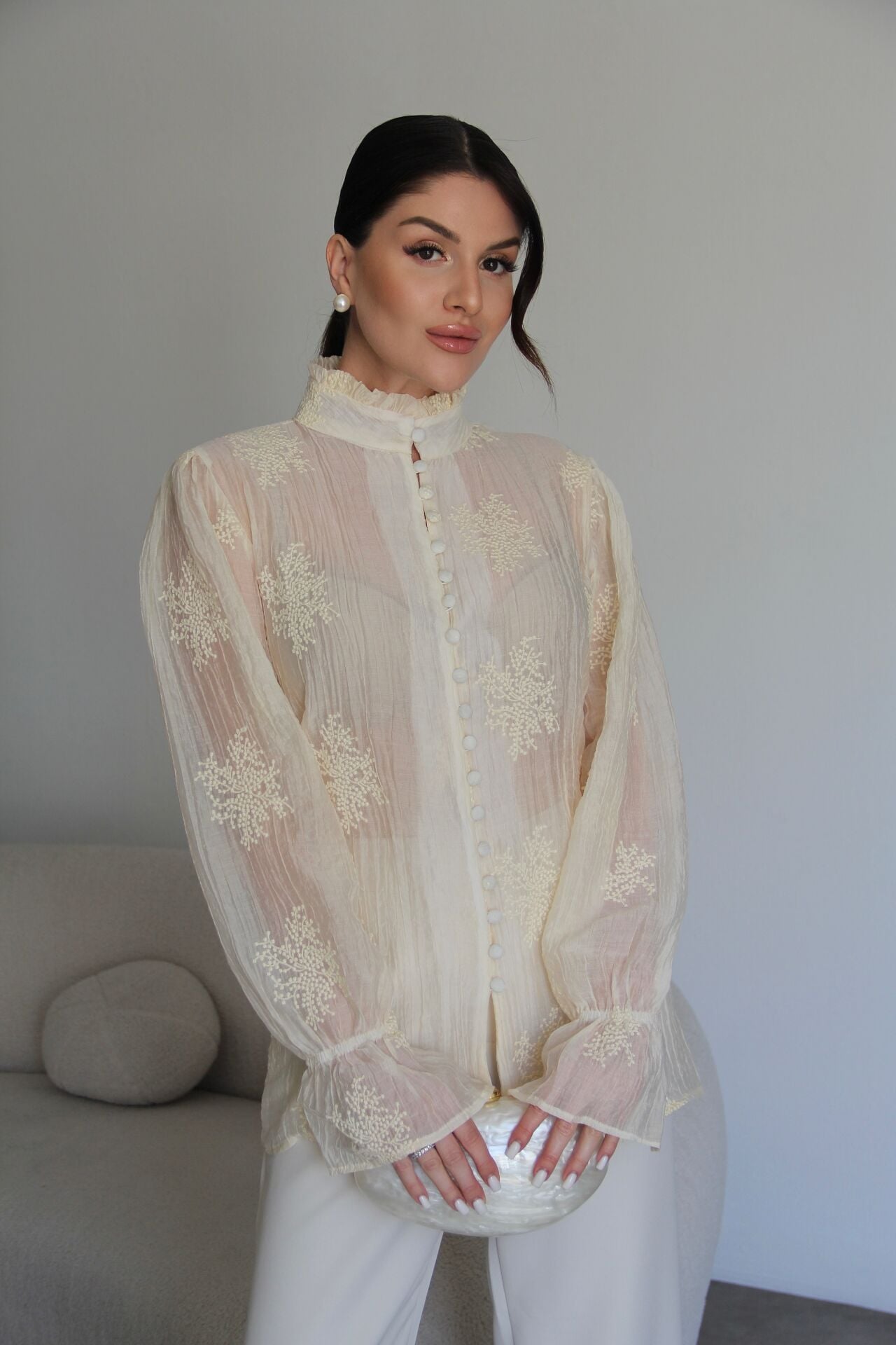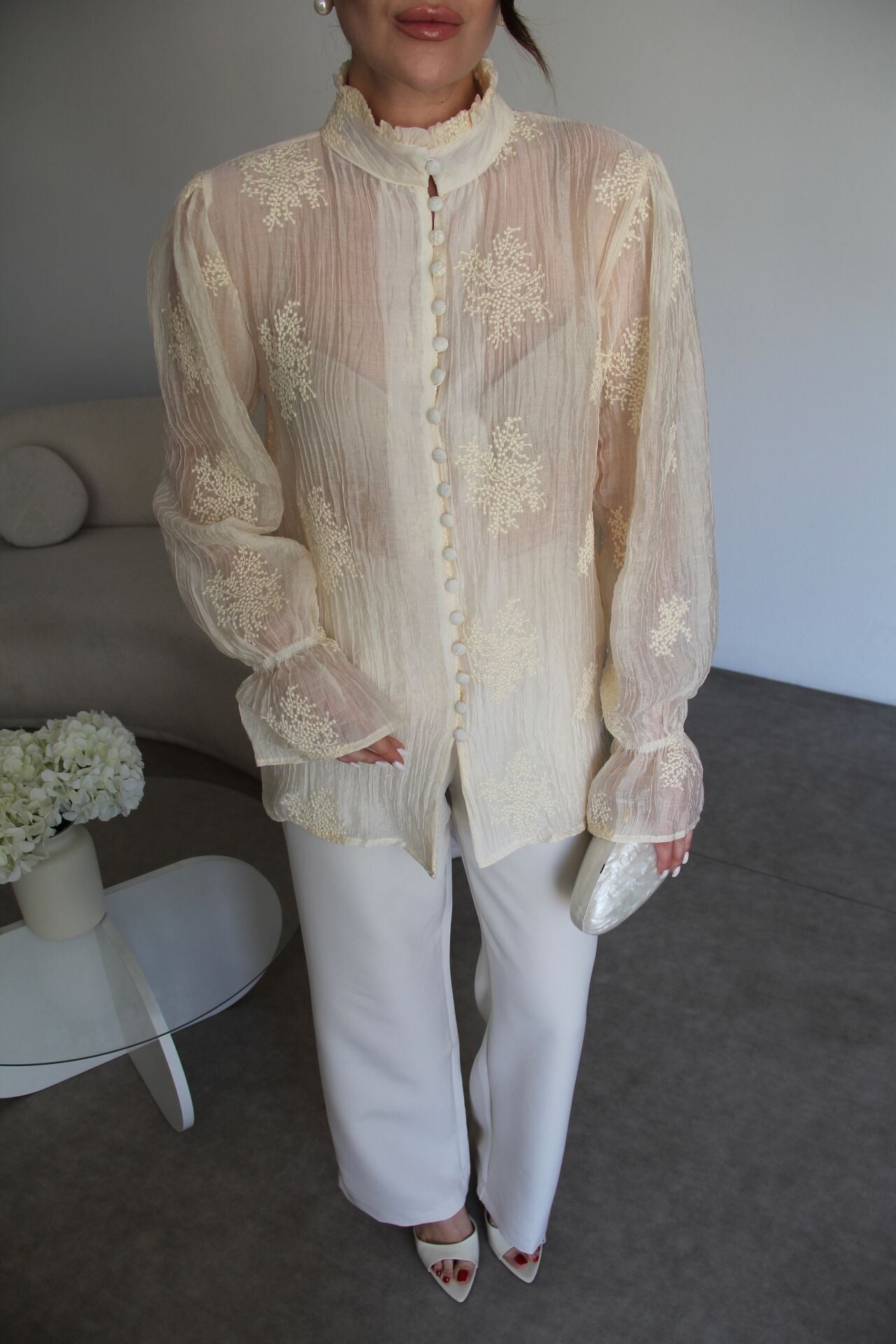 Krem Bej Dik Yaka Boydan Düğmeli Nakış Detaylı Premium Transparan Gömlek.