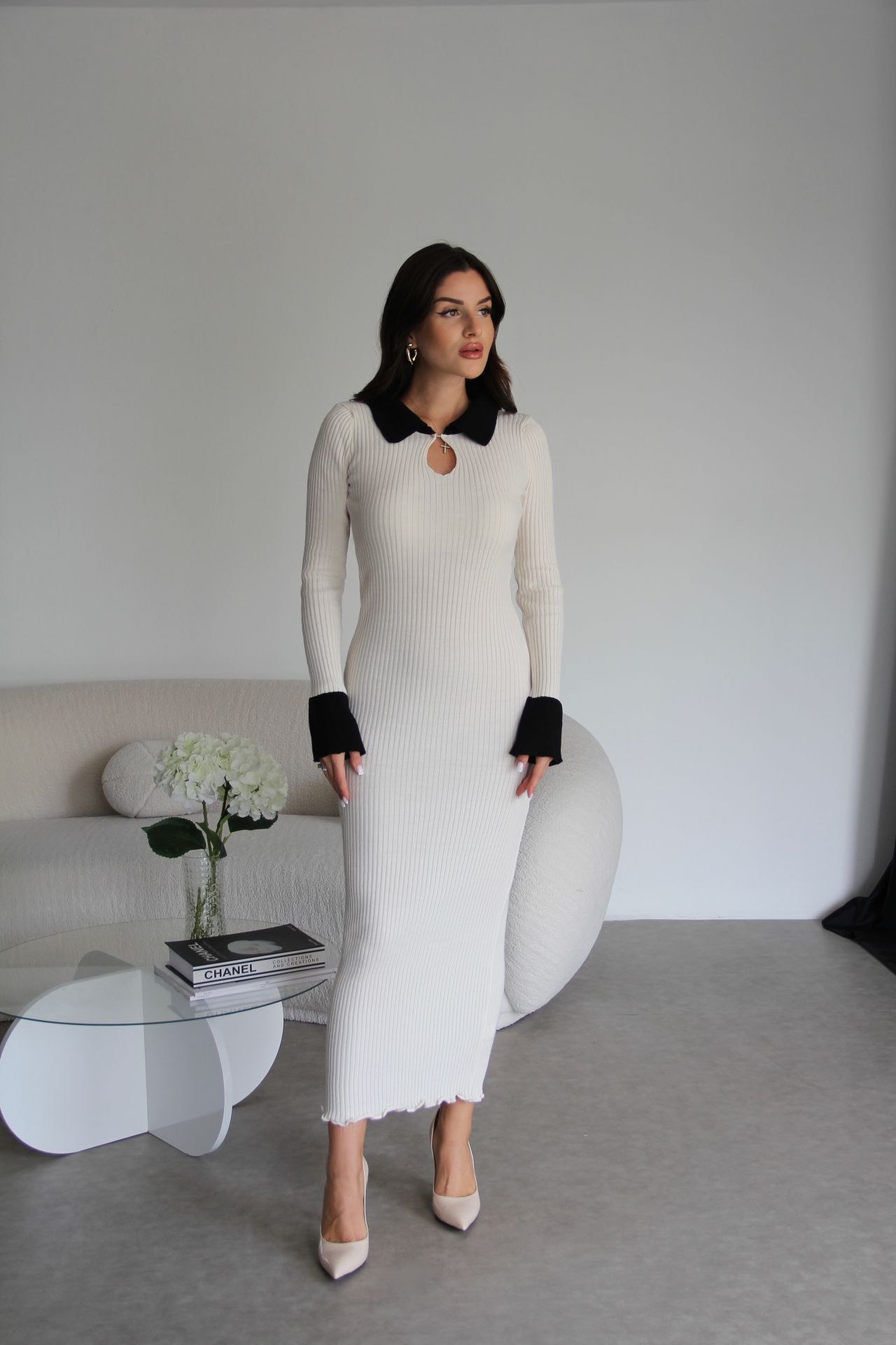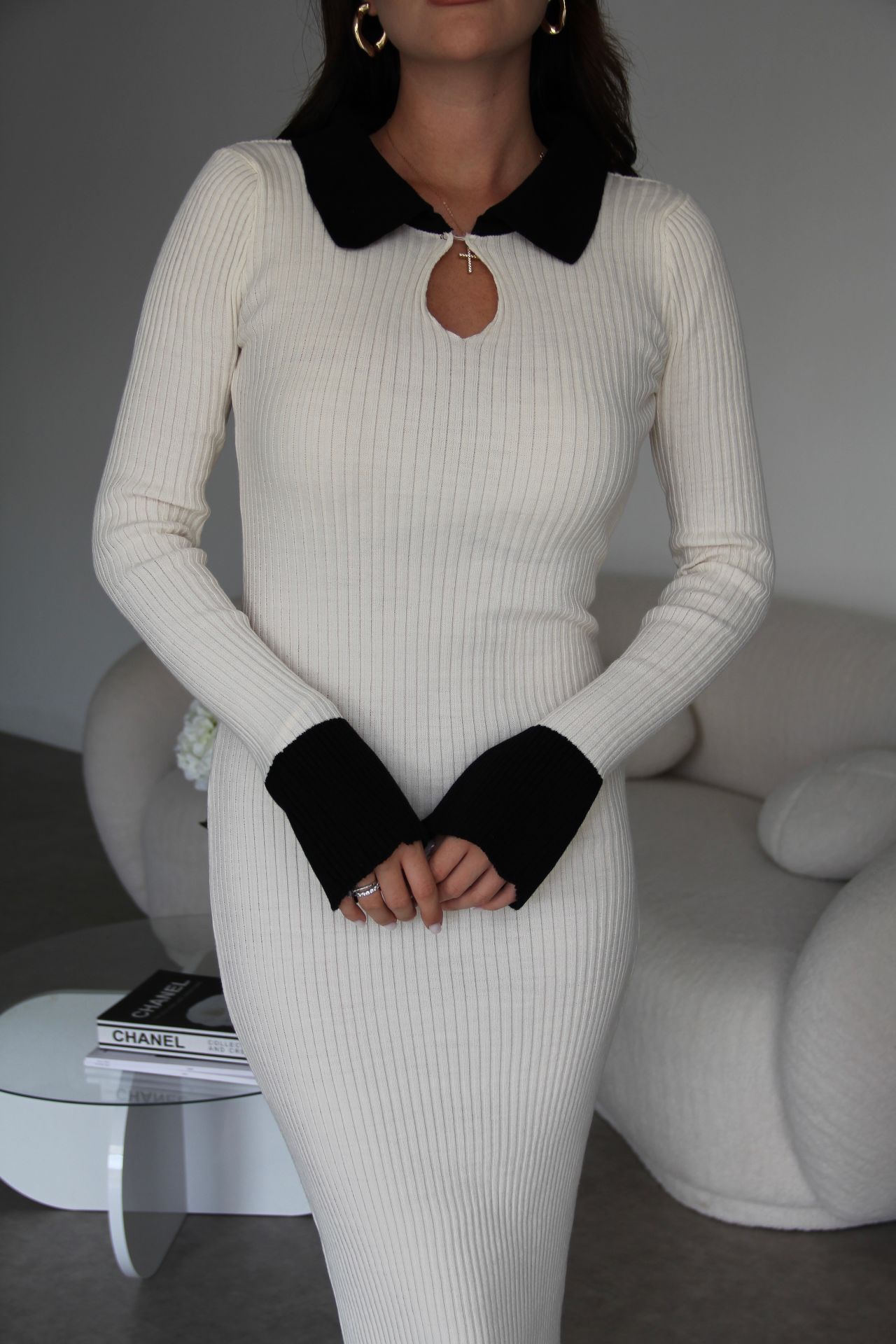 Krem Polo Yaka Düğme Detaylı Fitilli Midi Boy Örme Triko Elbise