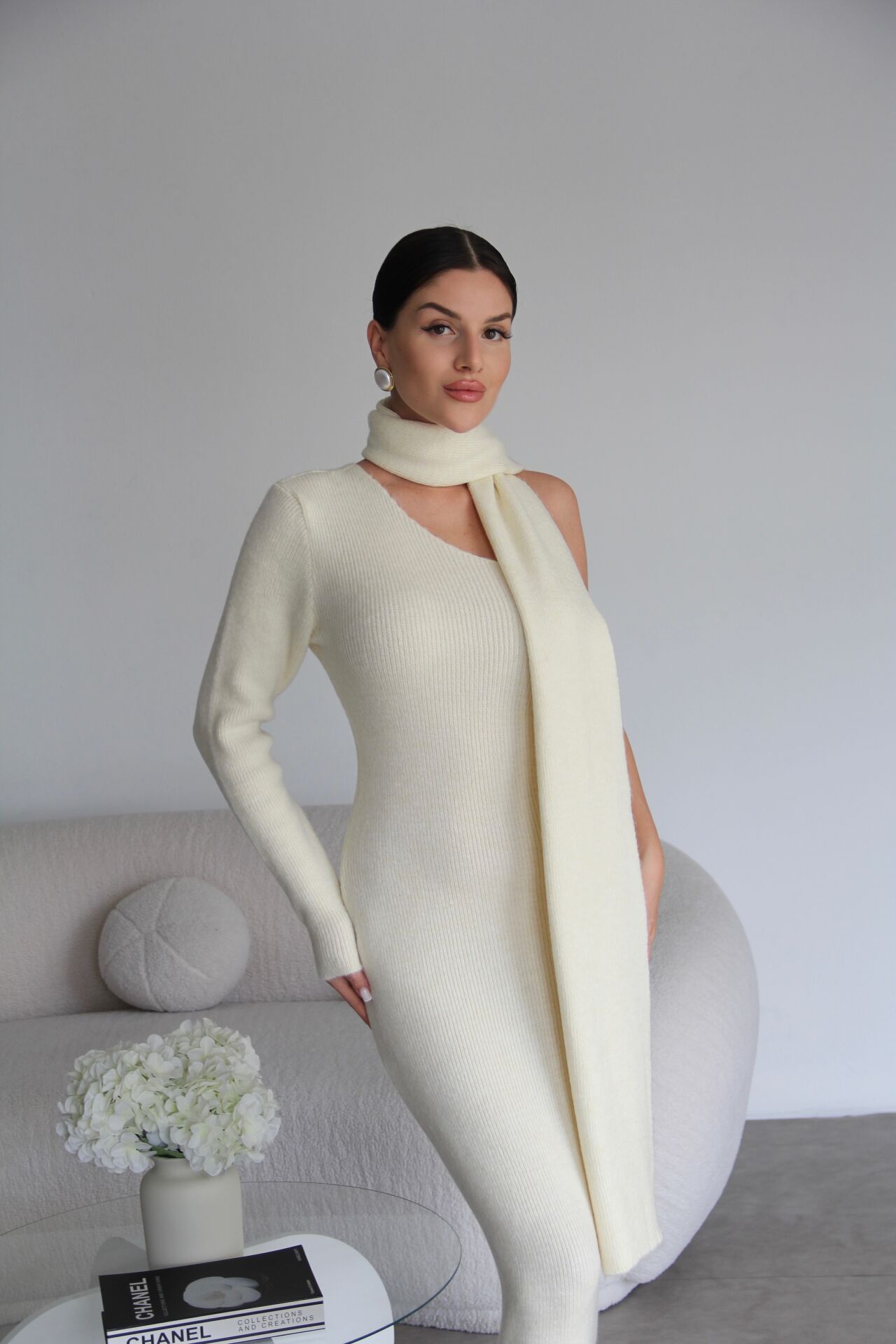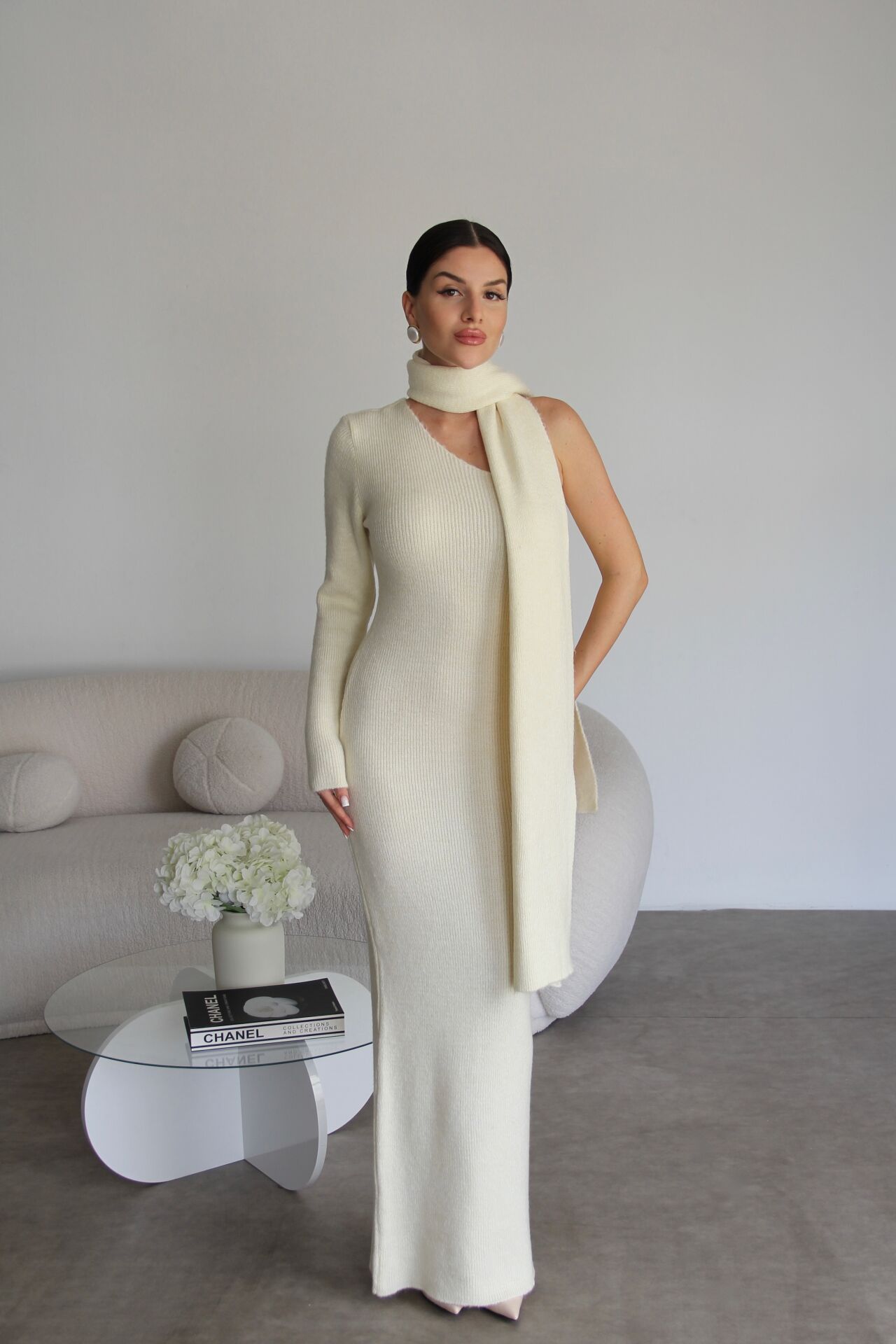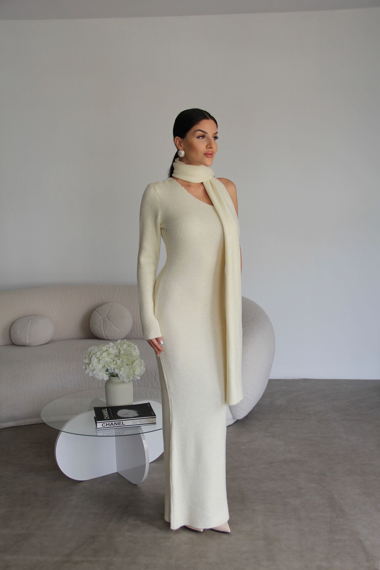 Krem Şal Detaylı Tek Omuz MAXİ UZUN Boy Triko Elbise