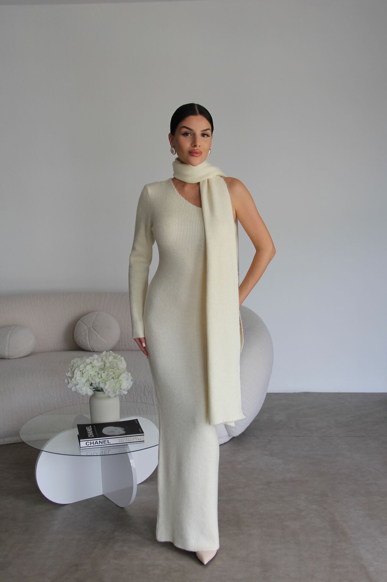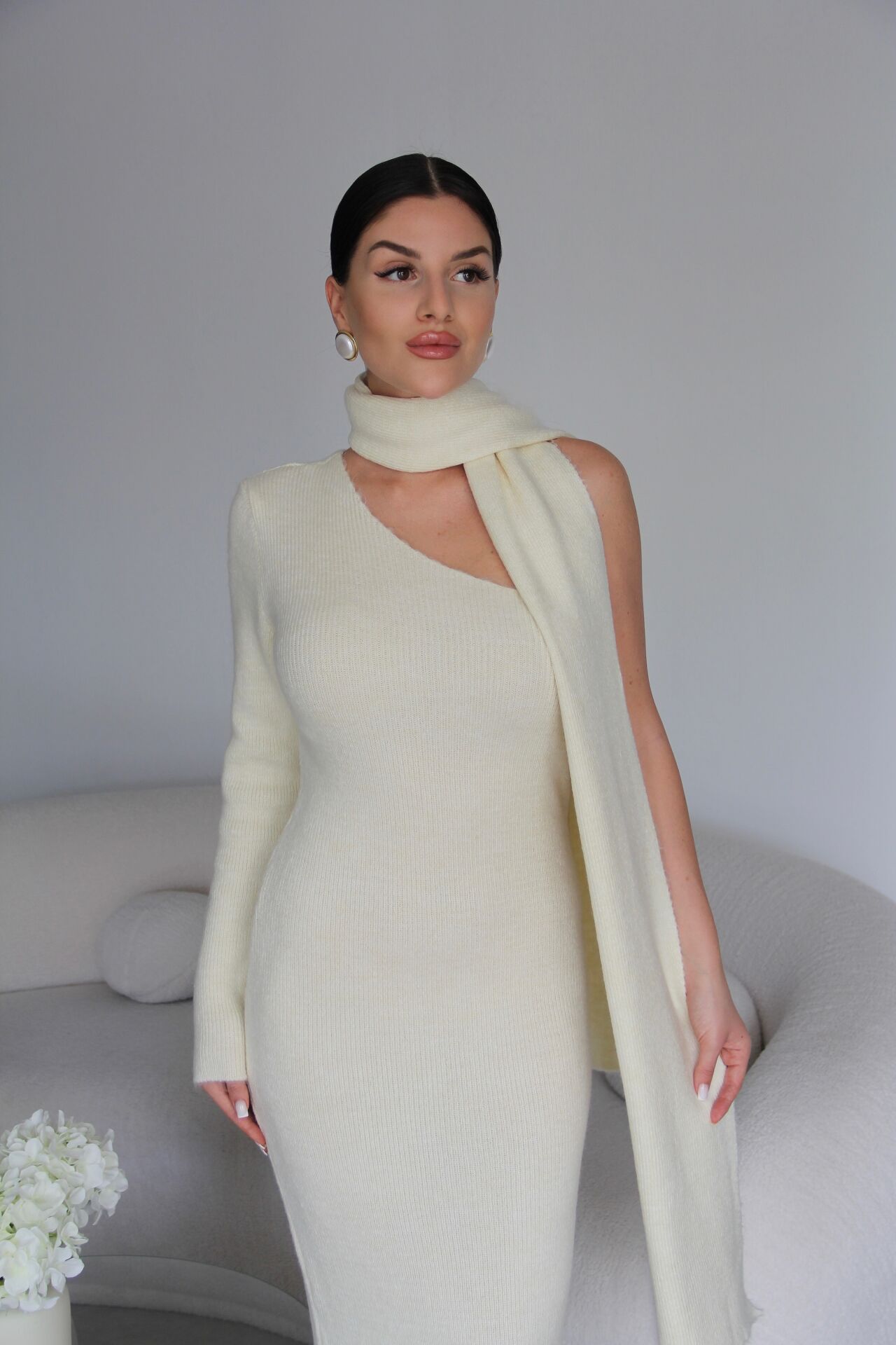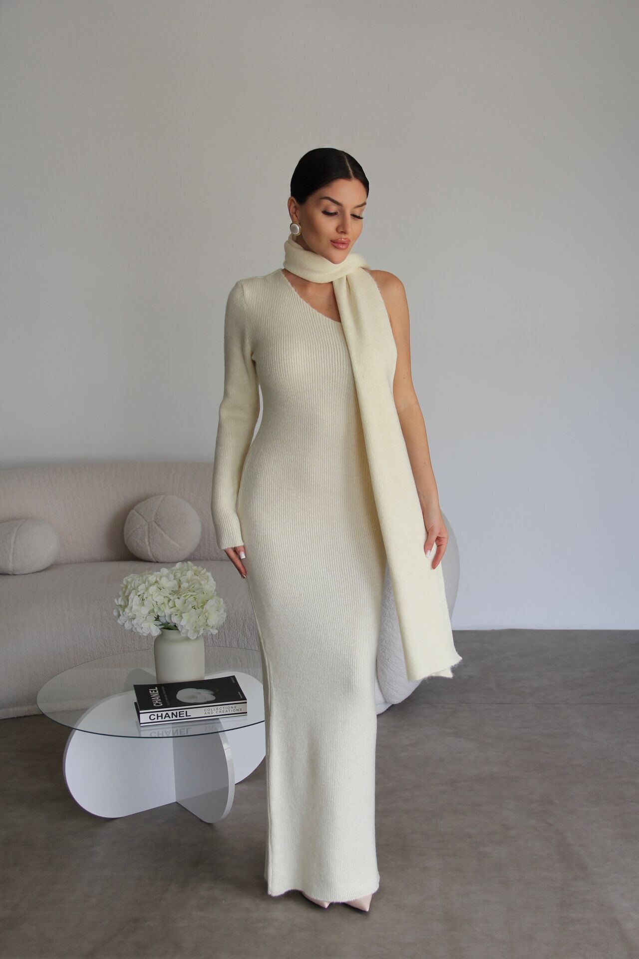 Krem Şal Detaylı Tek Omuz MAXİ UZUN Boy Triko Elbise