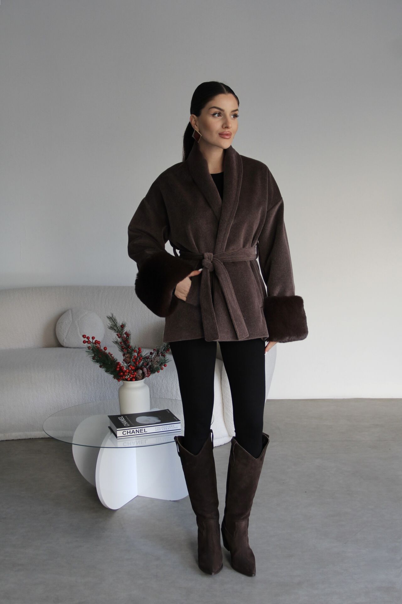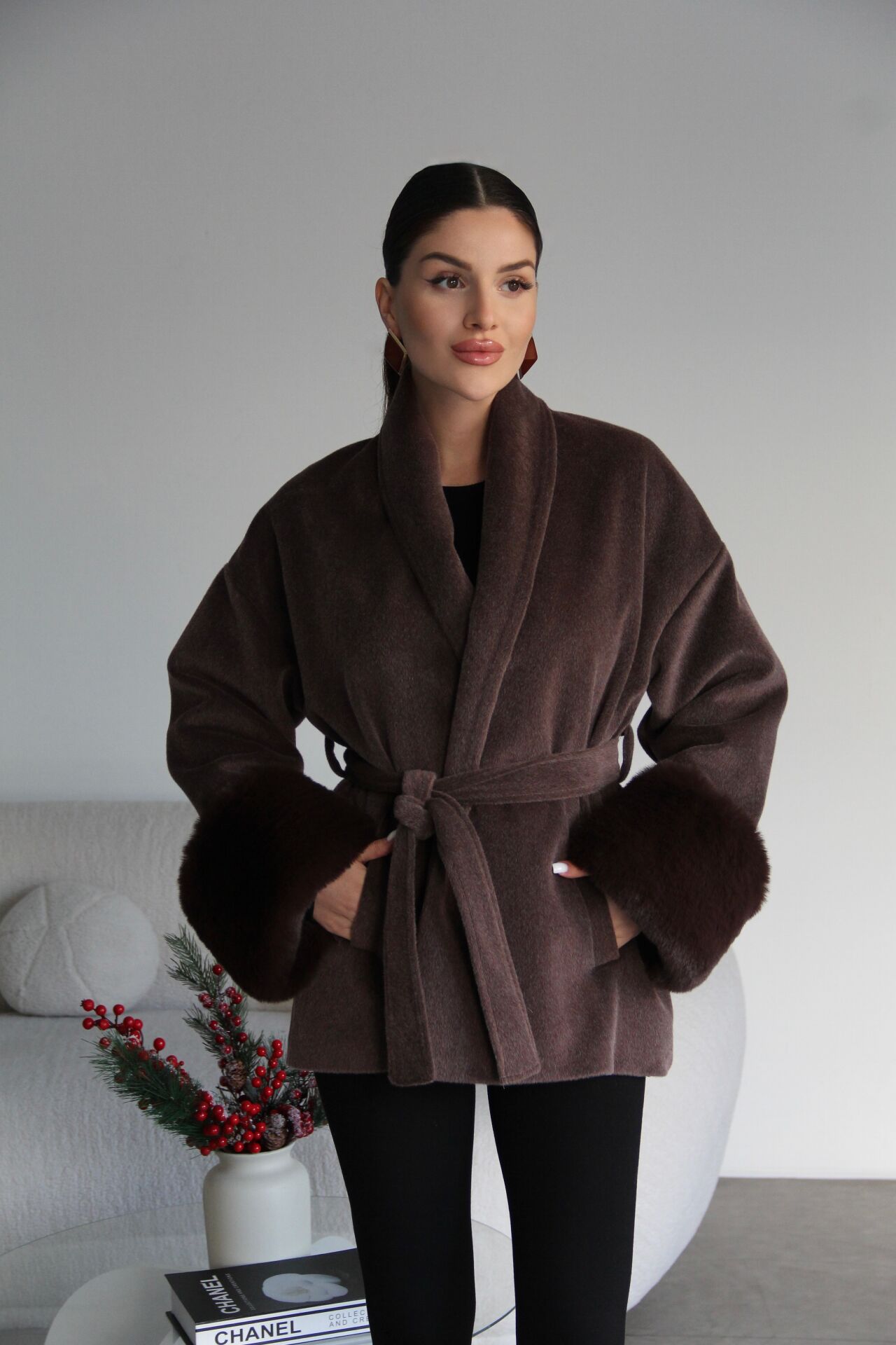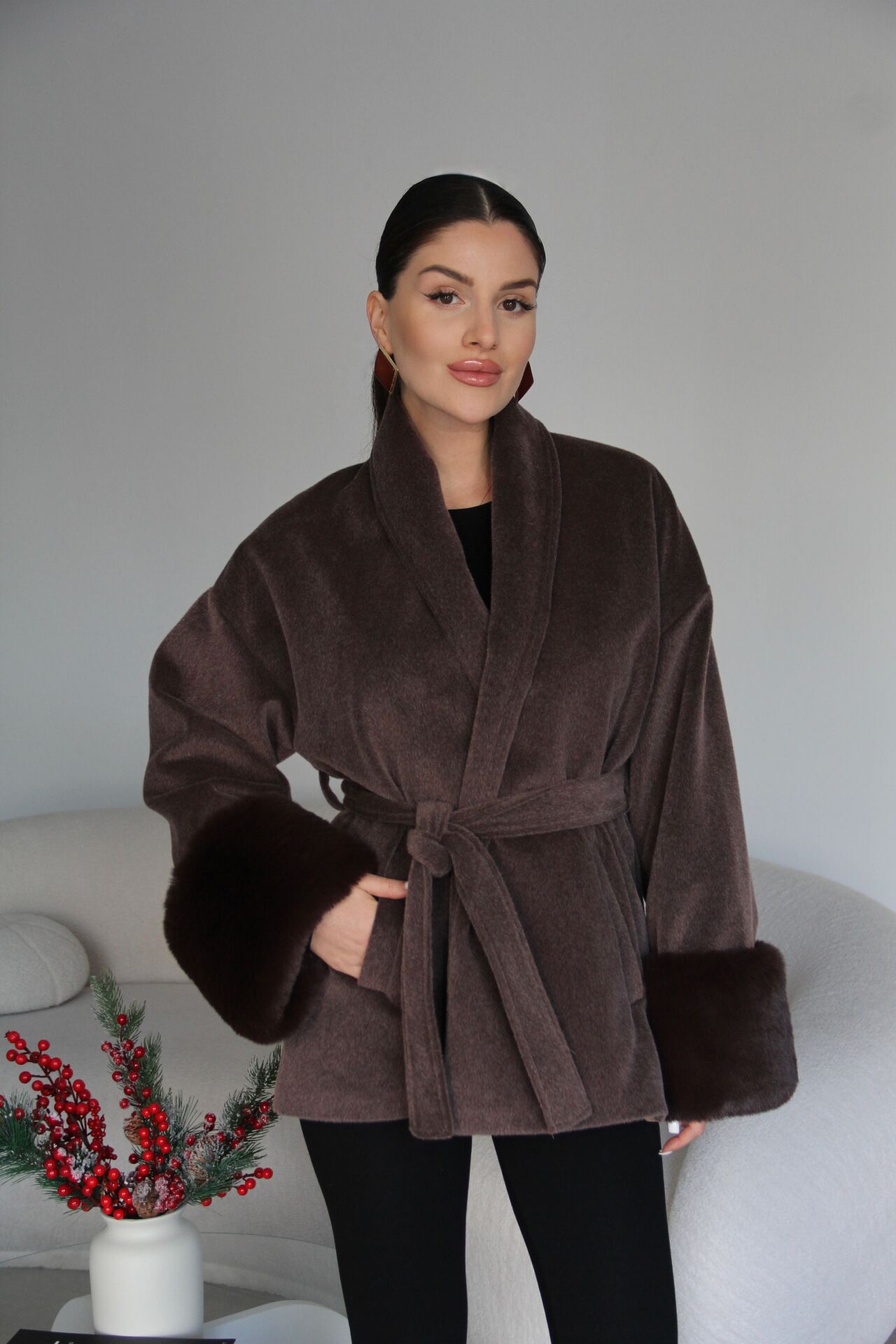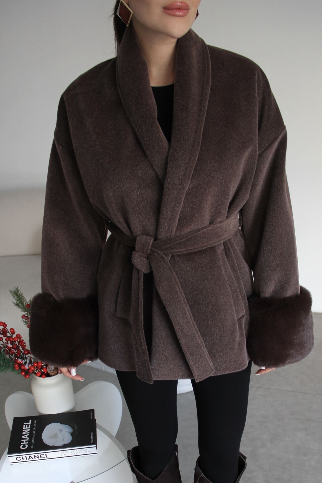 Kahve Kuşaklı Kolları Çıkabilir Kürk Detaylı Premium Kaşe Kaban