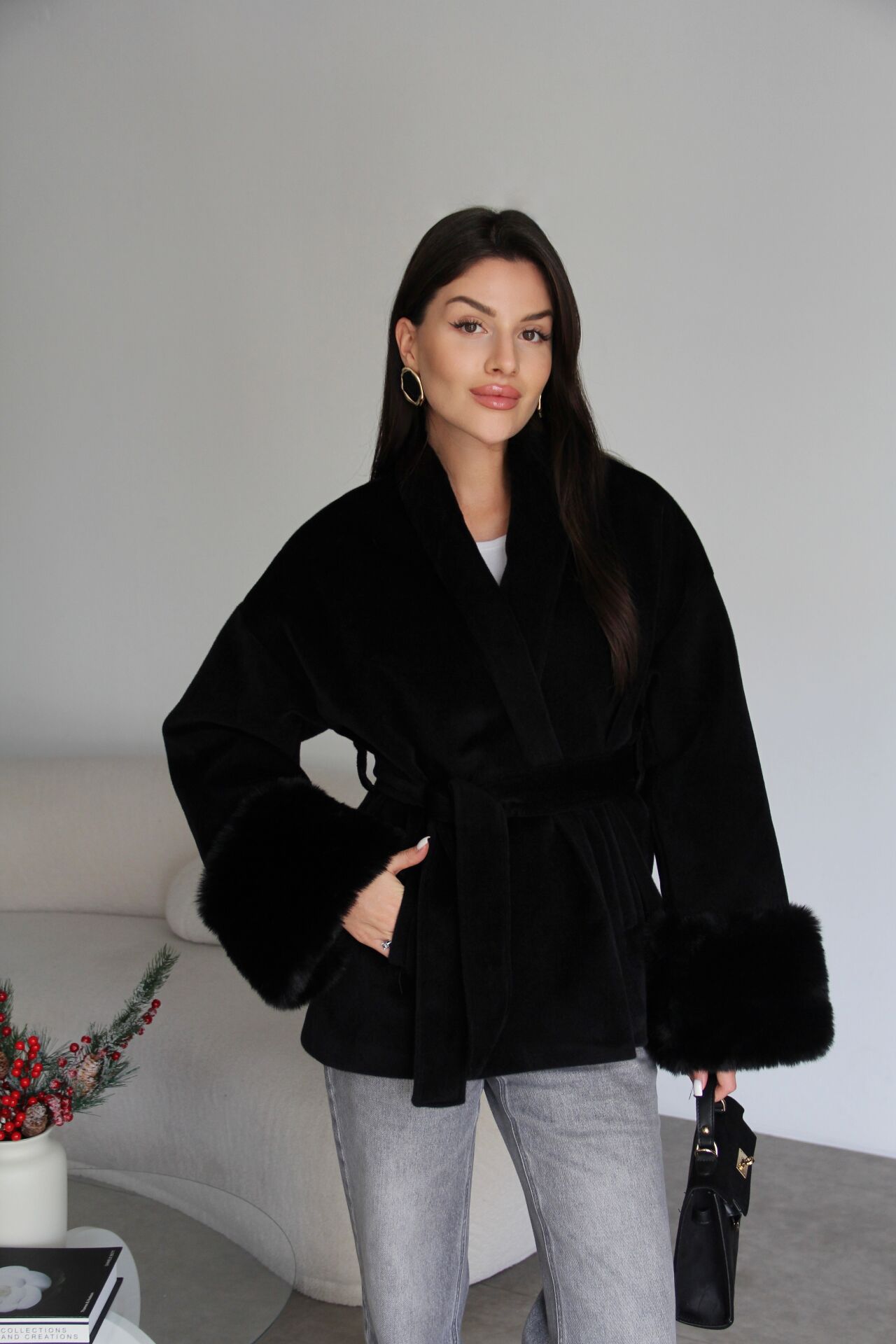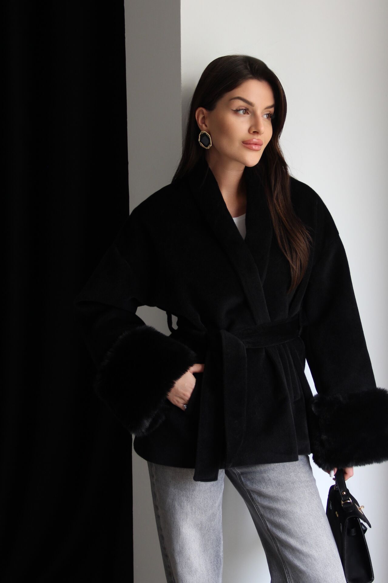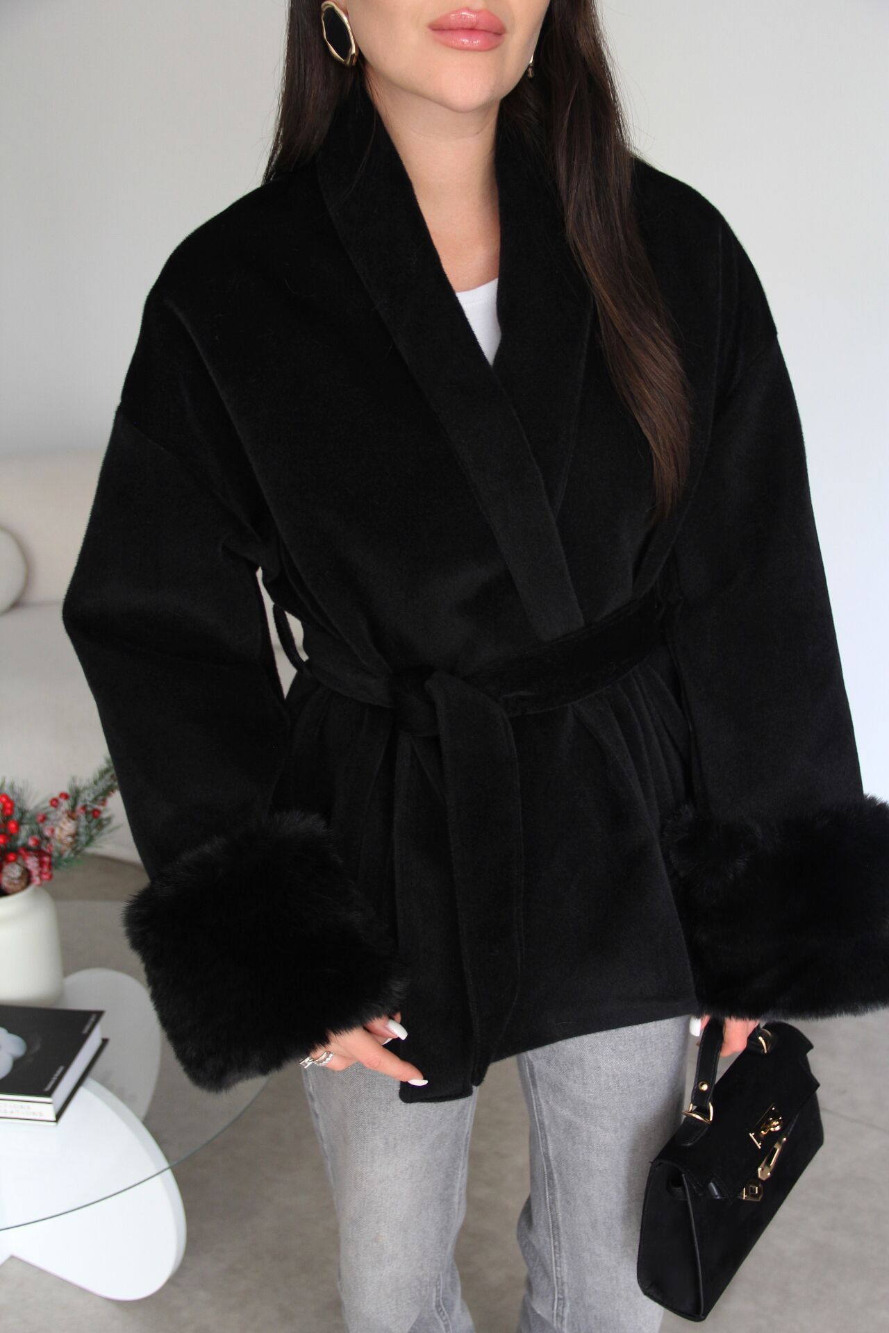 Siyah Kuşaklı Kolları Çıkabilir Kürk Detaylı Premium Kaşe Kaban