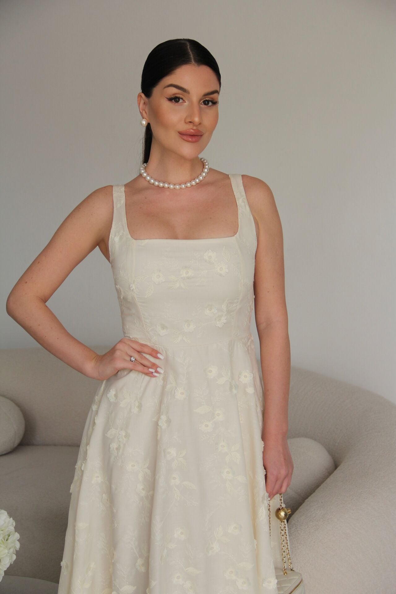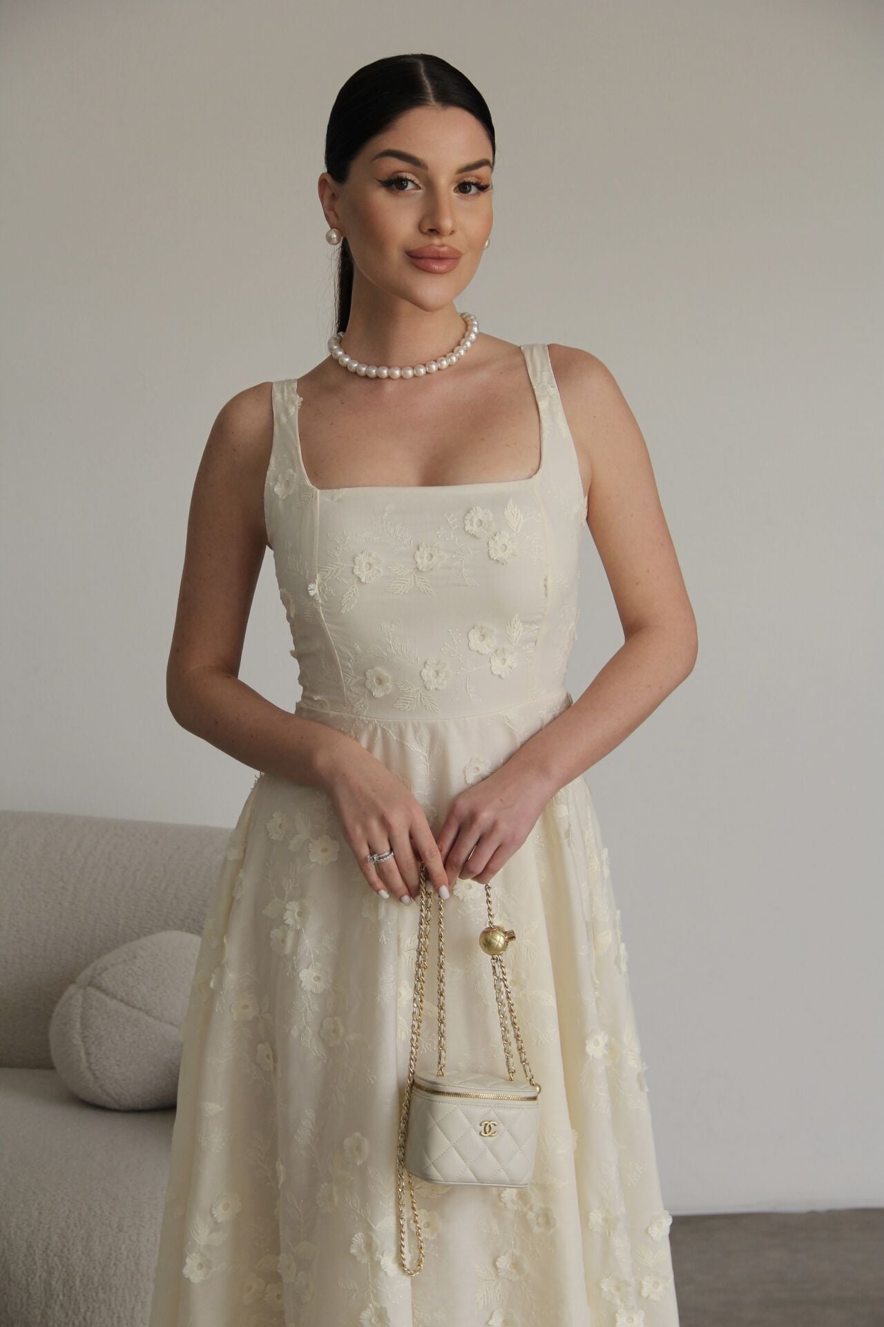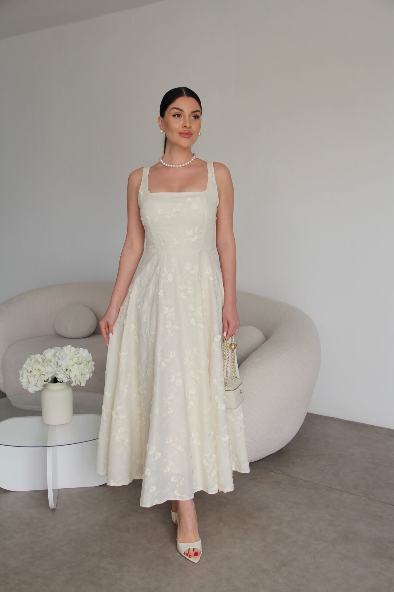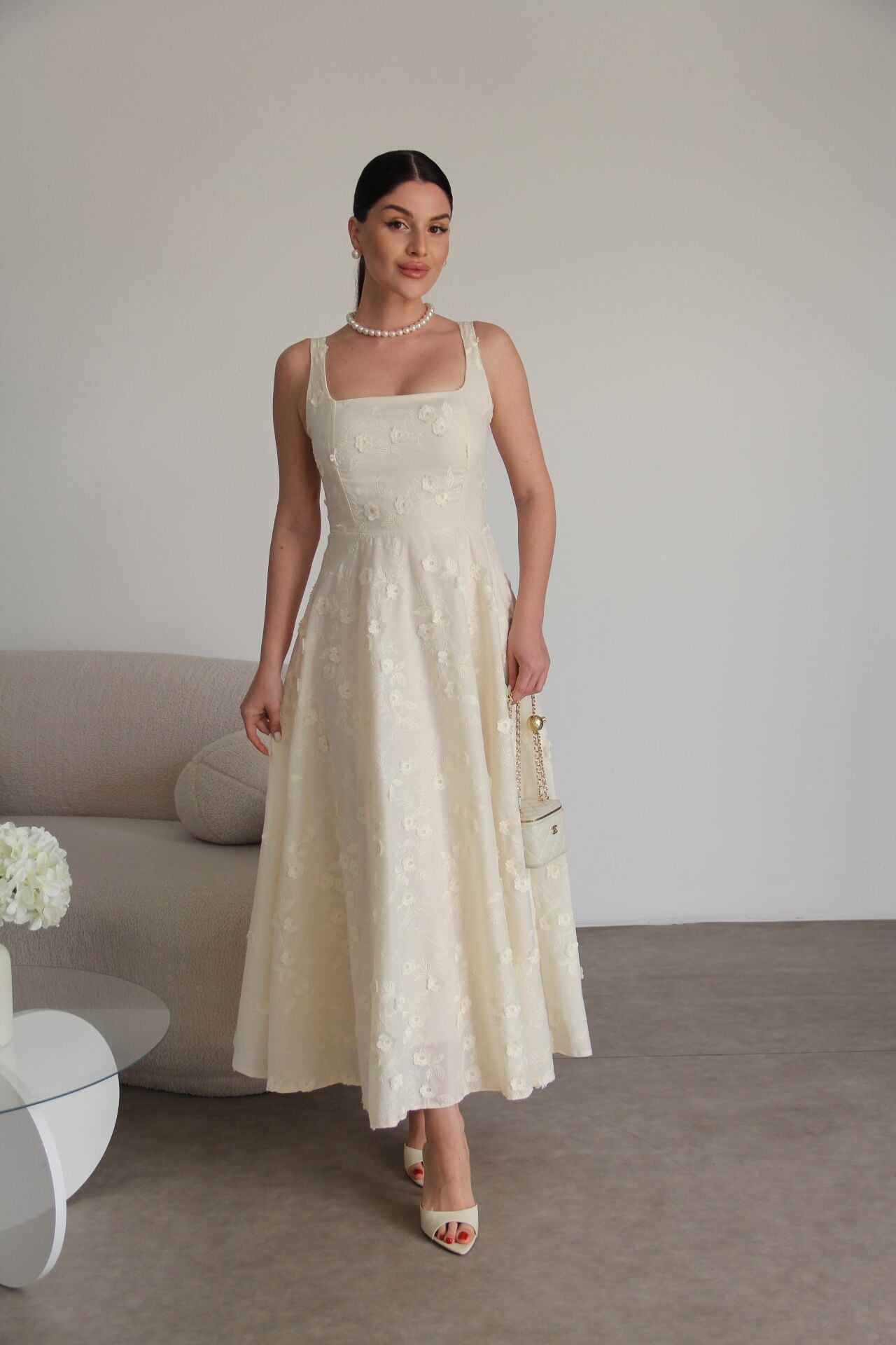 Nakış ve 3 Boyutlu Bej Çiçek Desenli Askılı Tasarım Keten Elbise