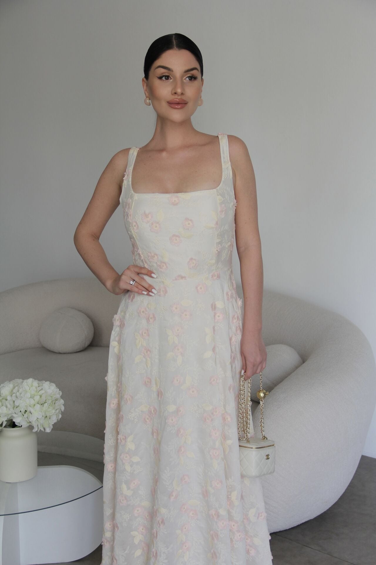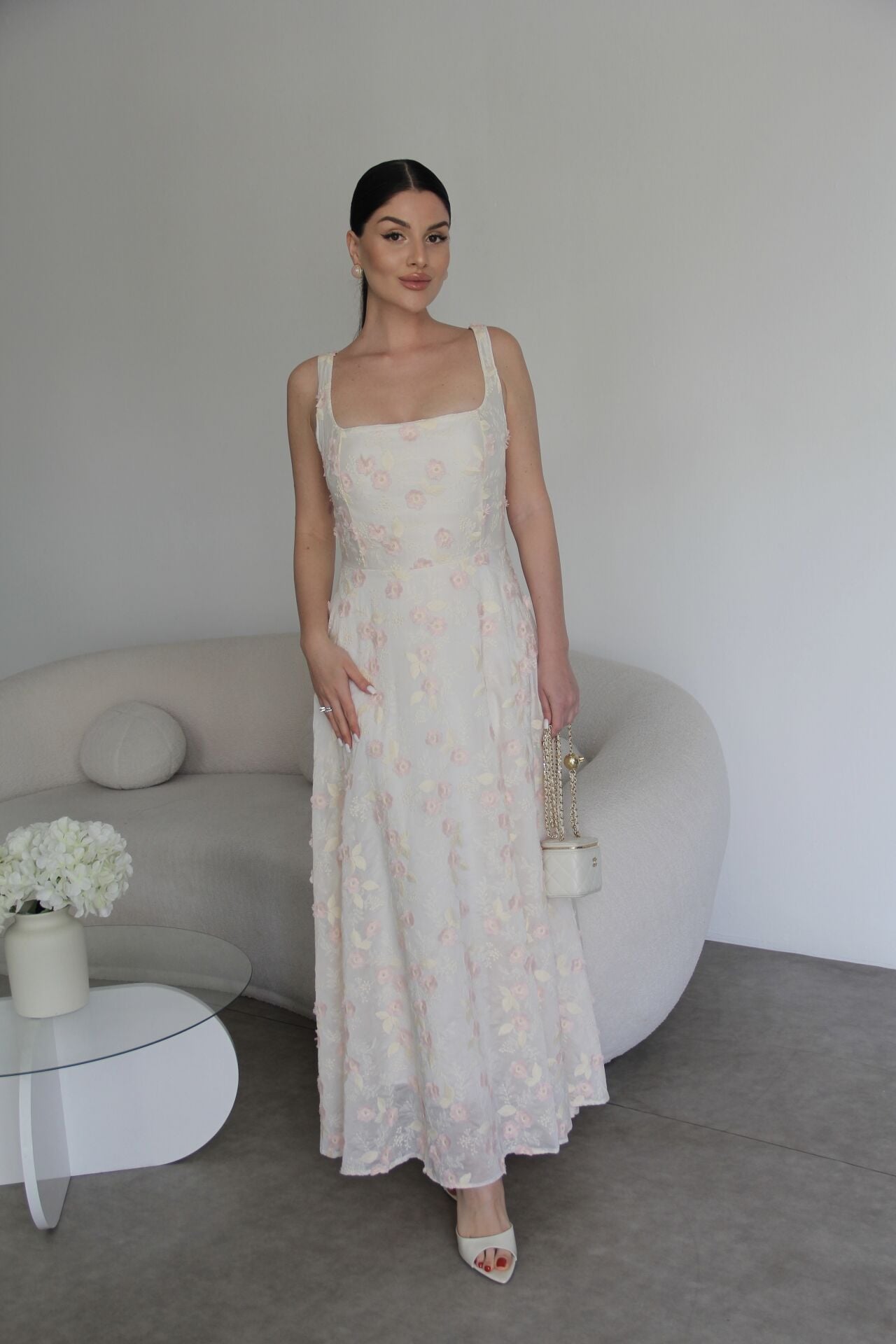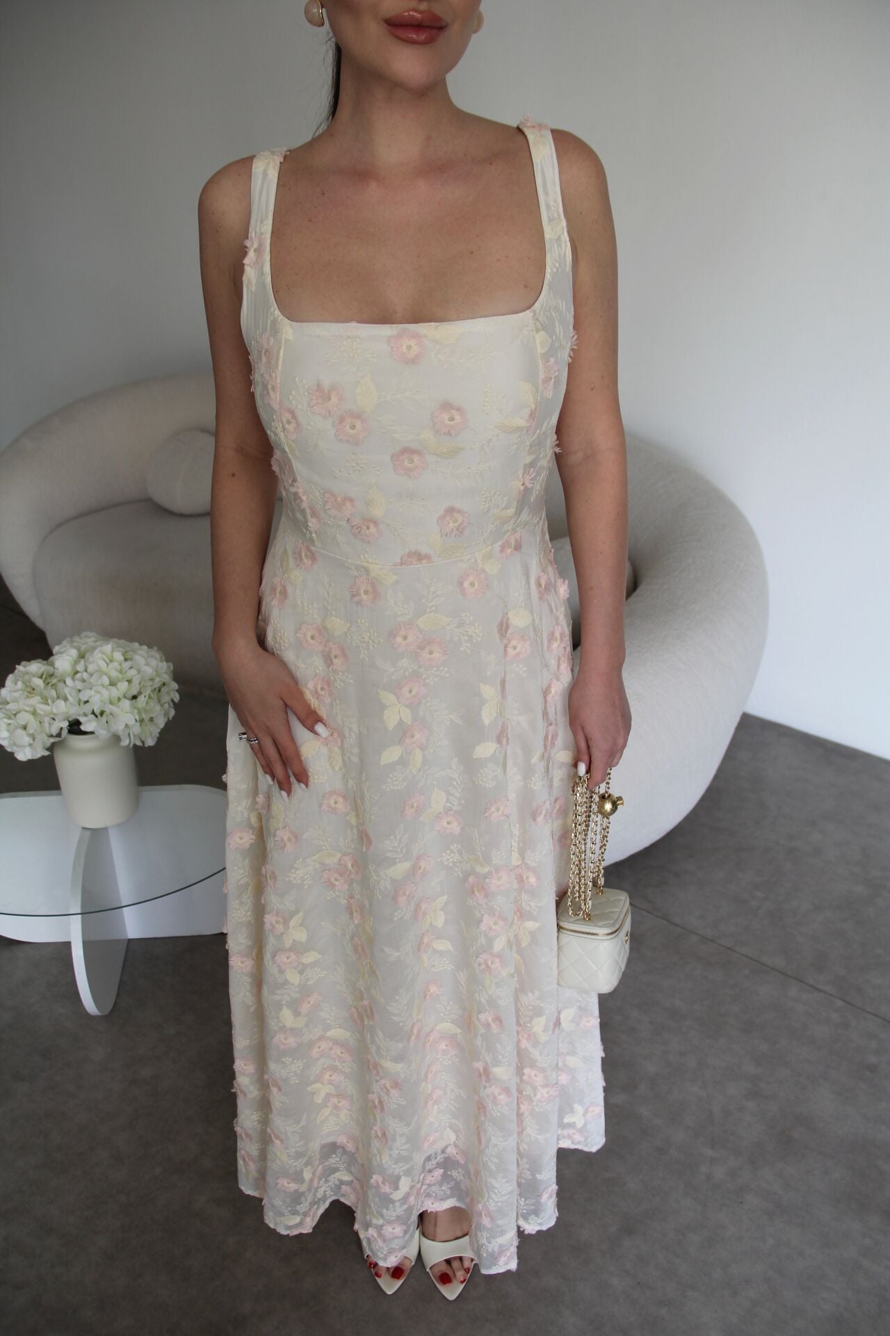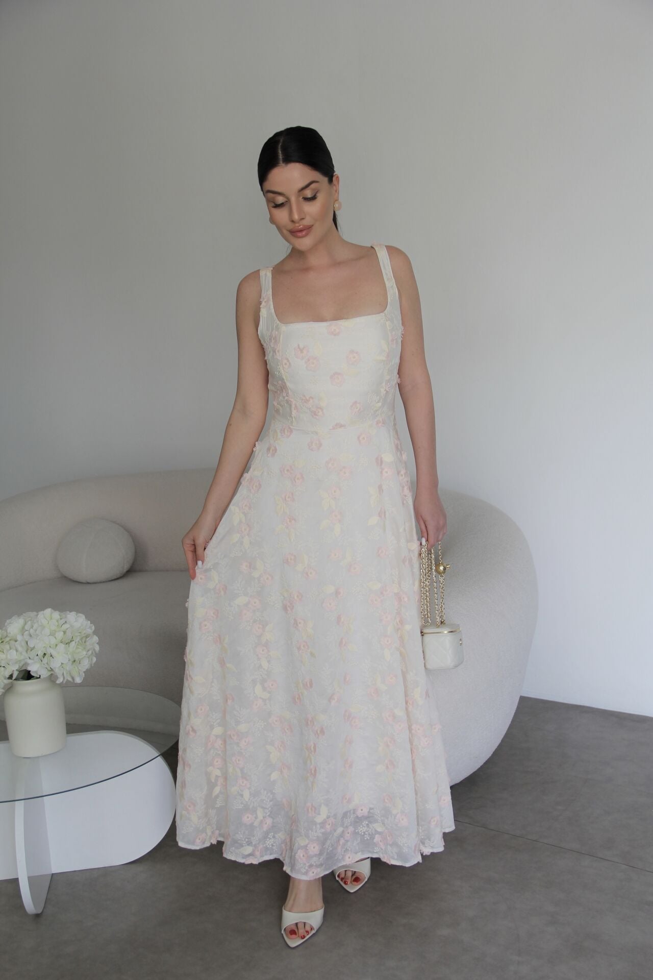 Nakış ve 3 Boyutlu Pembe Çiçek Desenli Askılı Tasarım Keten Elbise