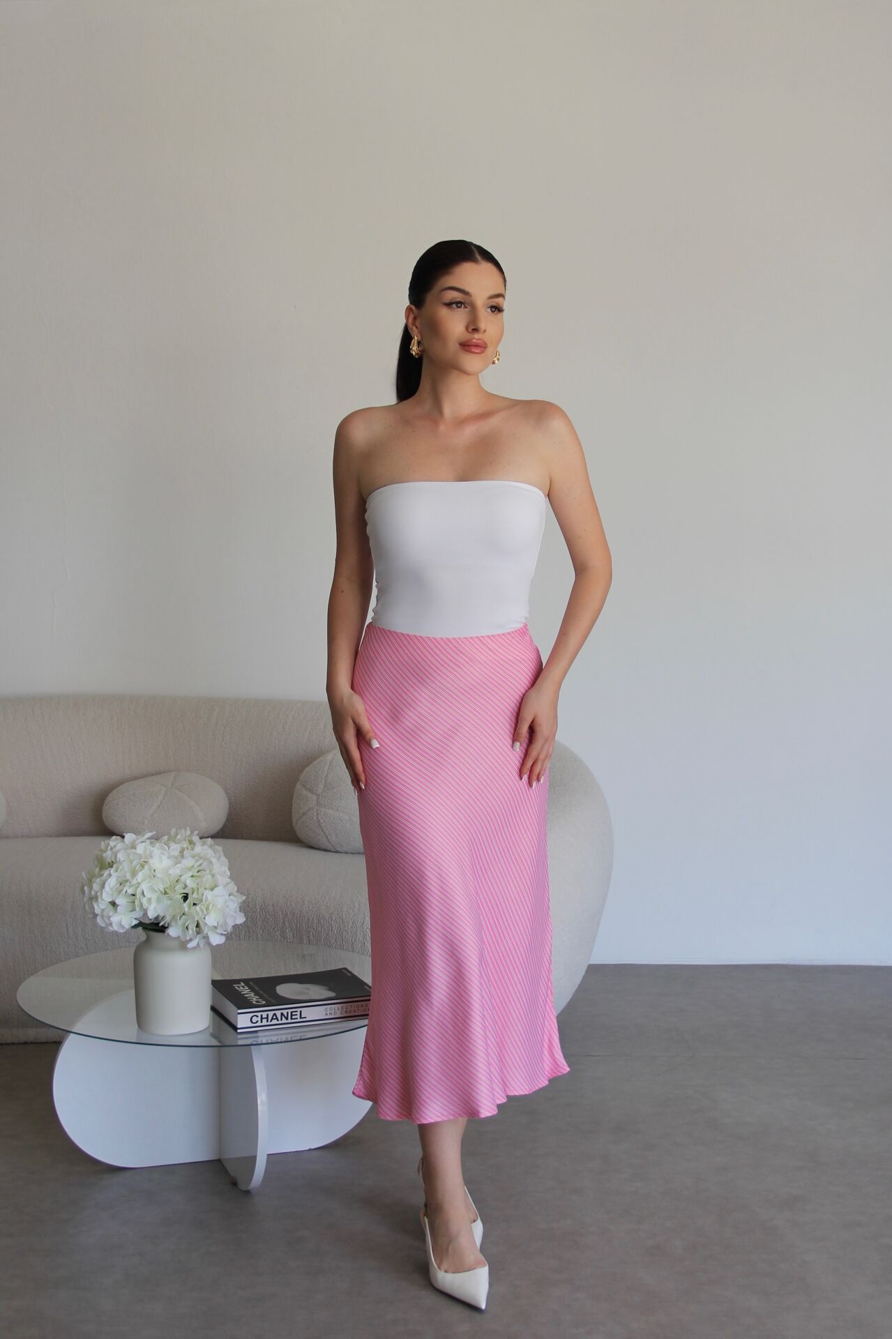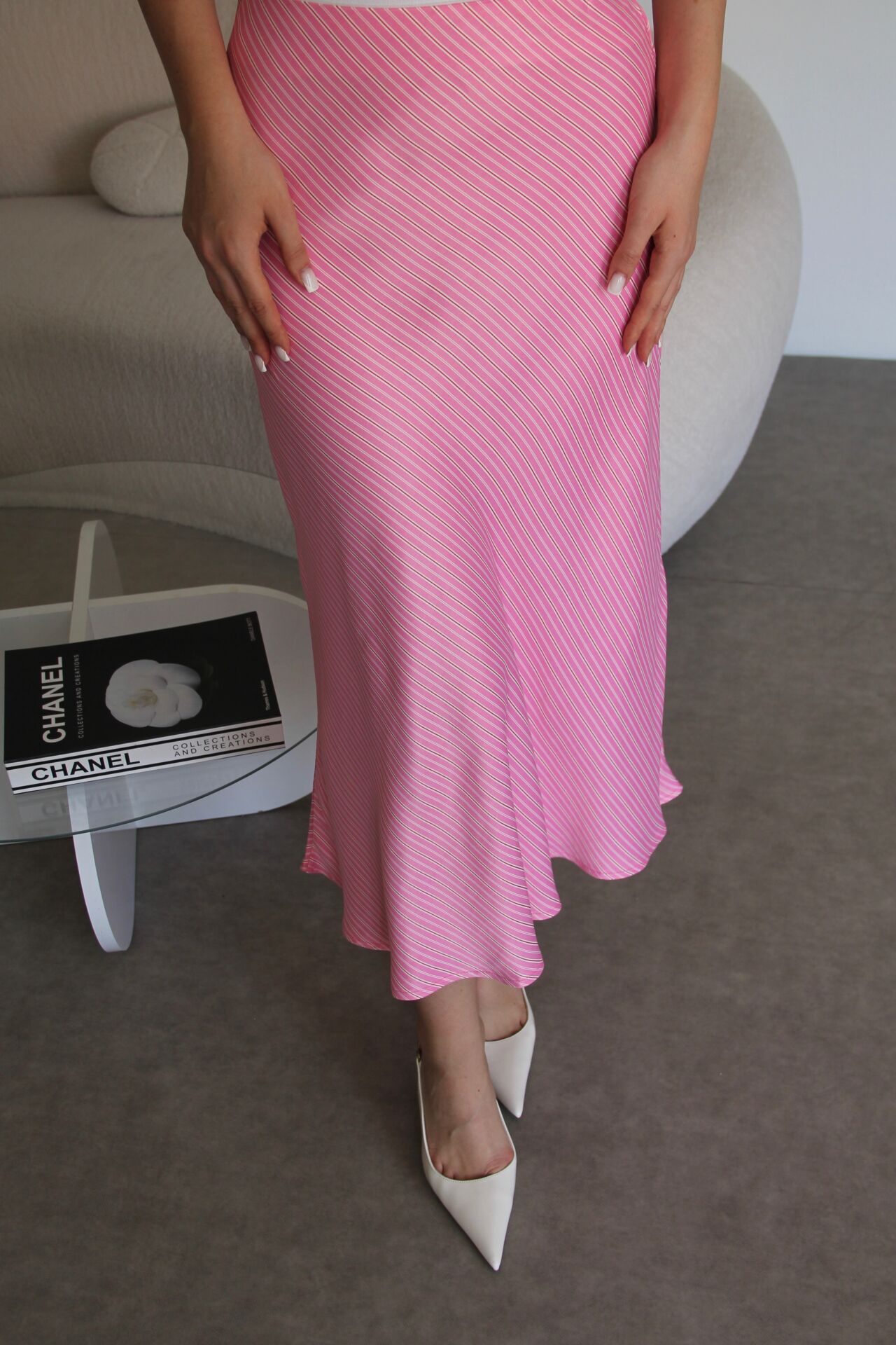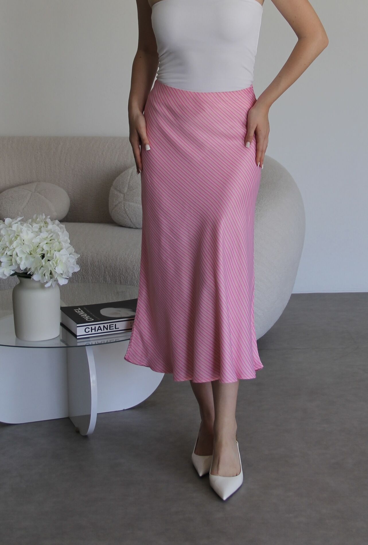 Pembe Beyaz Çizgili Beli Lastikli Verev Kesim Midi Boy Premium Saten Etek