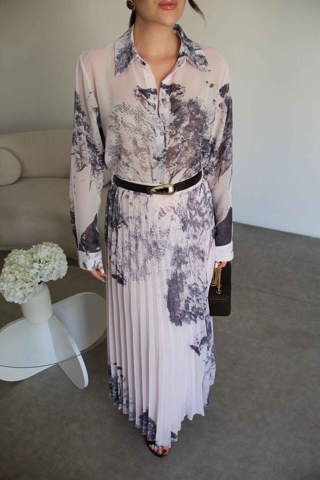 Pembe Desenli Gömlek ve KEMERLİ Piliseli Astarlı Maxi Uzun Etek Premium Şifon Takım