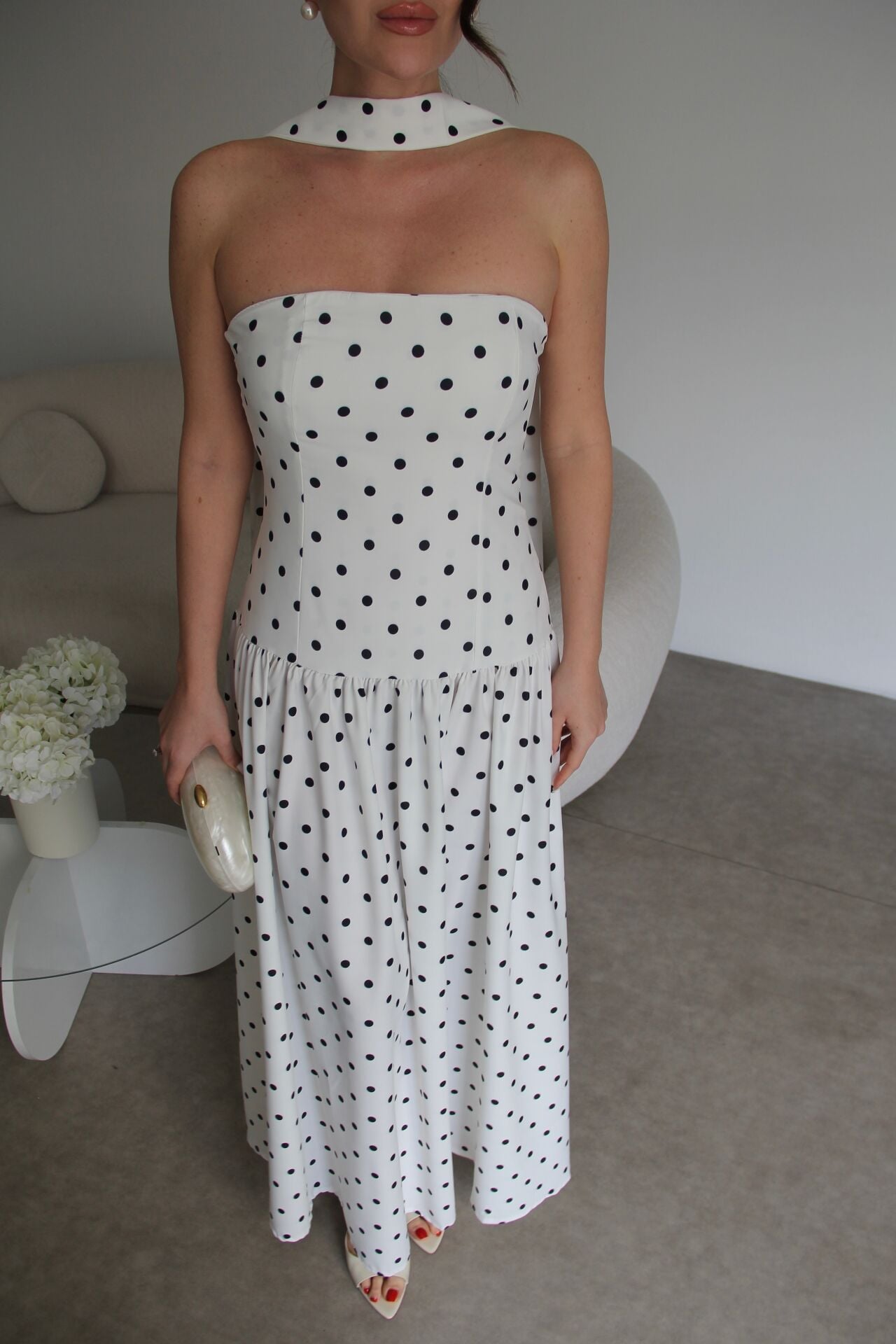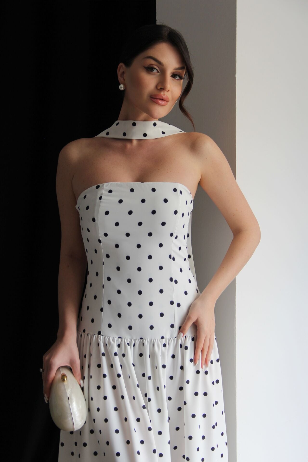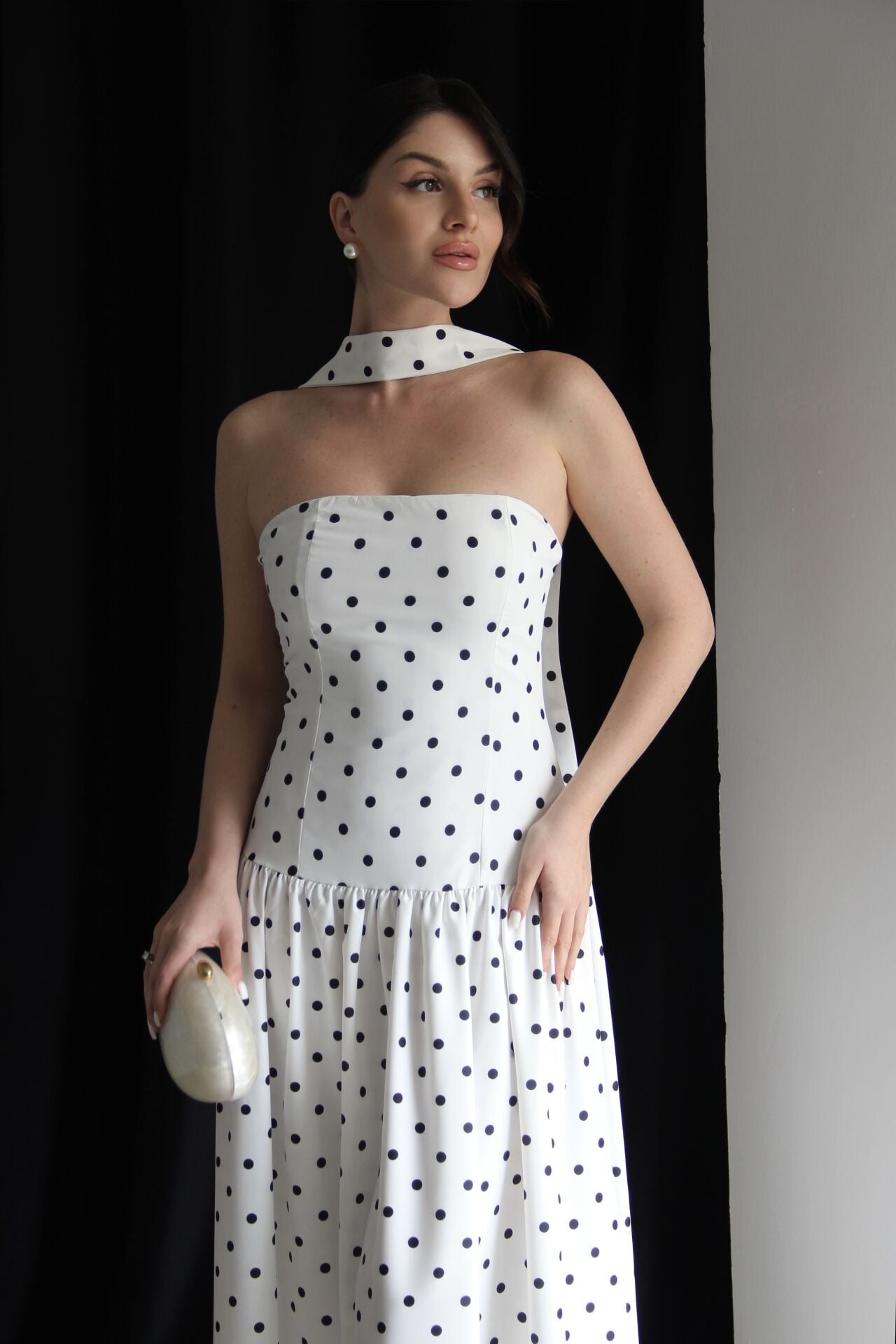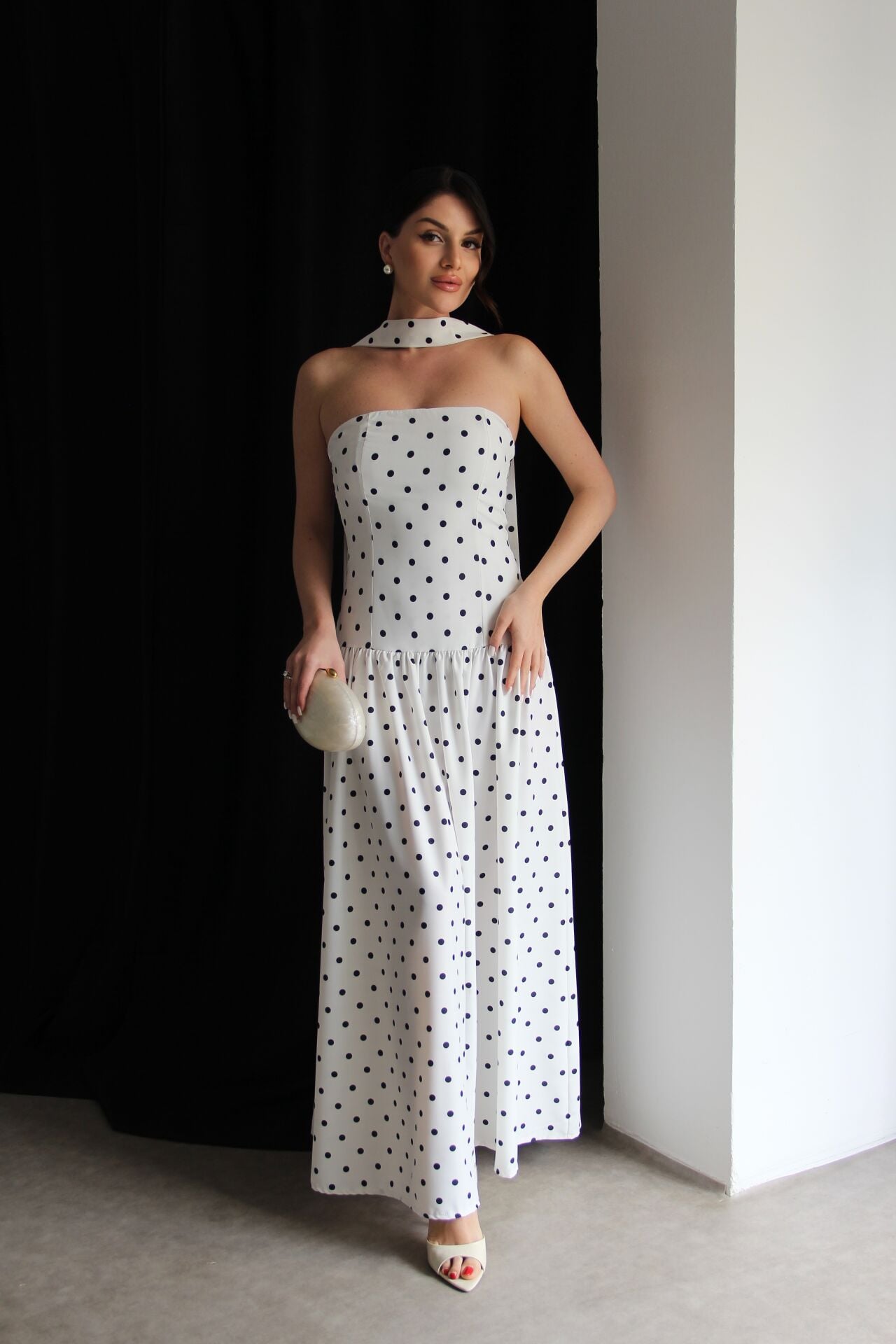 Julidress Şal Detaylı Straplez Yaka Maxi Uzun Boy Puantiyeli Elbise.