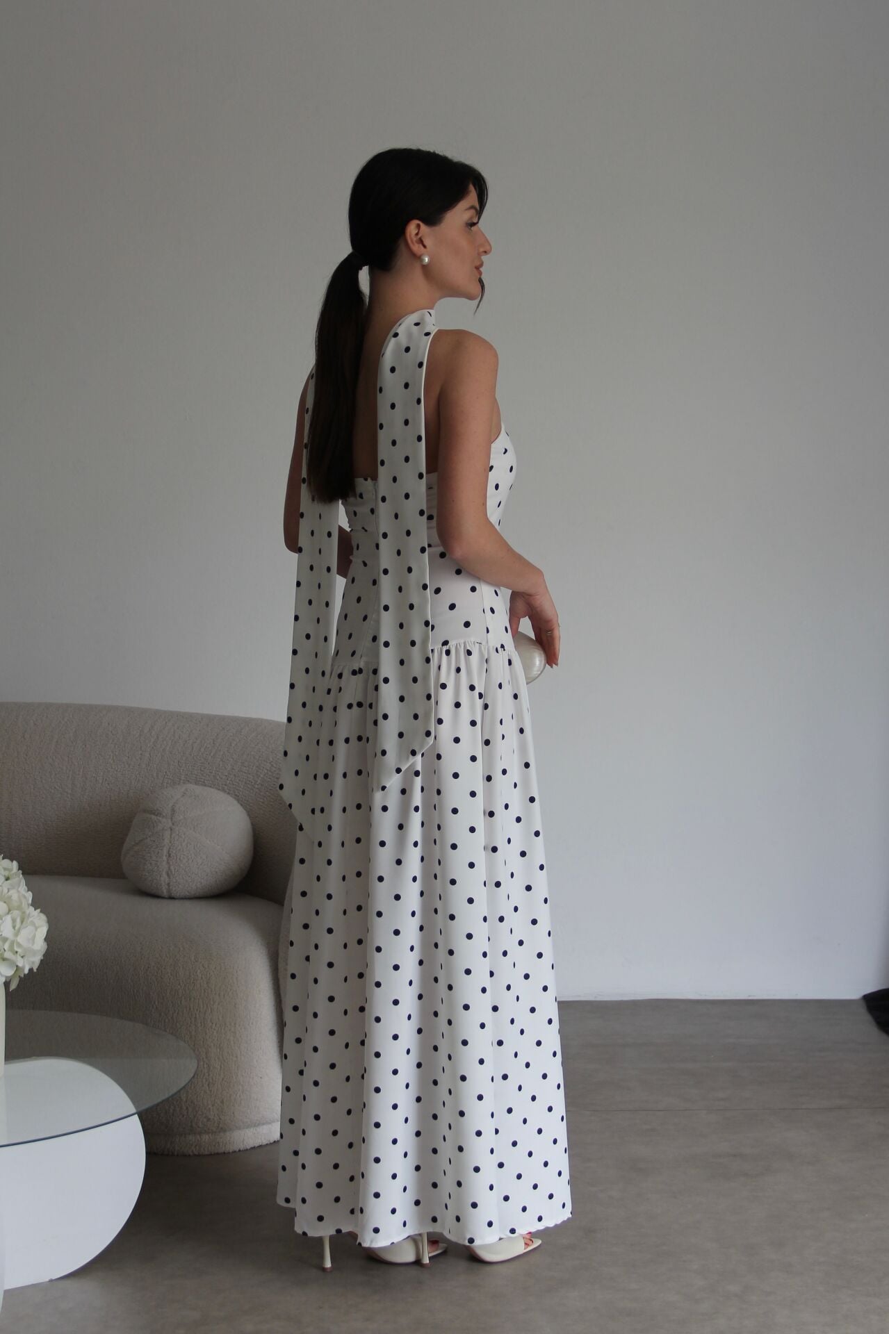 Şal Detaylı Straplez Yaka Maxi Uzun Boy Puantiyeli Elbise