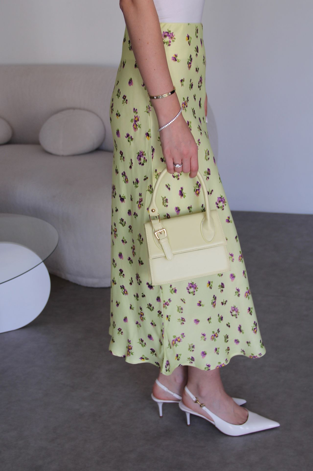 Sarı Çiçek Desenli Beli Lastikli Verev Kesim Midi Boy Premium Saten Etek