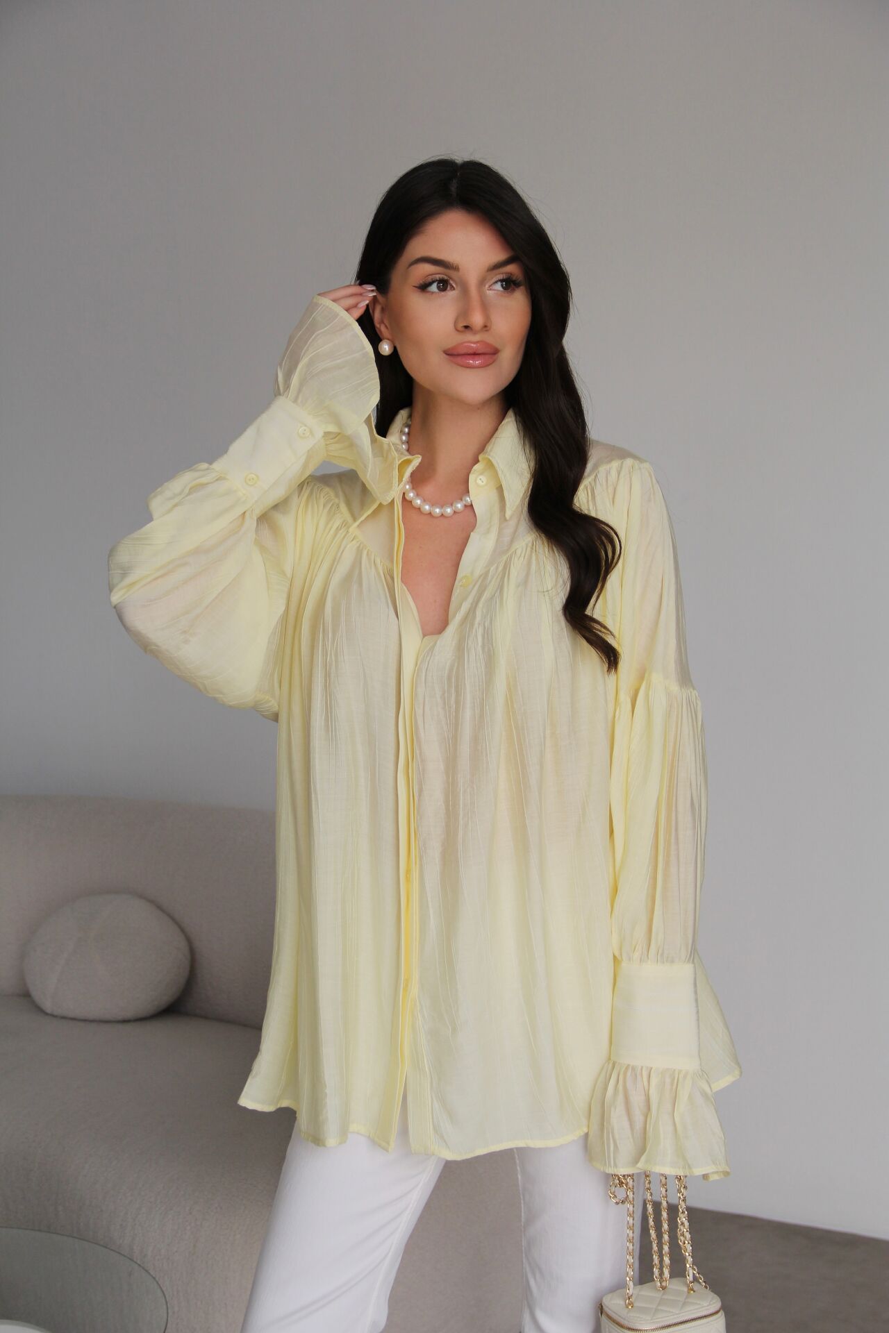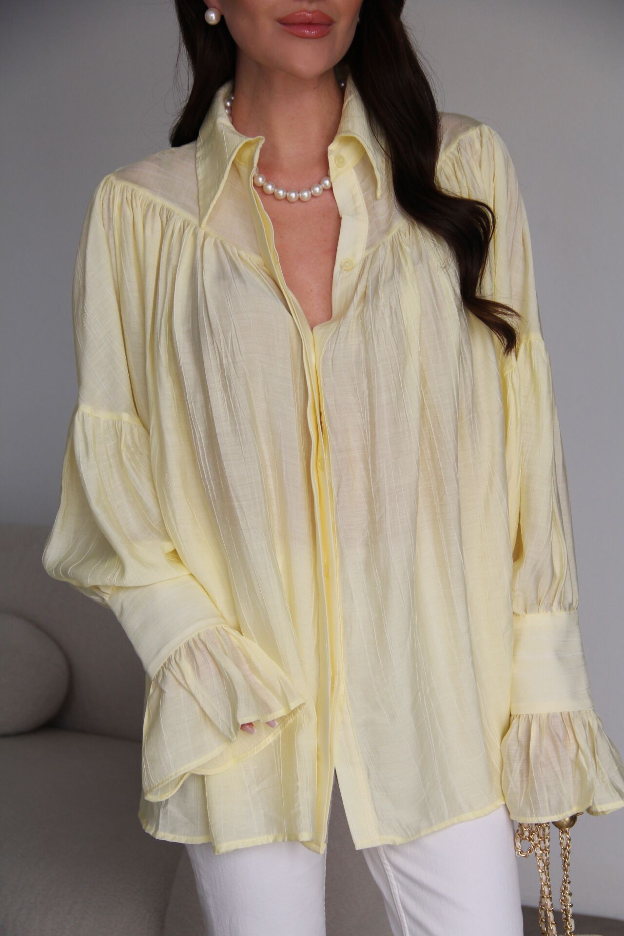 Sarı Vintage Büzgü Kol Detaylı Premium Gömlek