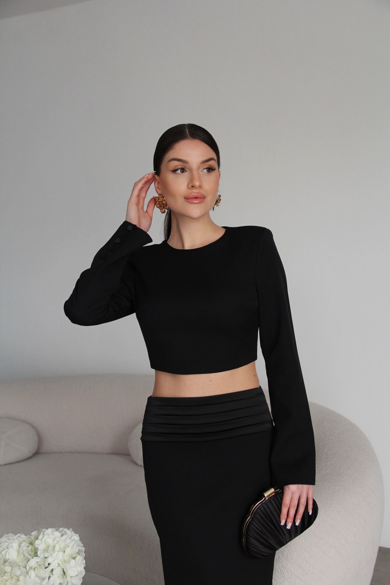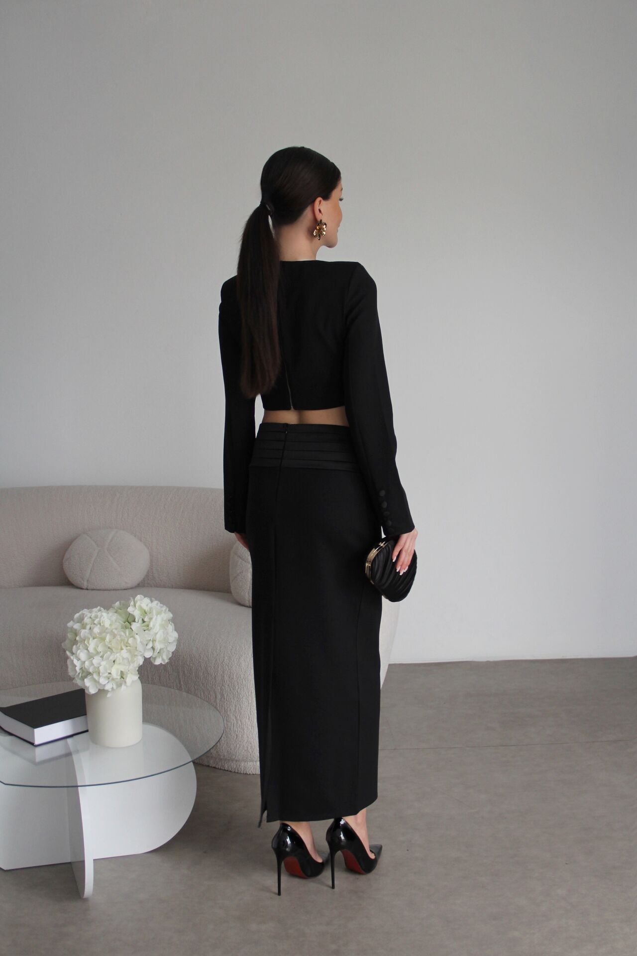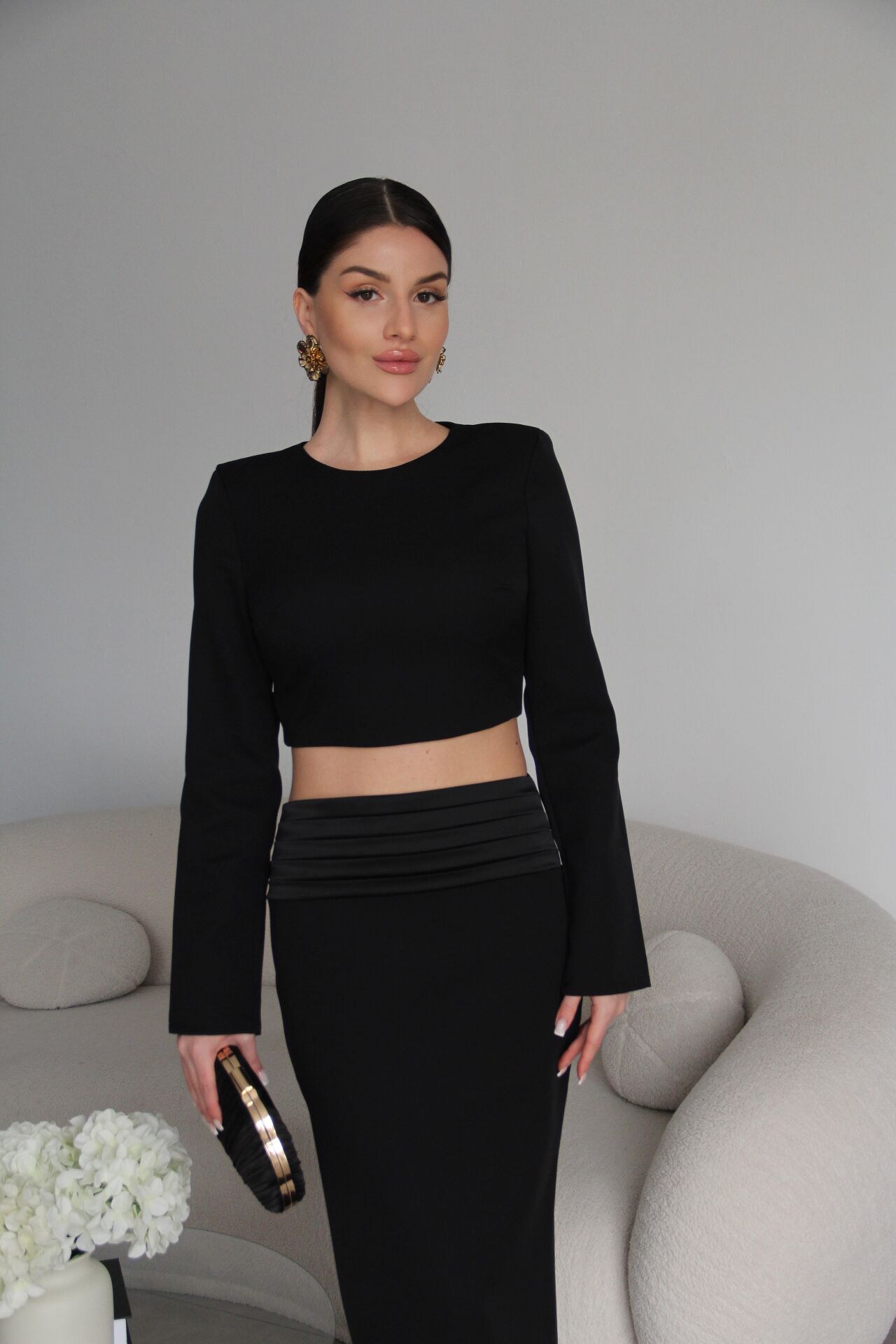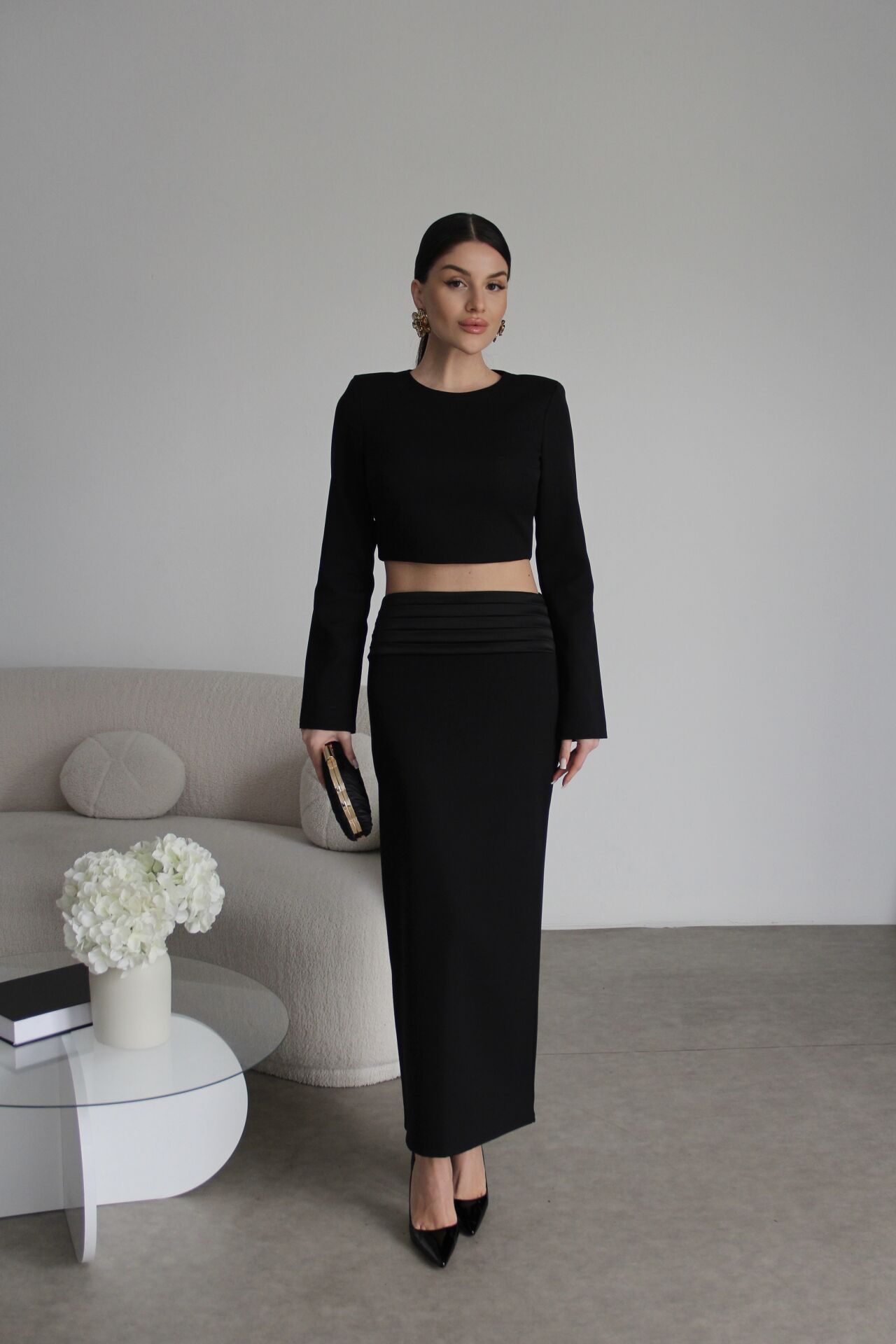 Saten Pile Detaylı Midi Etek ve Vatkalı Bluz Alt Üst Premium Siyah Takım