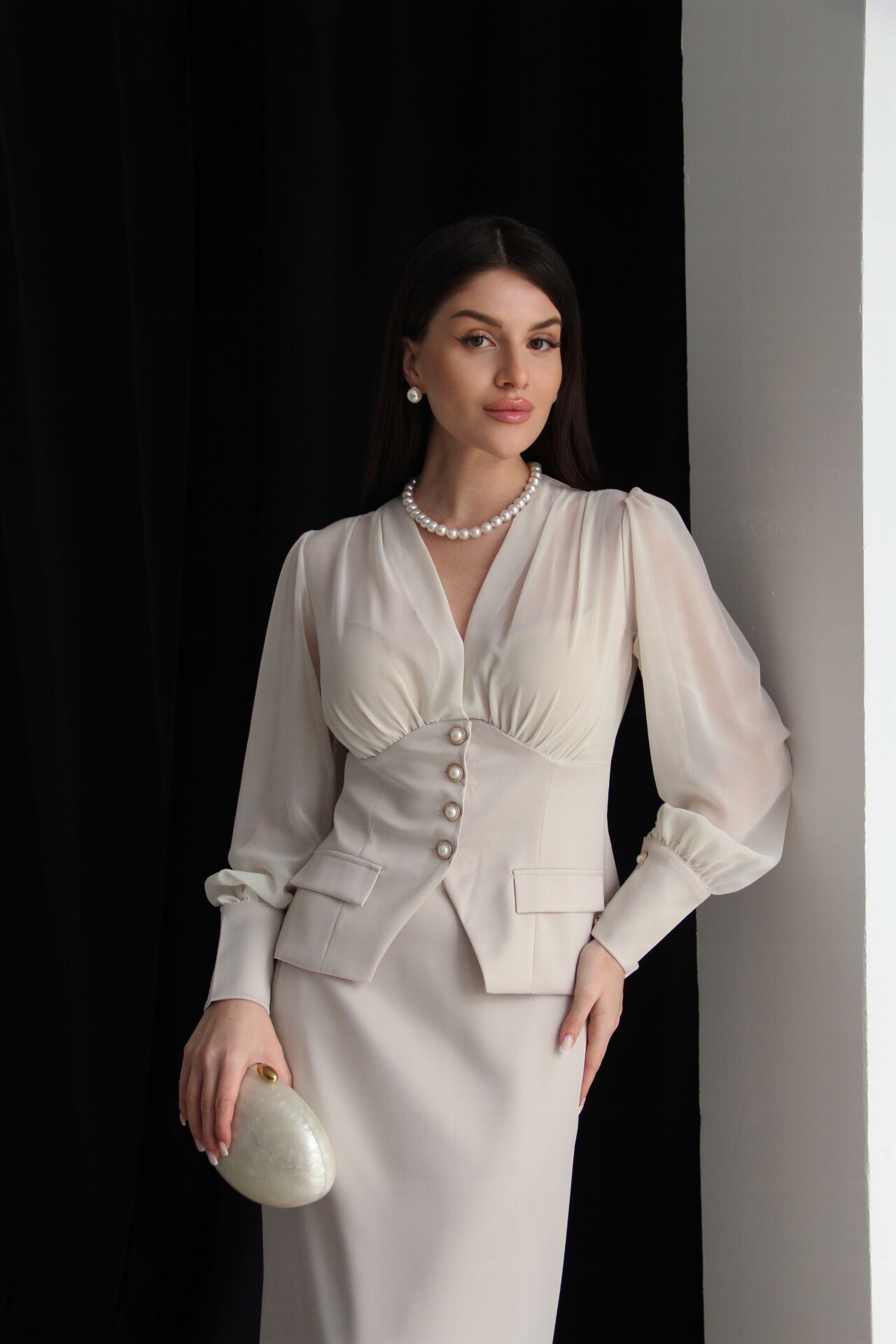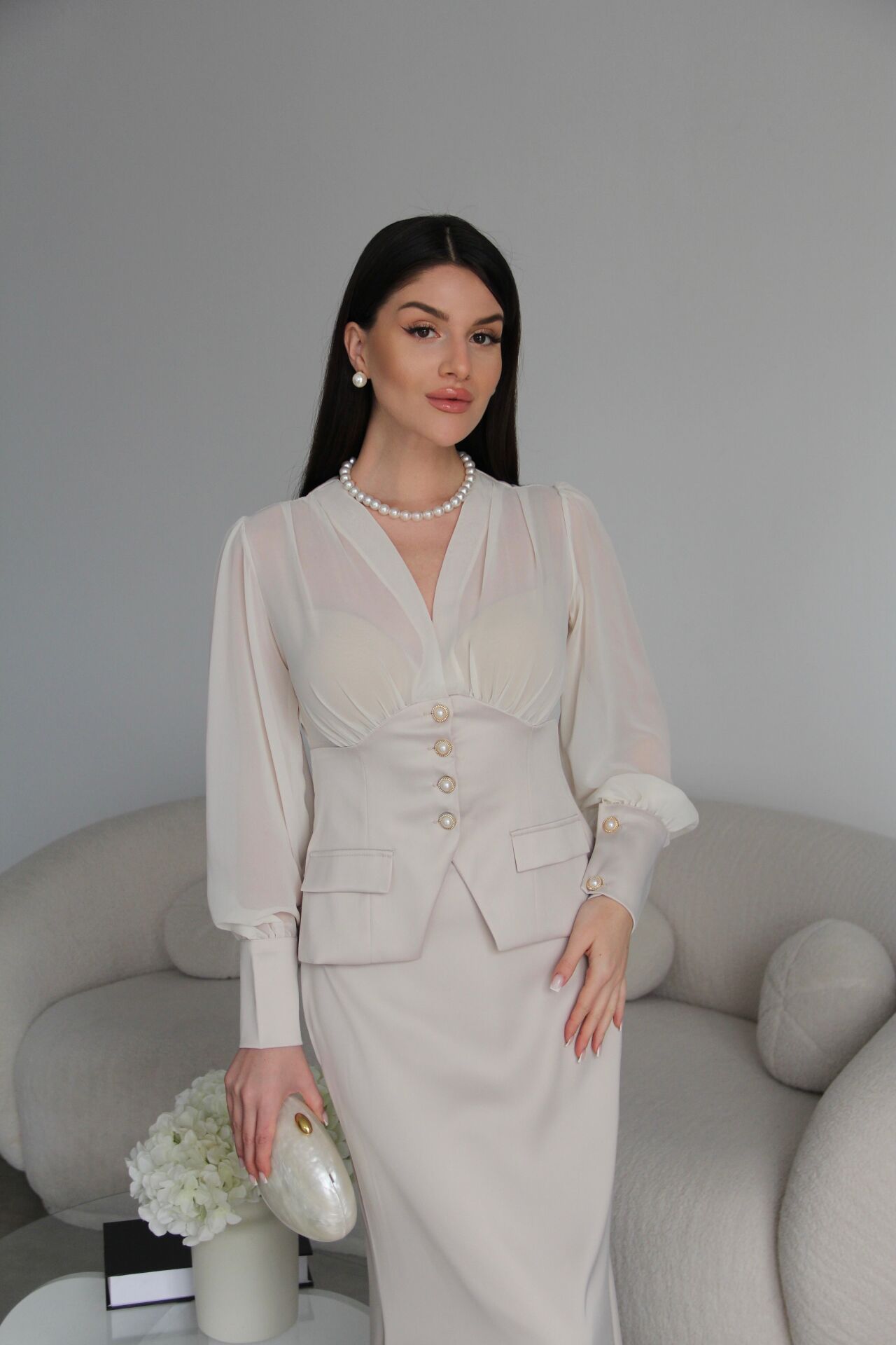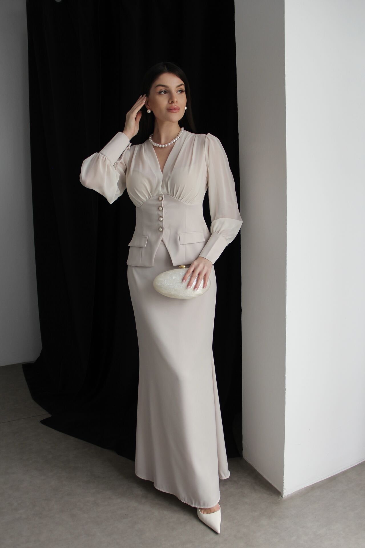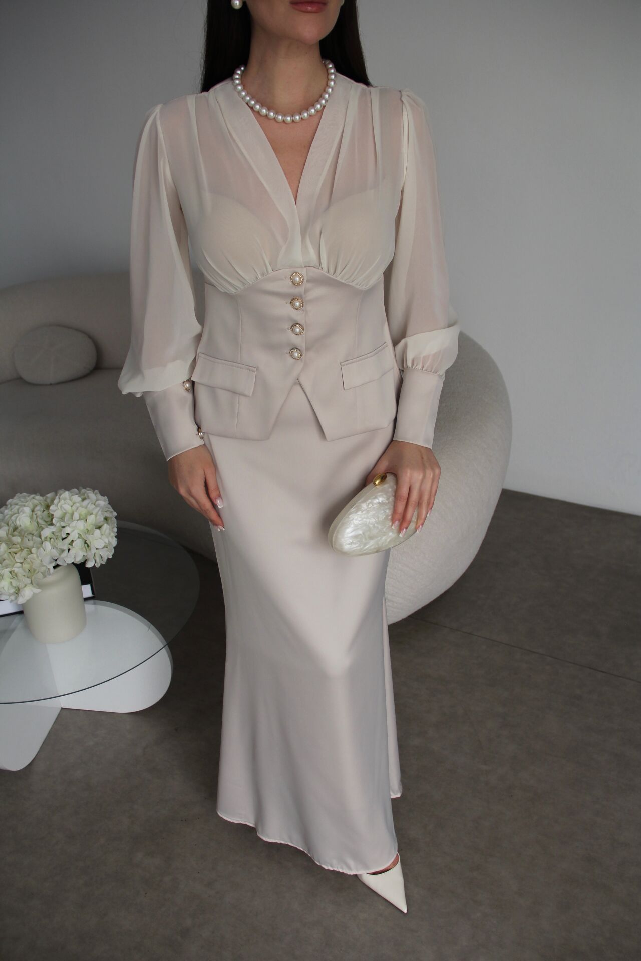 Şifon Garnili inci Düğmeli Transparan Bluz ve Maxi Etekli Alt Üst Premium Saten Takım
