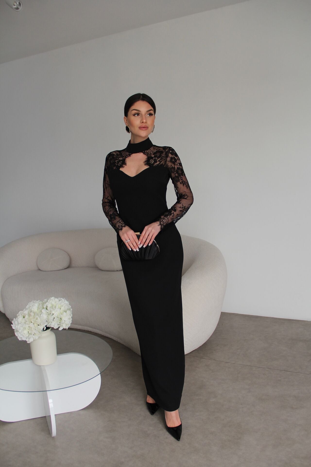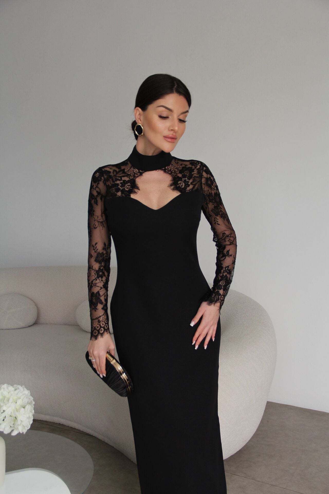 Sırt Dekolteli Dantel Detaylı Maxi Uzun Boy Premium Elbise