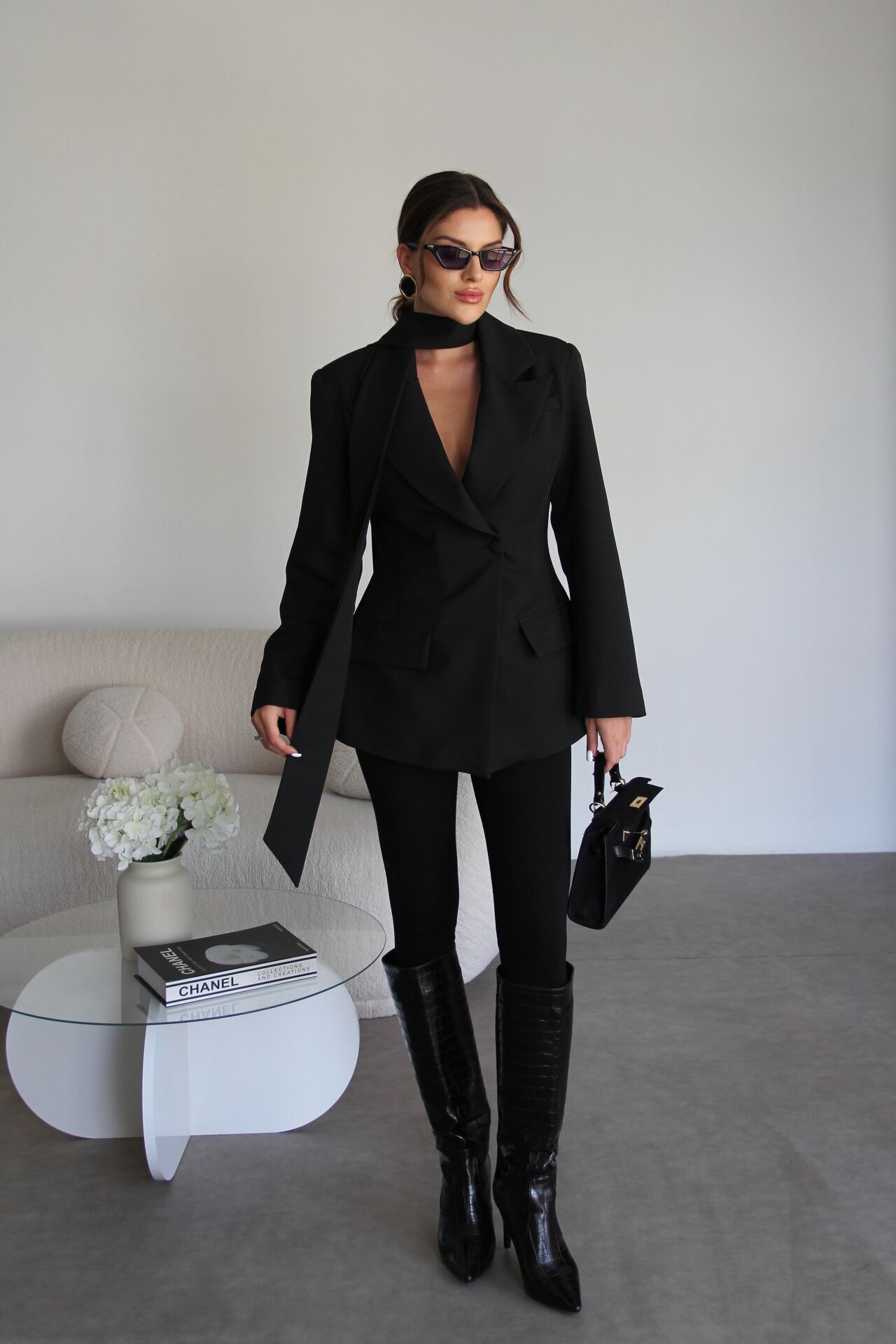 Siyah Bele Oturan Kuşak Detaylı Premium Tasarım Blazer Ceket (Ön Sipariş:17:11)