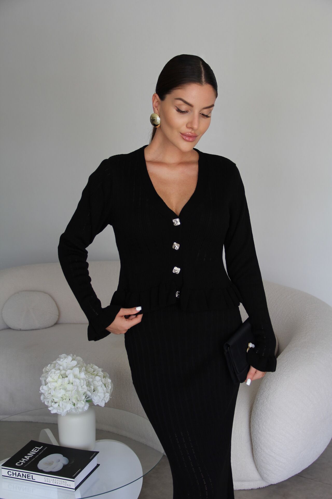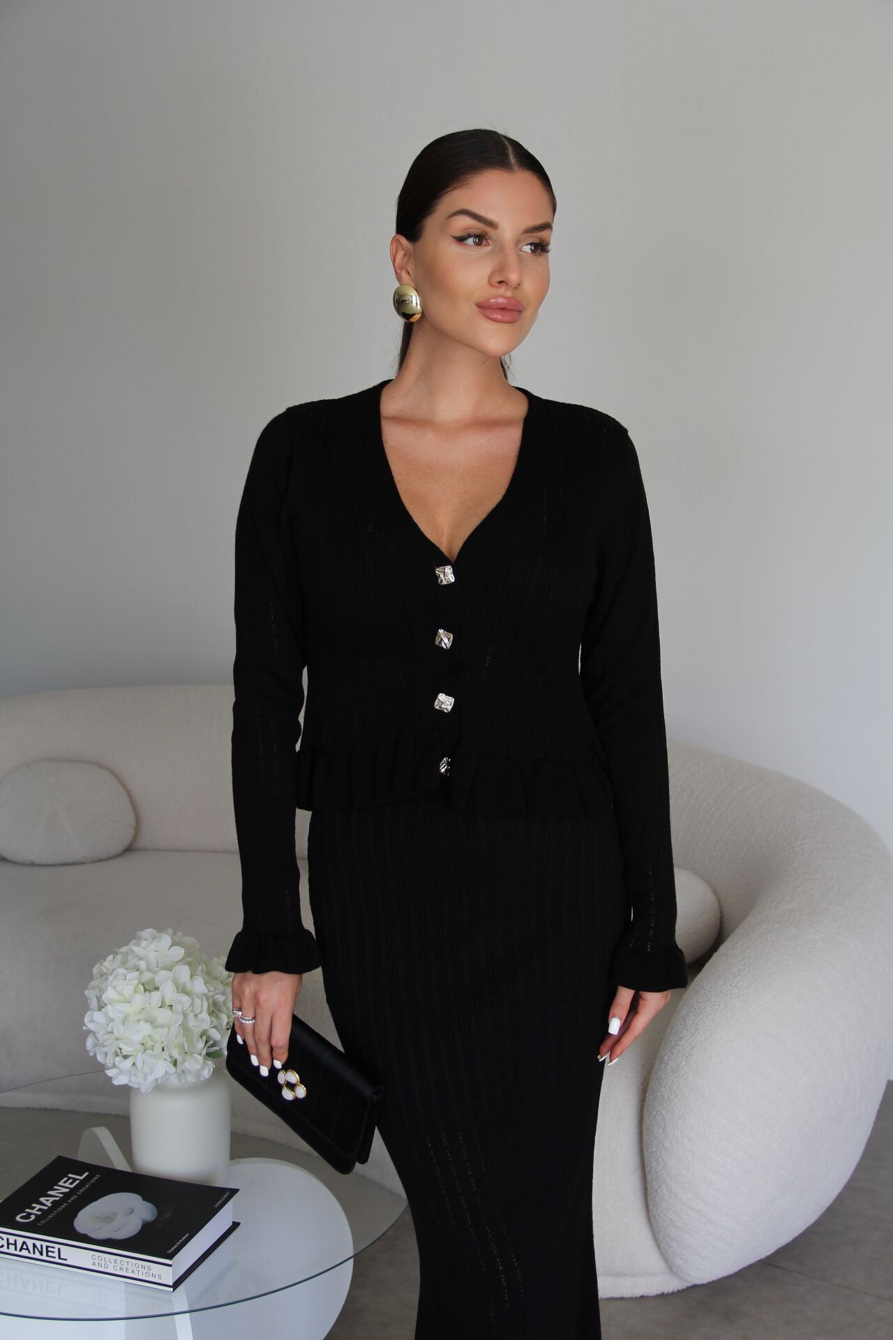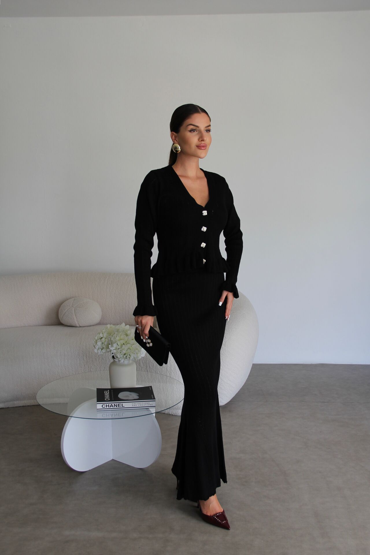 Siyah Düğme Detaylı V Yaka Hırka ve Maxi Uzun Etekli Premium Triko Takım