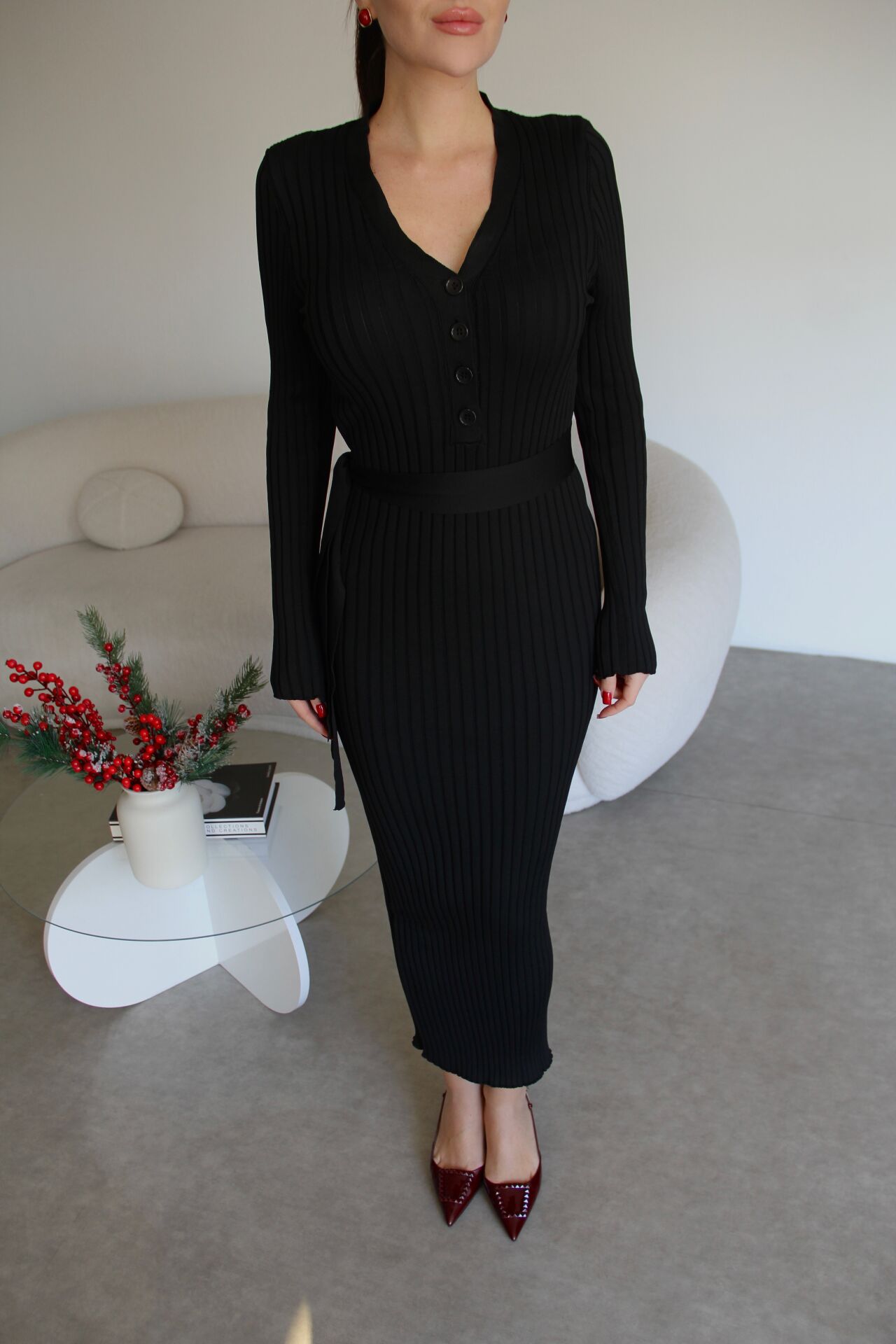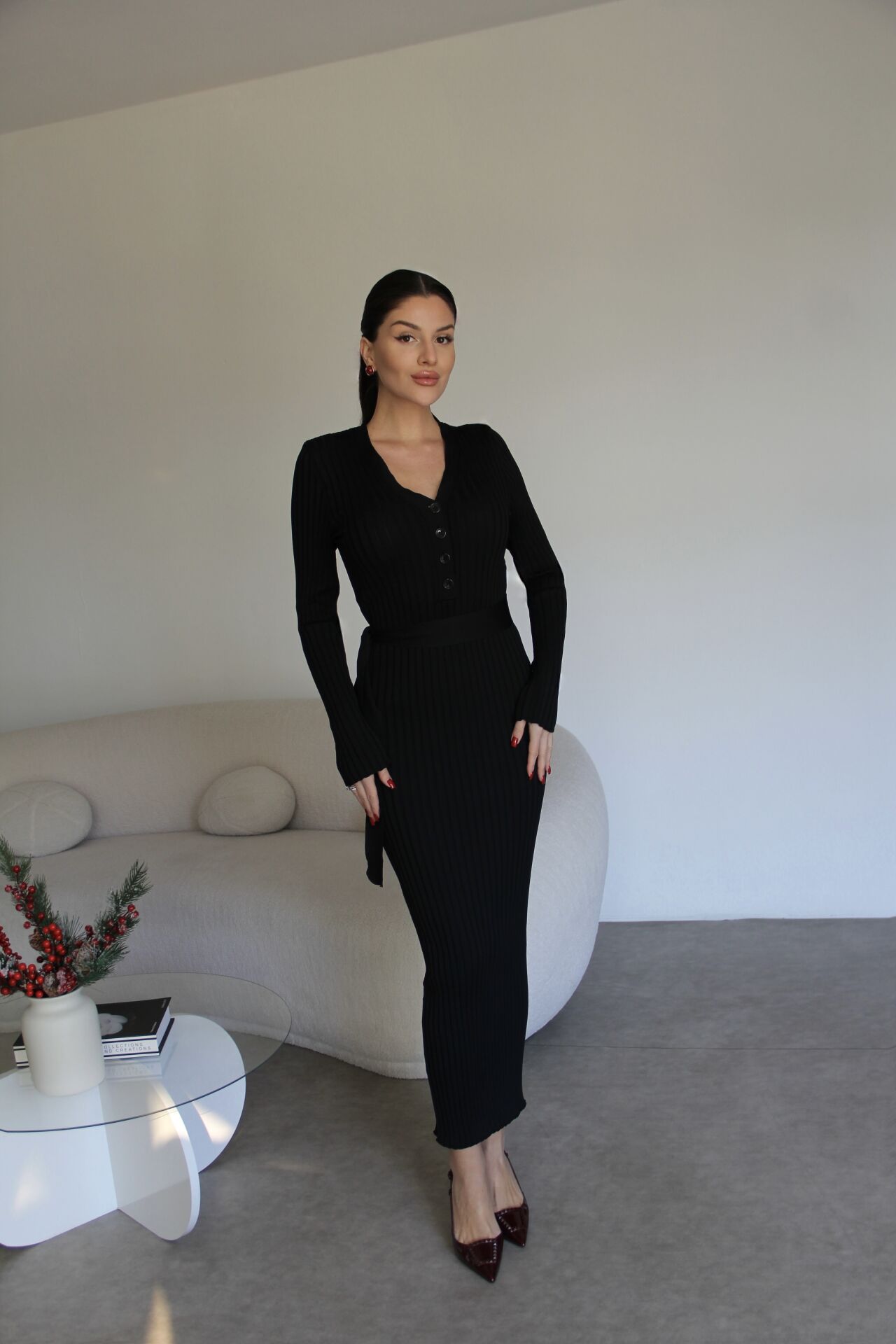 Siyah Düğmeli V Yaka Kuşaklı Bodycon Maxi Örme Kalem Triko Elbise