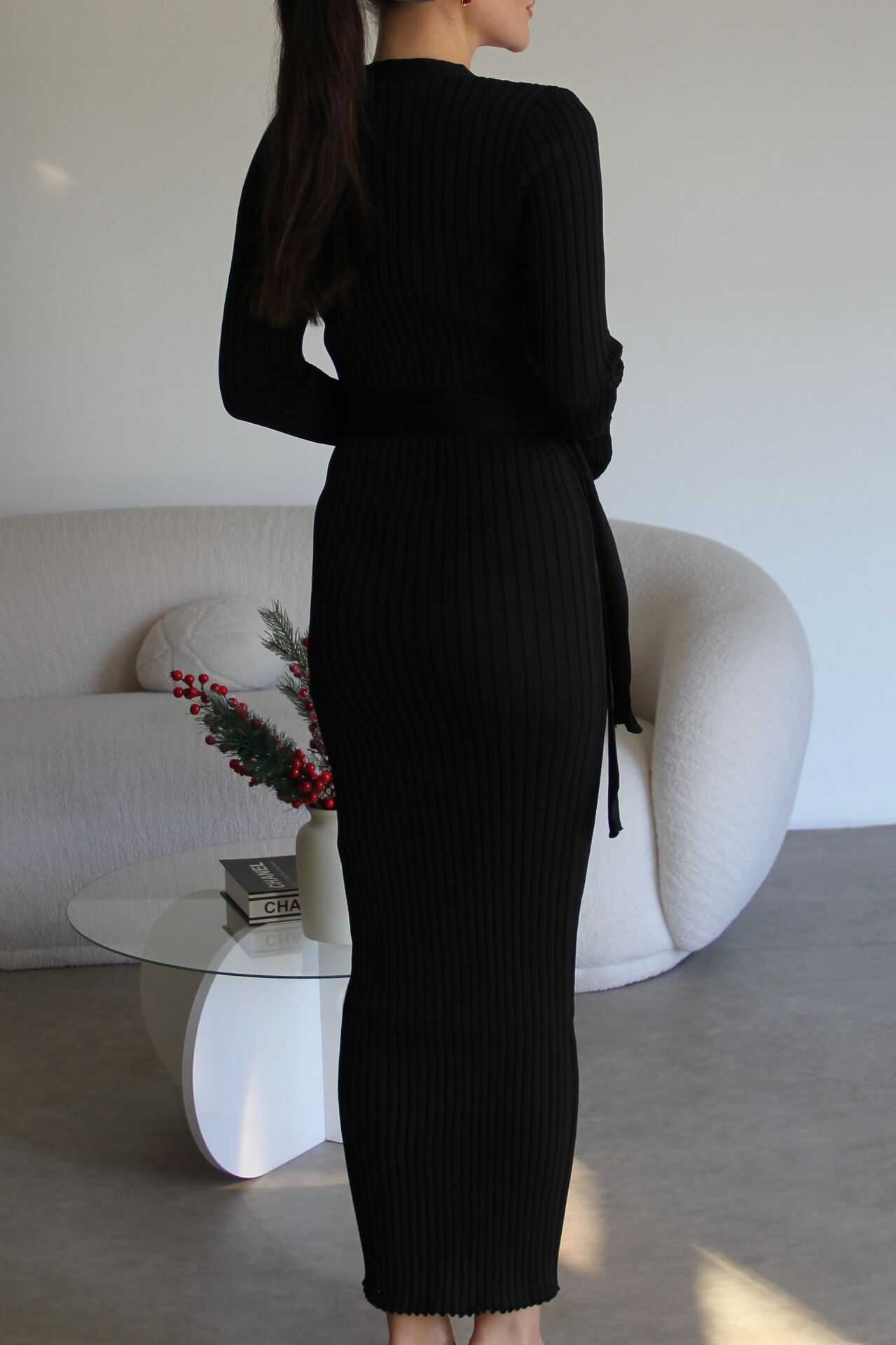 Julidress Yüksek Kalite, Siyah V Yaka,Kuşaklı, Fitilli, Bodycon(Vücudu saran), Maxi, Örme Triko, Kalem Elbise