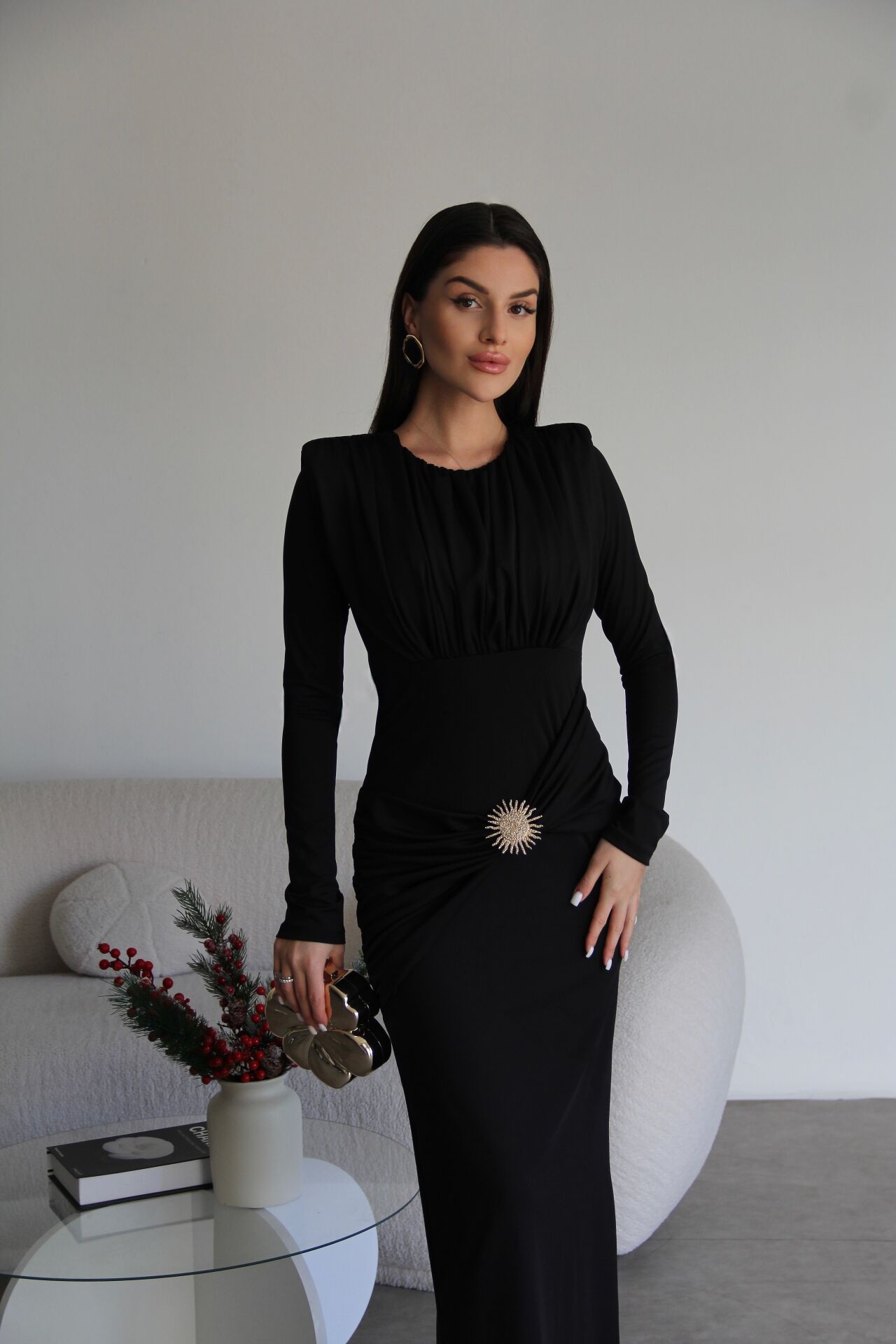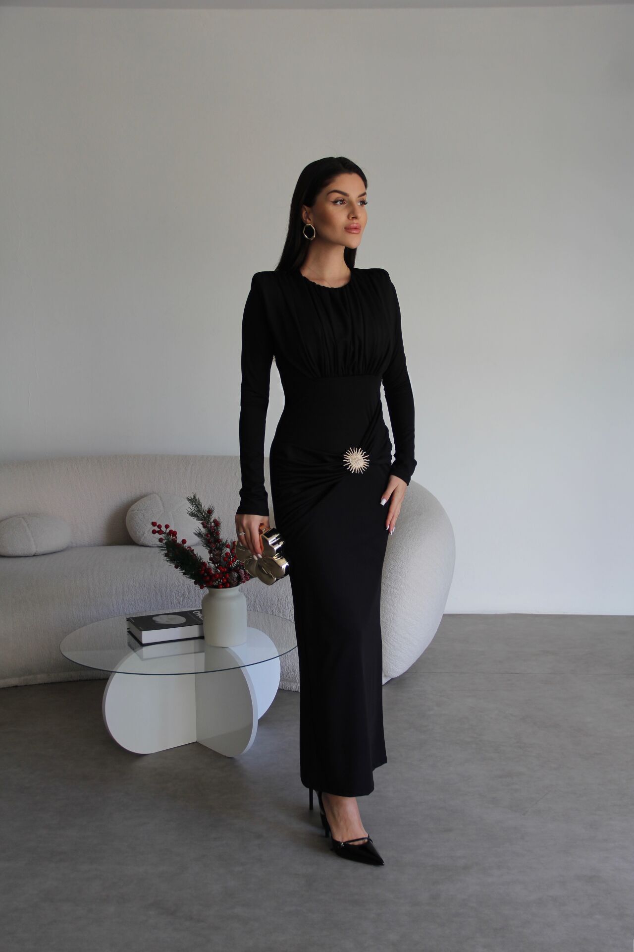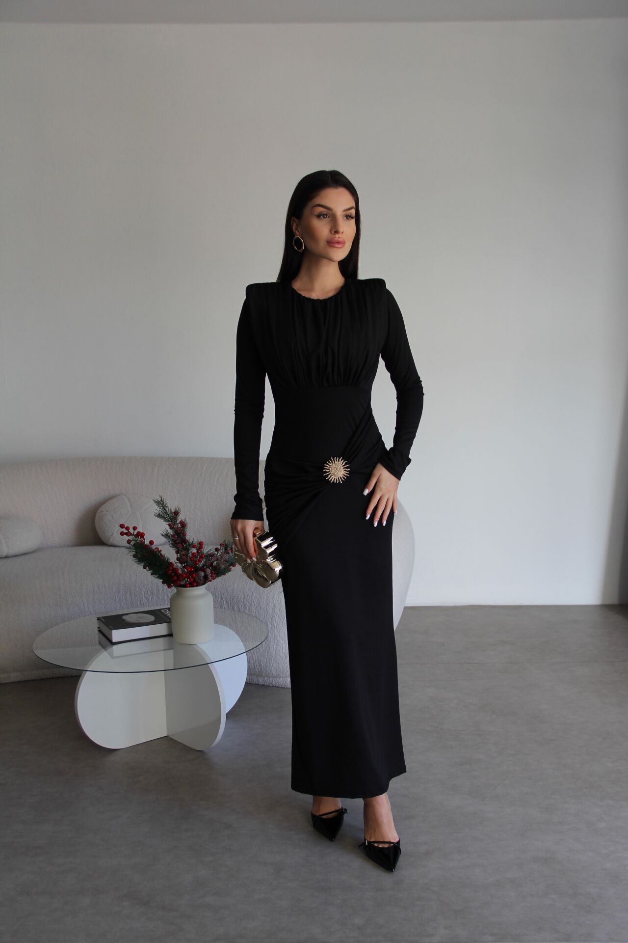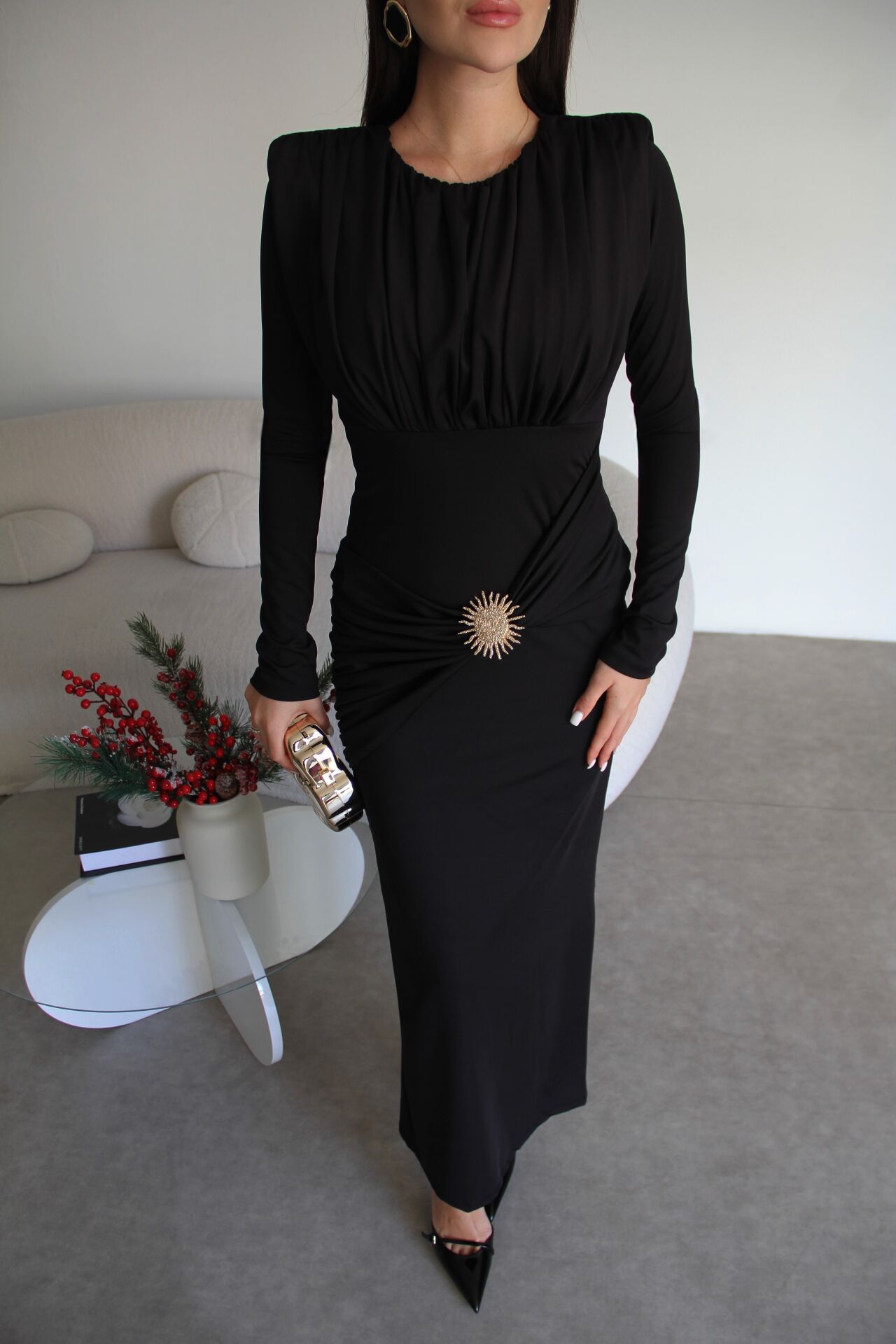 Siyah Gold Broş Detaylı Midi Boy Premium Büzgülü Elbise