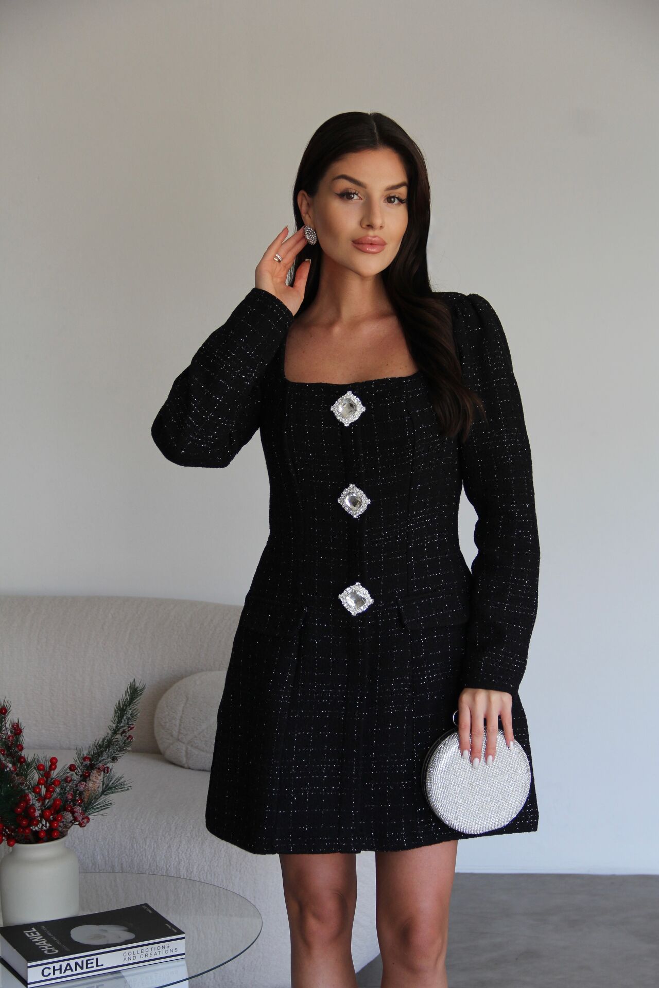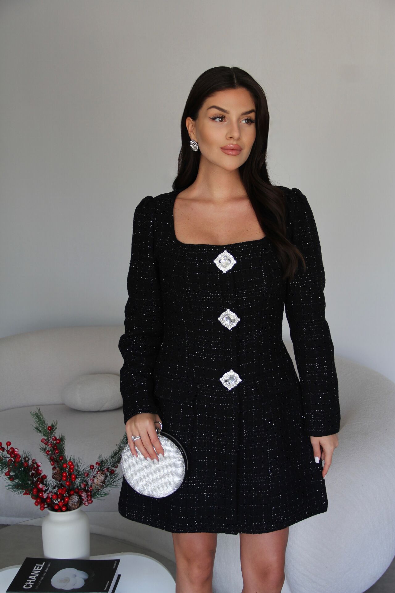 Siyah Kare Yaka Simli Broş Detaylı Taş işlemli Mini Boy Premium Tüvit Elbise