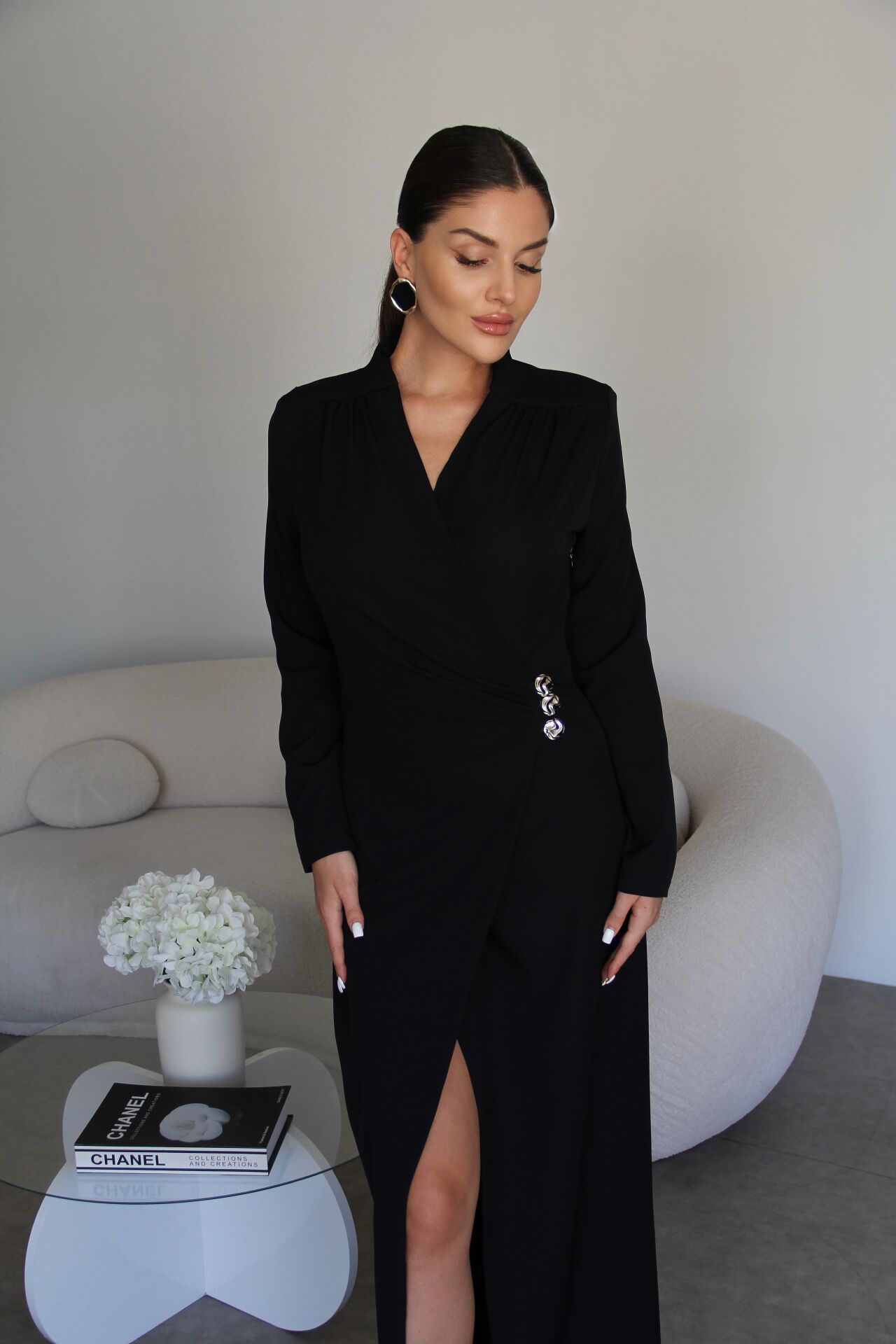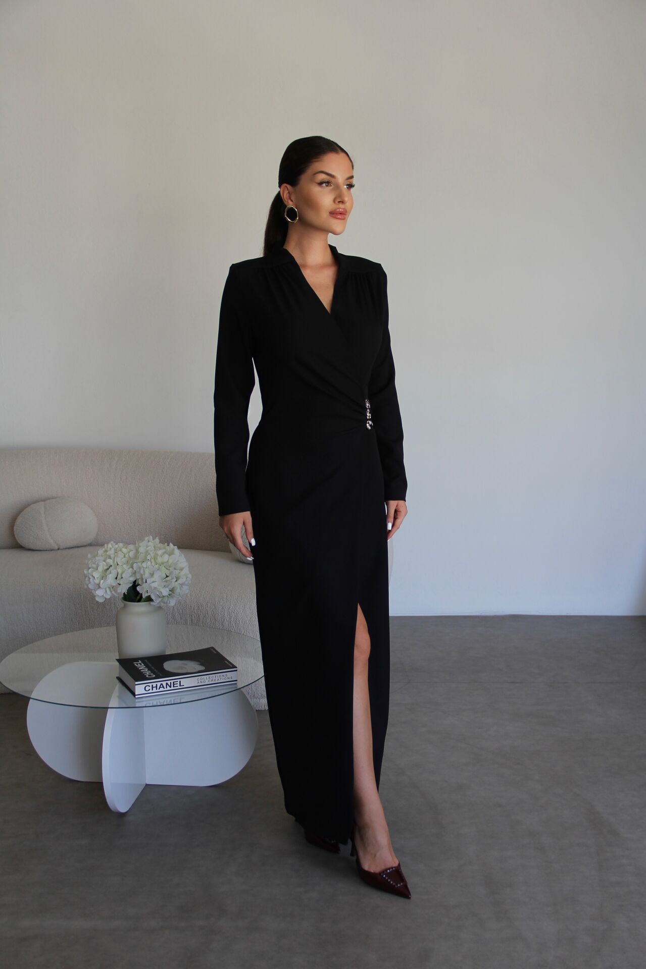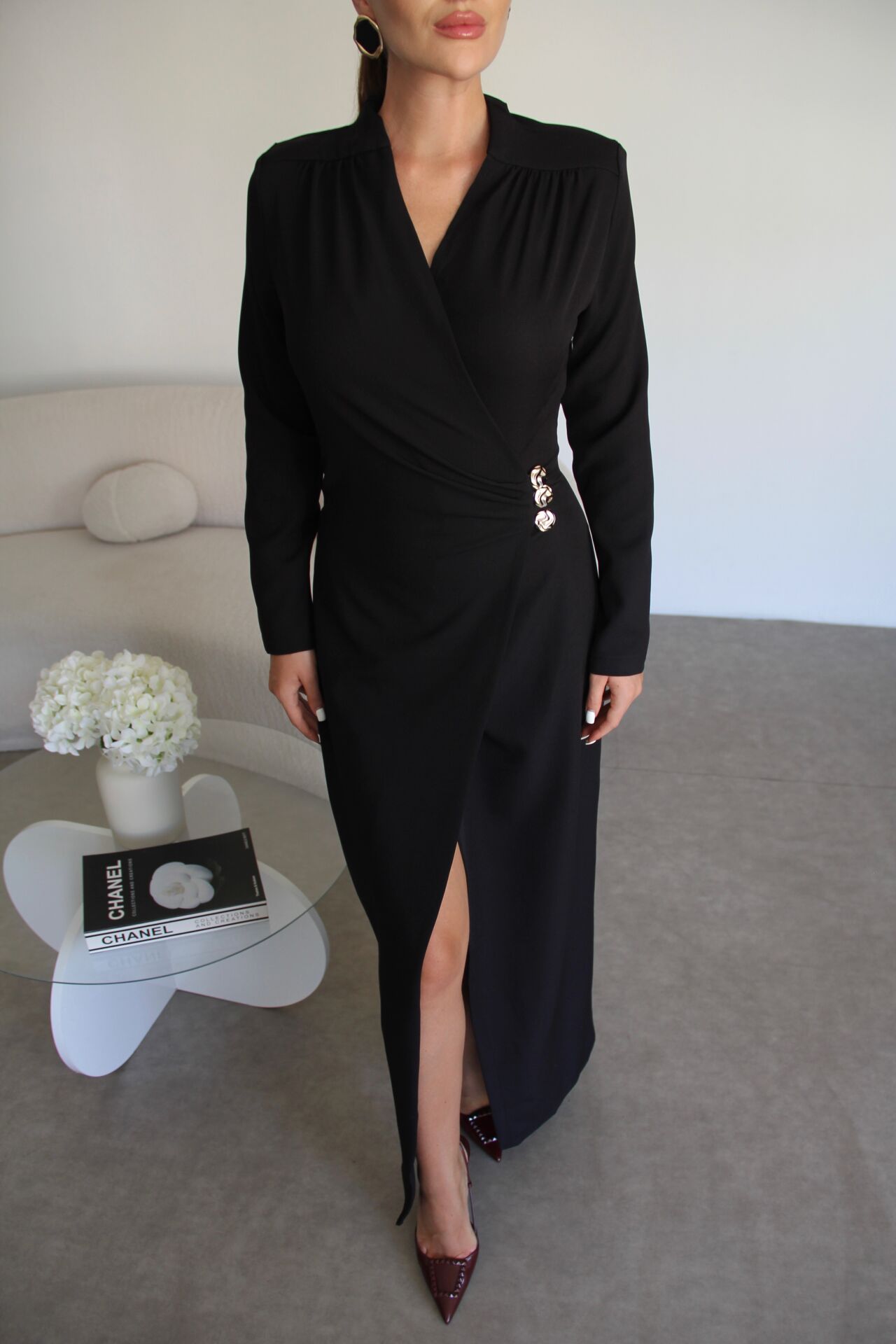 Siyah Kruvaze Yaka Drapeli Gold Düğme Detaylı Uzun Premium Elbise