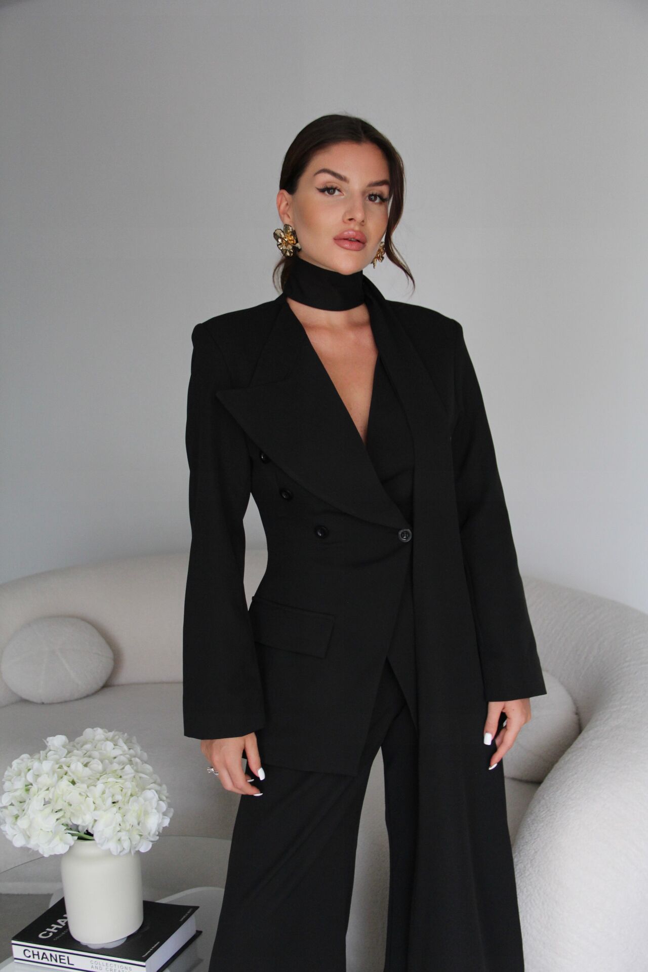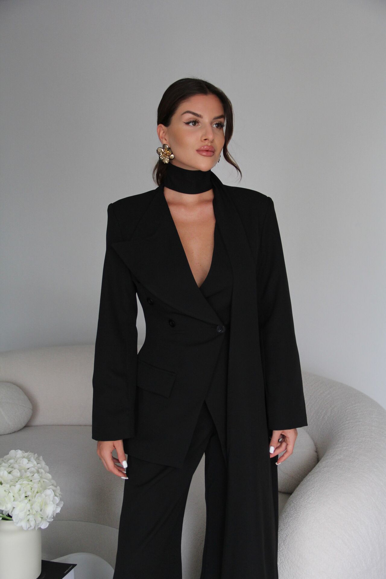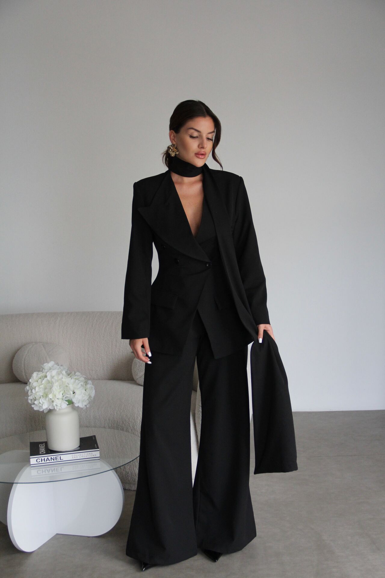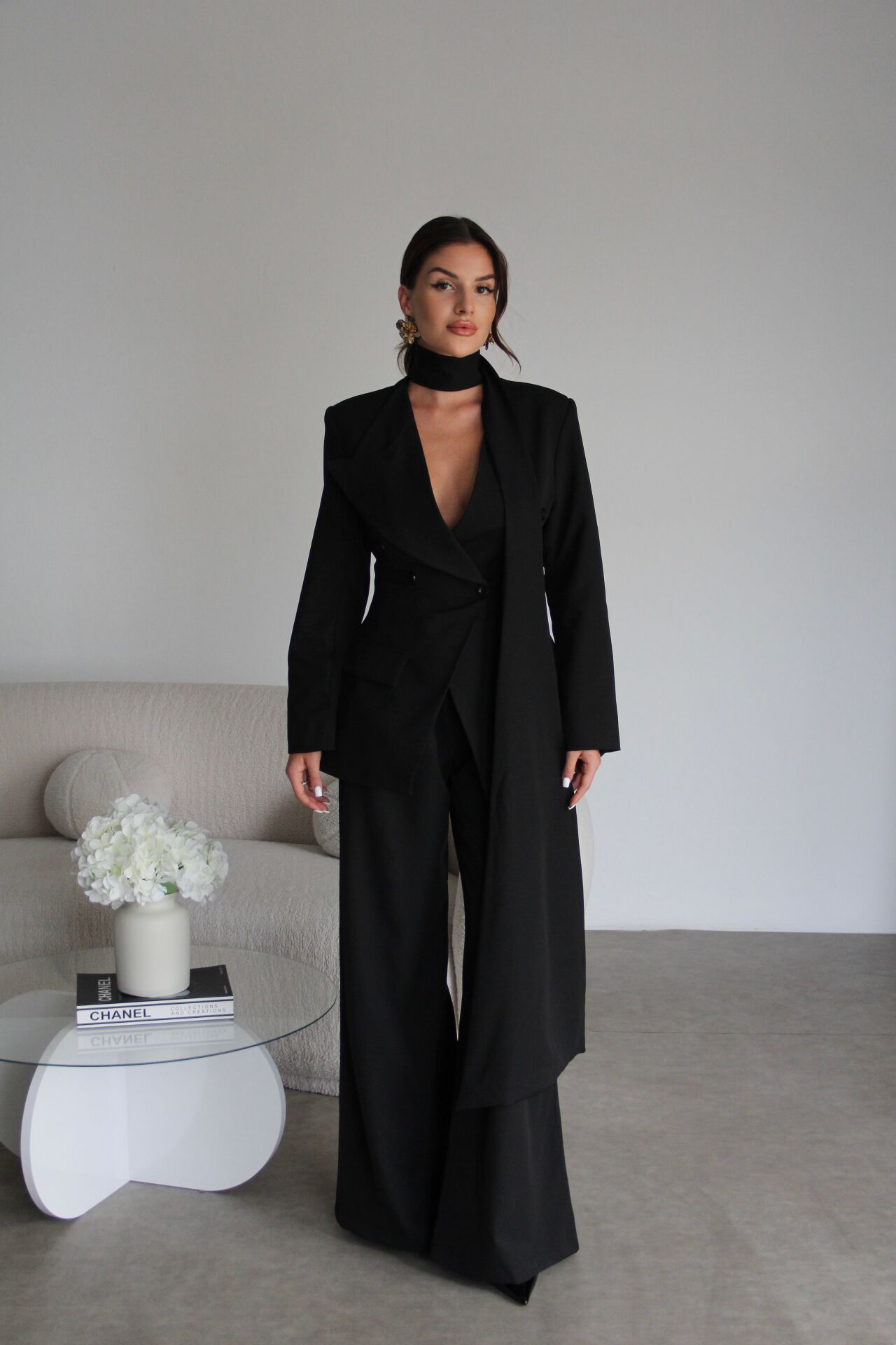 Siyah Şallı Kruvaze Ceket ve Palazzo Pantolon Premium Tasarım Takım