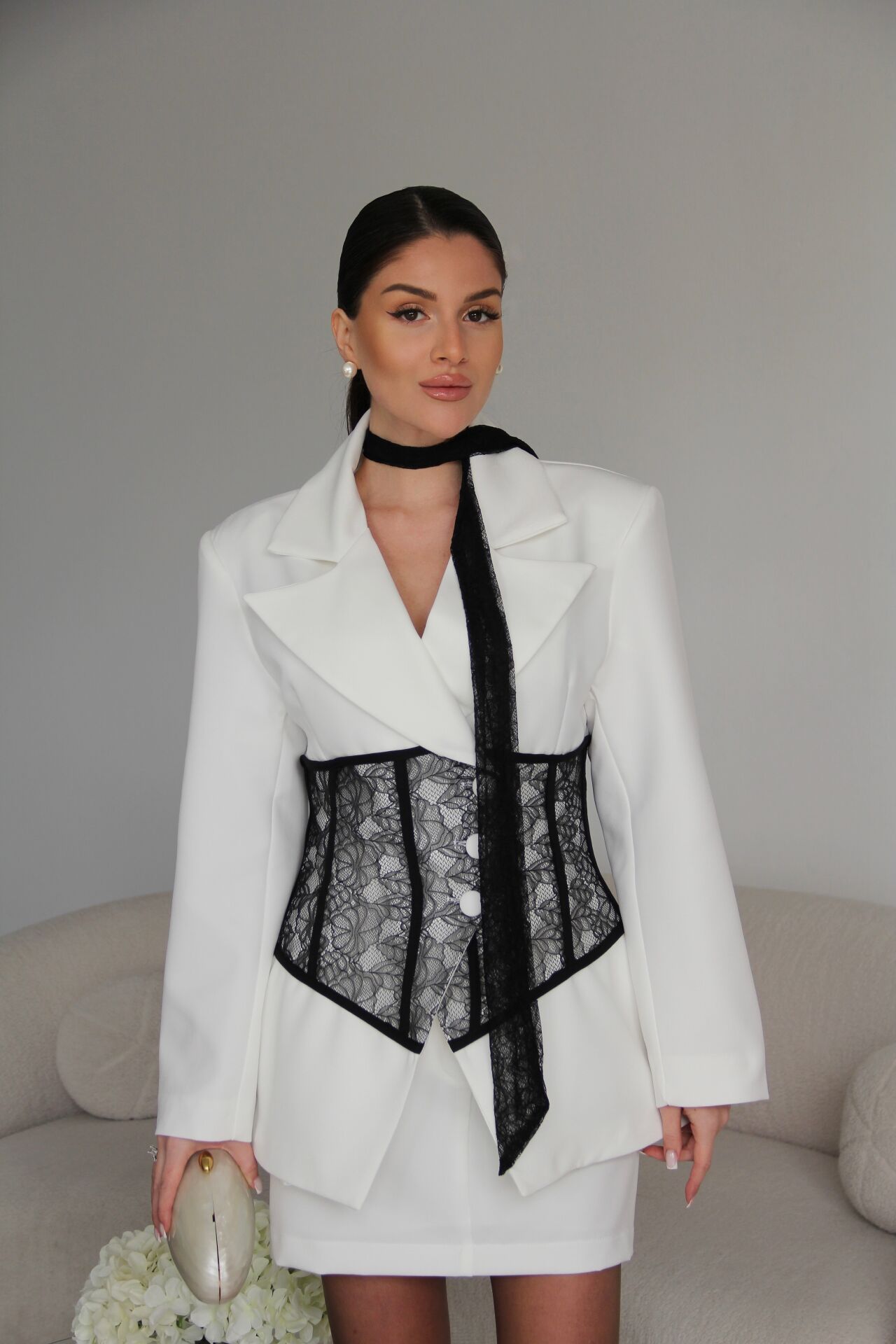 Siyah Tül Şallı Dantel Detaylı Korsajlı Ceket ve Mini Etekli Premium 3'lü Beyaz Takım