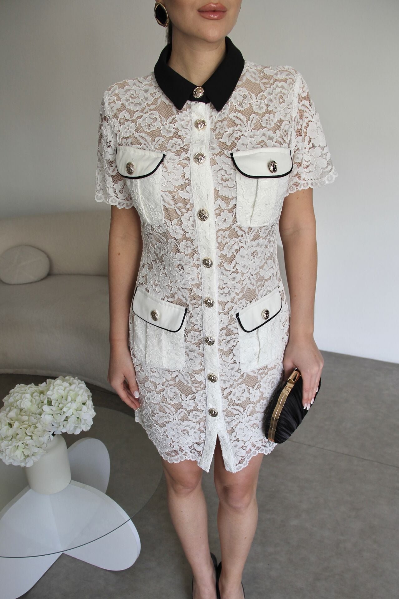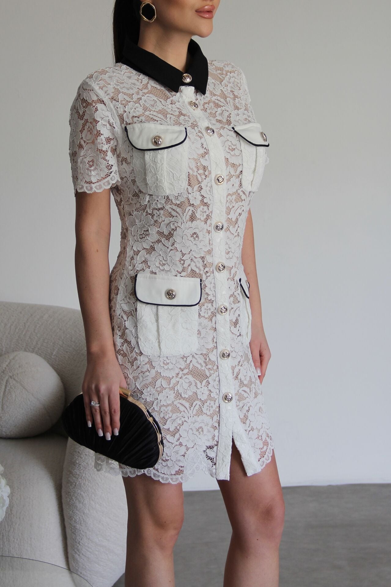Siyah Yaka Gold Düğmeli Biye Detaylı Premium Mini Dantel Elbise