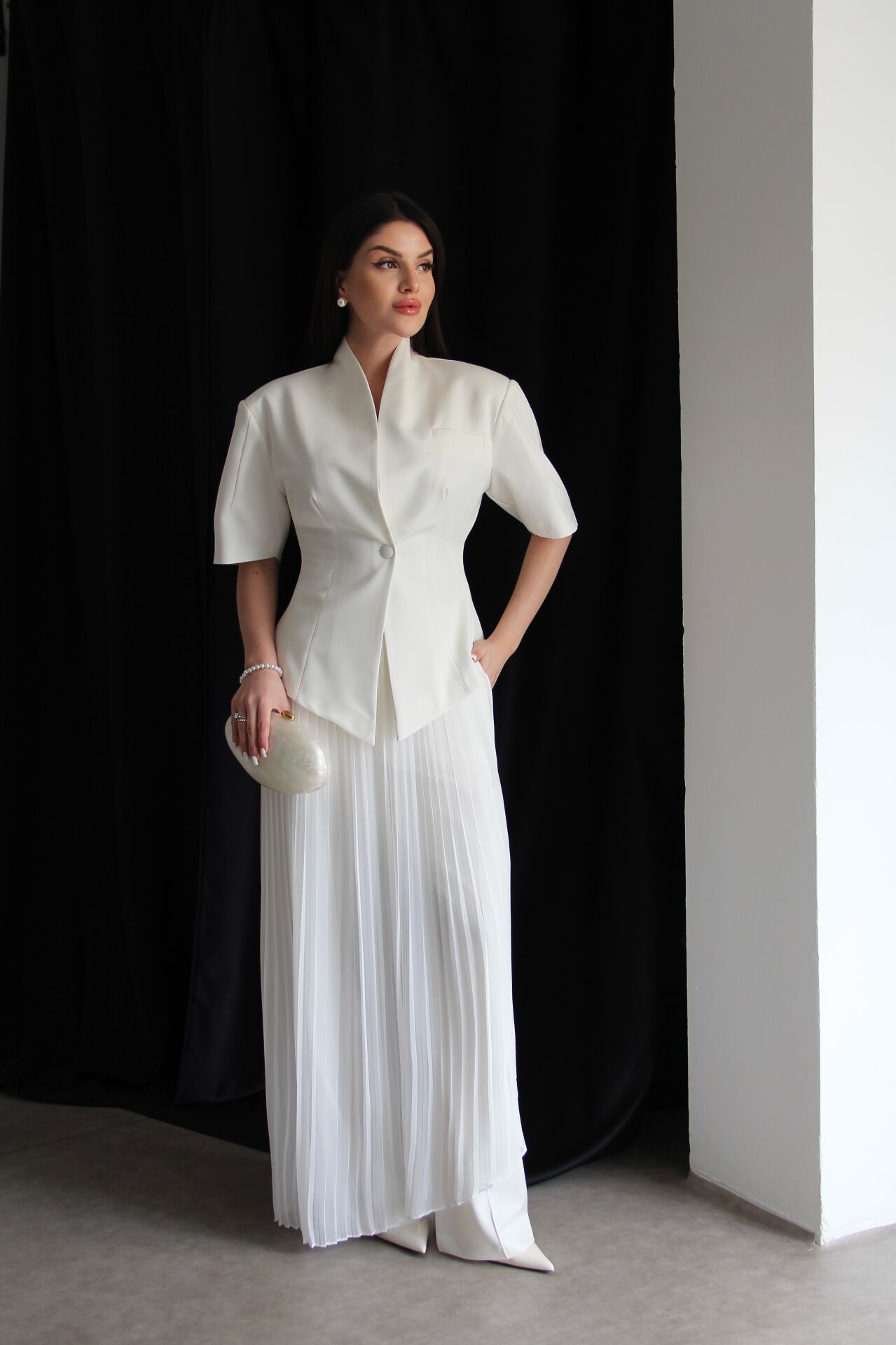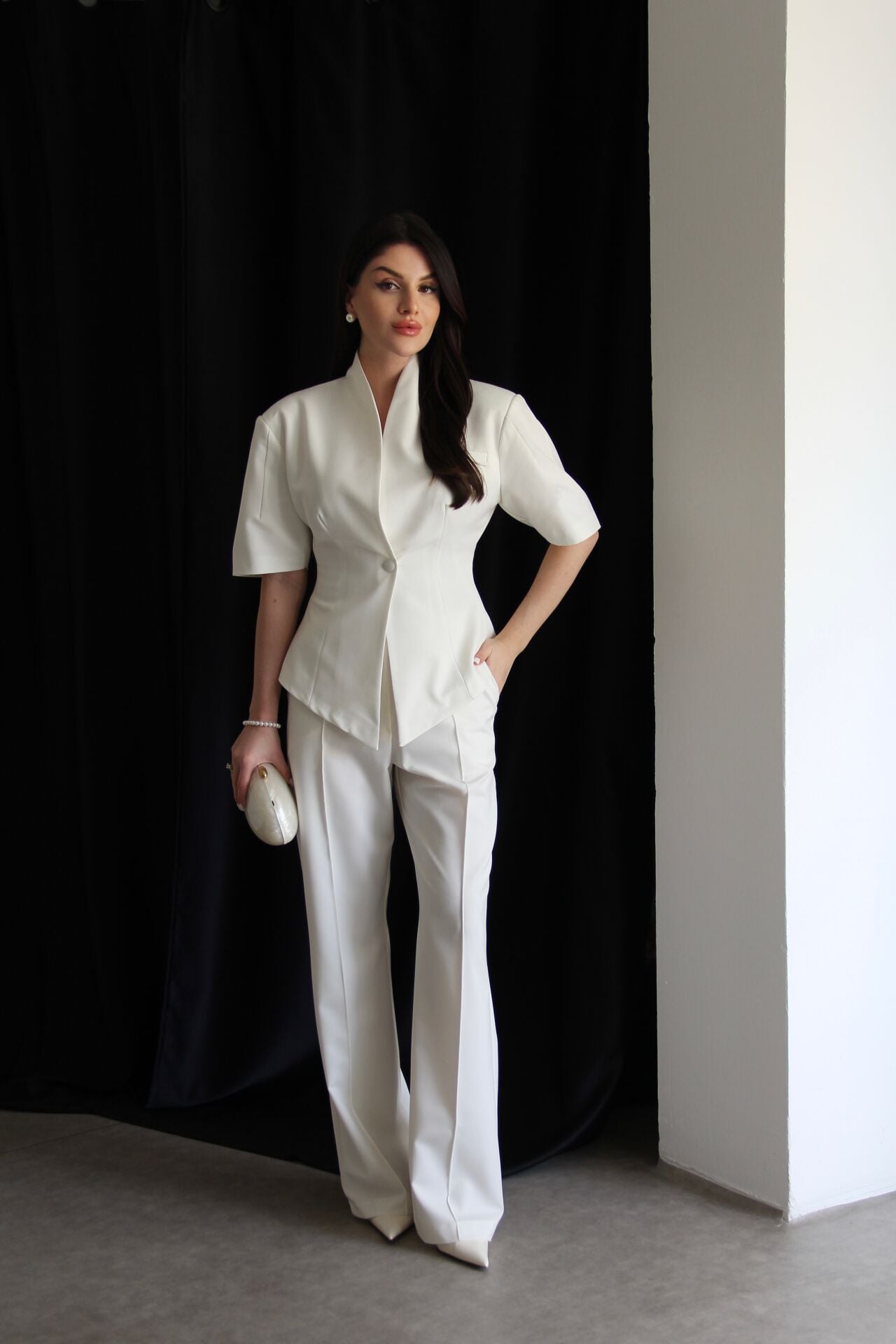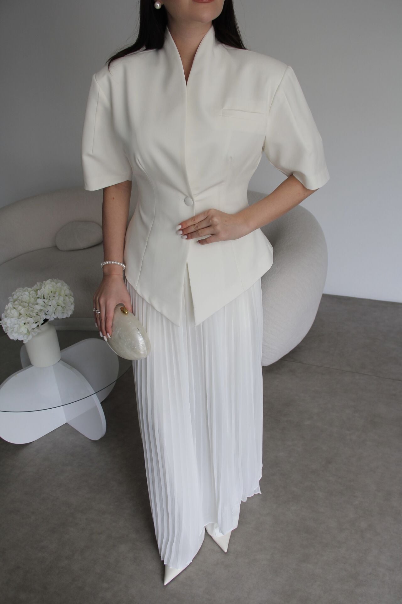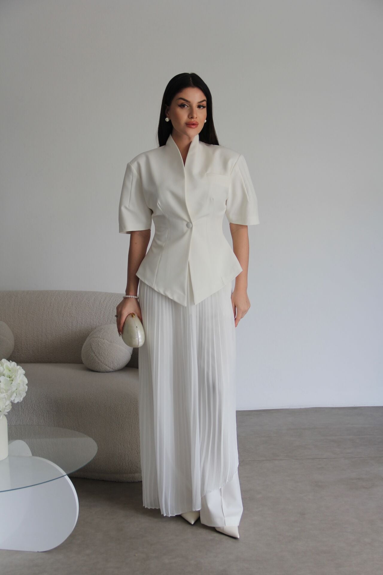 - - - Julidress.; Ekru Beyaz. Tasarım Tek Düğme Asimetrik Kesim Ceket ve Çıkabilir Piliseli Etekli Pantolon Alt Üst Premium 3'lü Takım.; Kumaş Türü: %93 Polyester %7 Elastan .; Ceket Boyu:Ortalama:70 cm, Pantolon boyu:108-110cm, Paça boyu:27 cm dir.;.; Model Boy : 176 cm .; Model Kilo : 55 kg.;.; Şık ve modern tasarımıyla dikkat çeken, tek düğmeli ceket ve piliseli etekli pantolon alt üst takım.; - Standart kol tipi ve kısa kol boyu ile konforlu bir kullanım sunar.; - V yaka detayı ile feminen bir görünüm kazandırır.; - Premium kalitesiyle öne çıkan bu 3'lü takım, özel günlerde ve davetlerde şıklığınızı tamamlar.; - Çıkabilir piliseli etek detayı sayesinde farklı kombinasyonlar oluşturmanıza olanak tanır.;