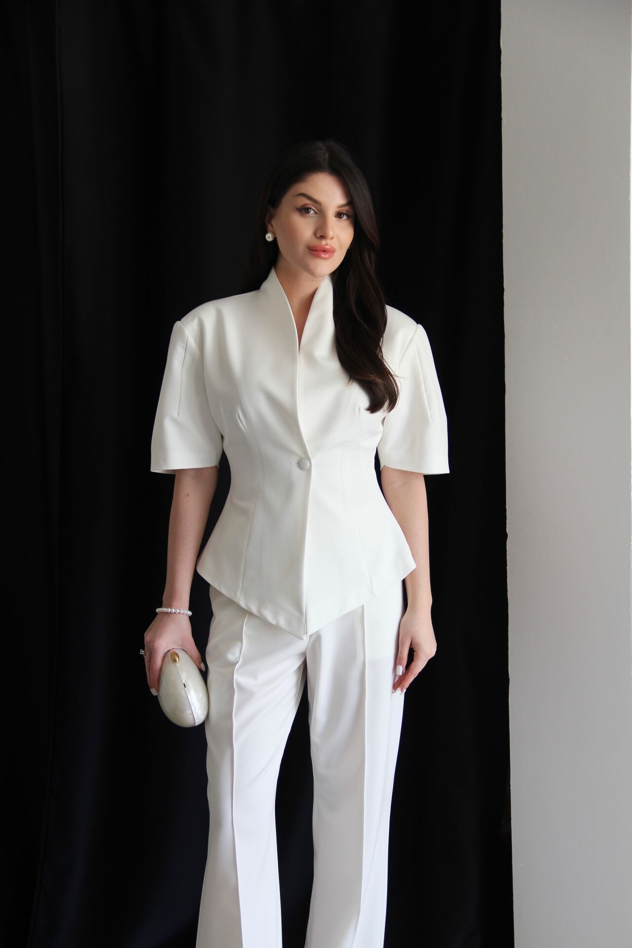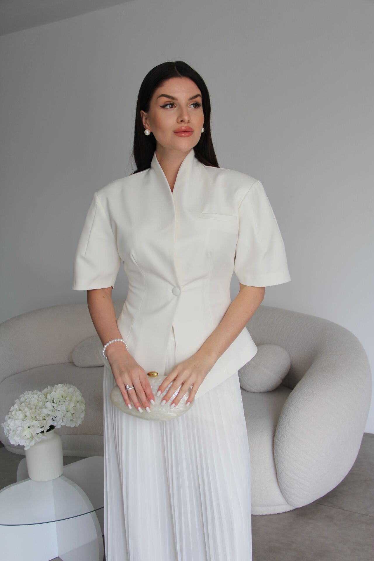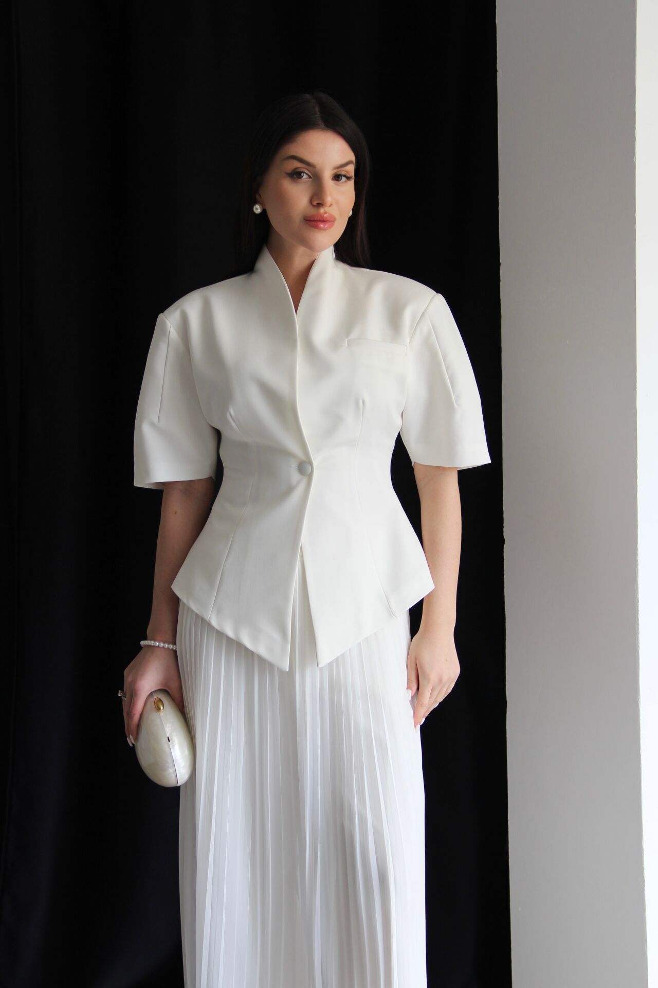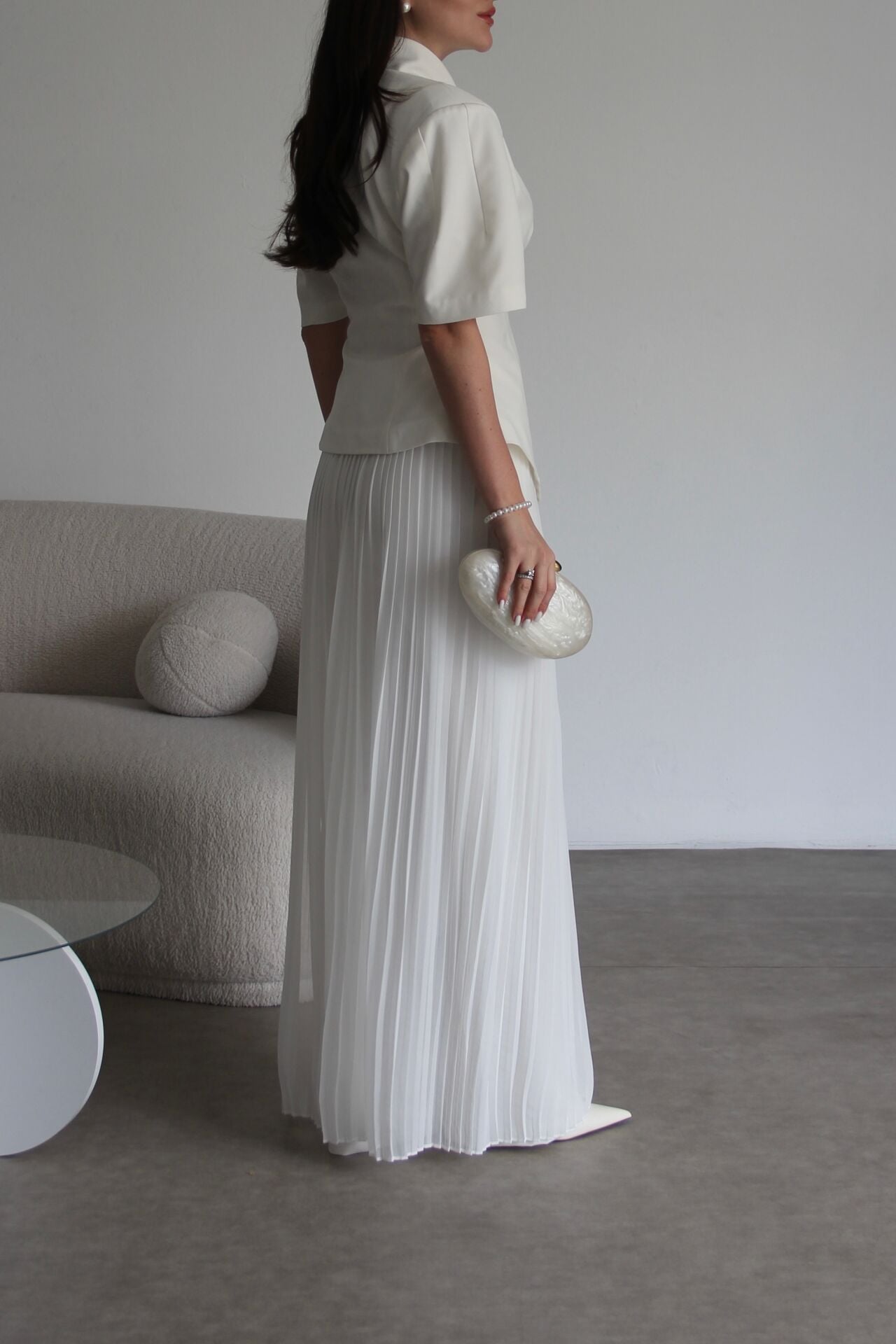 - - - Julidress.; Ekru Beyaz. Tasarım Tek Düğme Asimetrik Kesim Ceket ve Çıkabilir Piliseli Etekli Pantolon Alt Üst Premium 3'lü Takım.; Kumaş Türü: %93 Polyester %7 Elastan .; Ceket Boyu:Ortalama:70 cm, Pantolon boyu:108-110cm, Paça boyu:27 cm dir.;.; Model Boy : 176 cm .; Model Kilo : 55 kg.;.; Şık ve modern tasarımıyla dikkat çeken, tek düğmeli ceket ve piliseli etekli pantolon alt üst takım.; - Standart kol tipi ve kısa kol boyu ile konforlu bir kullanım sunar.; - V yaka detayı ile feminen bir görünüm kazandırır.; - Premium kalitesiyle öne çıkan bu 3'lü takım, özel günlerde ve davetlerde şıklığınızı tamamlar.; - Çıkabilir piliseli etek detayı sayesinde farklı kombinasyonlar oluşturmanıza olanak tanır.;