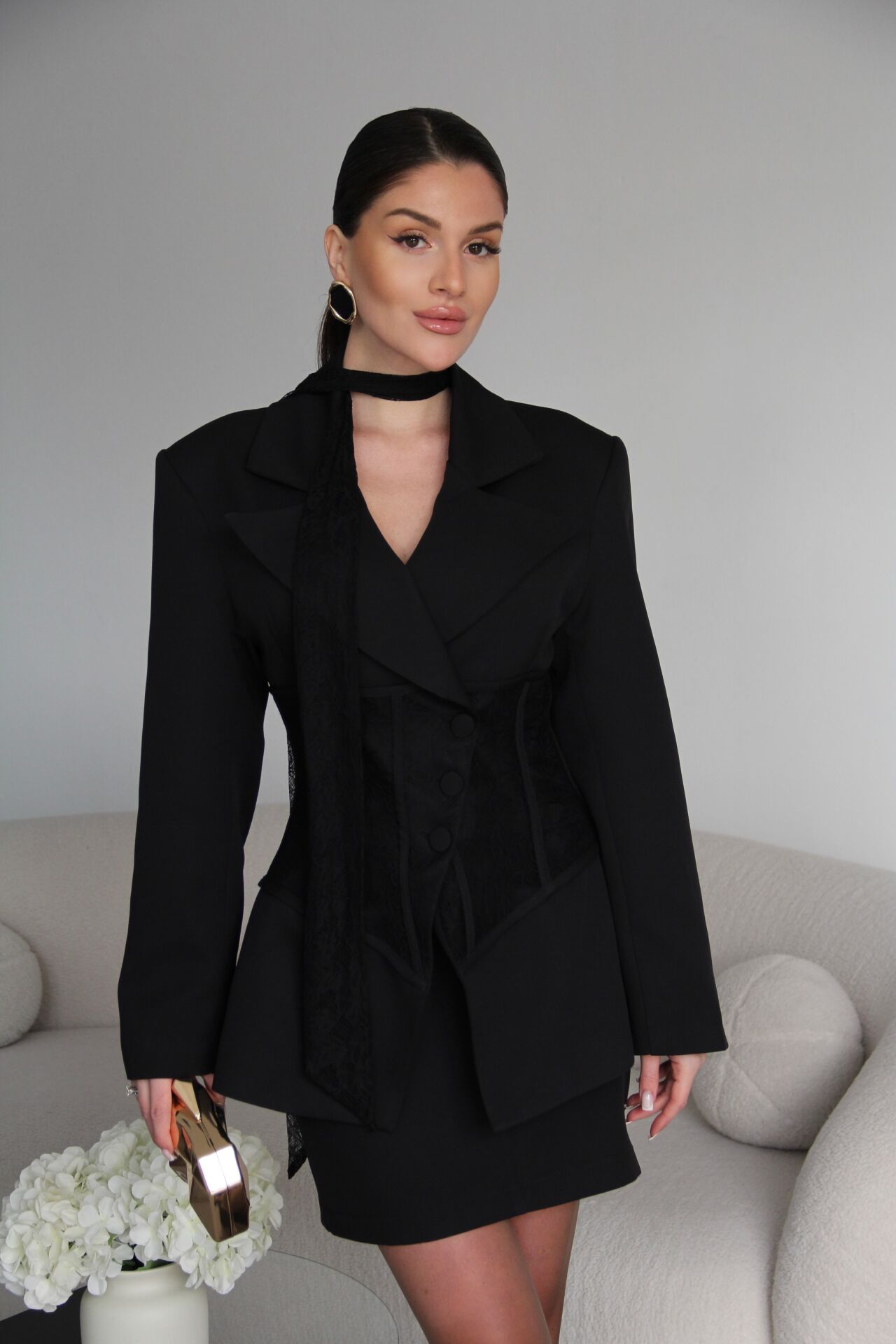 Tül Şallı Dantel Detaylı Korsajlı Ceket ve Mini Etekli Premium 3'lü Siyah Takım