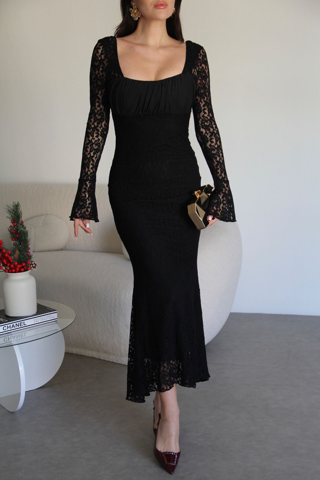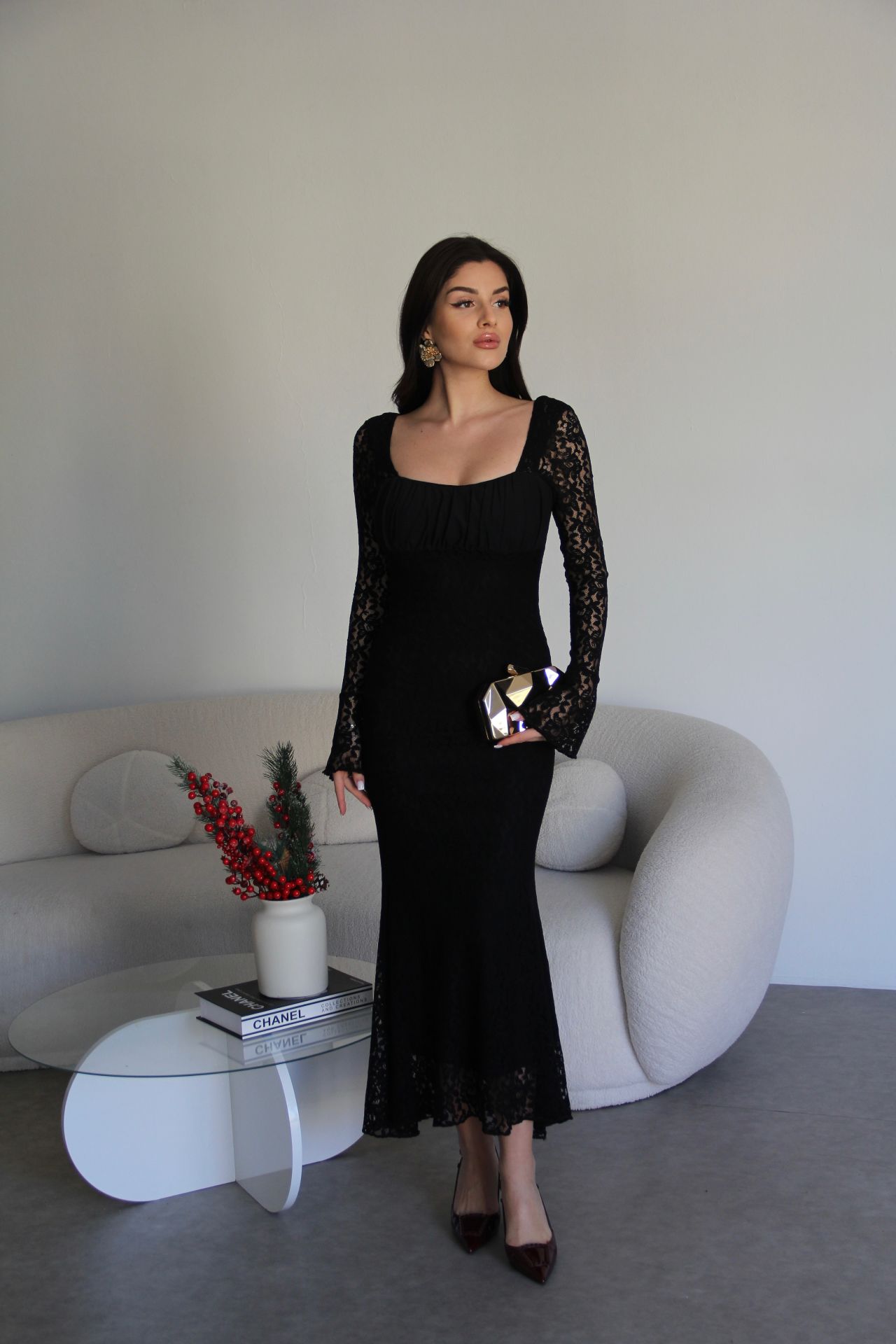 - Julidress- Yüksek Kalite, Yeni Sezon Transparan Yaka Astarlı Maxi Uzun Boy Premium Tasarım Dantel Elbise