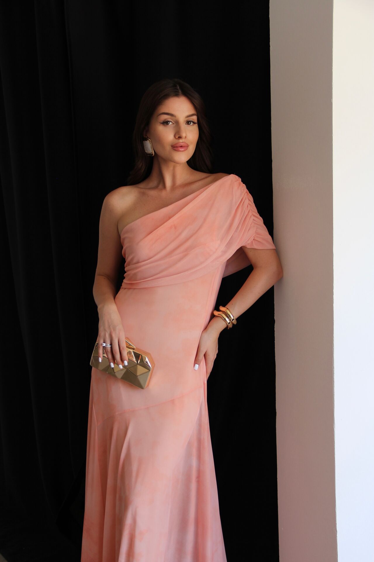 Turuncu Desenli Tek Omuz Astarlı Premium Şifon Tül Elbise