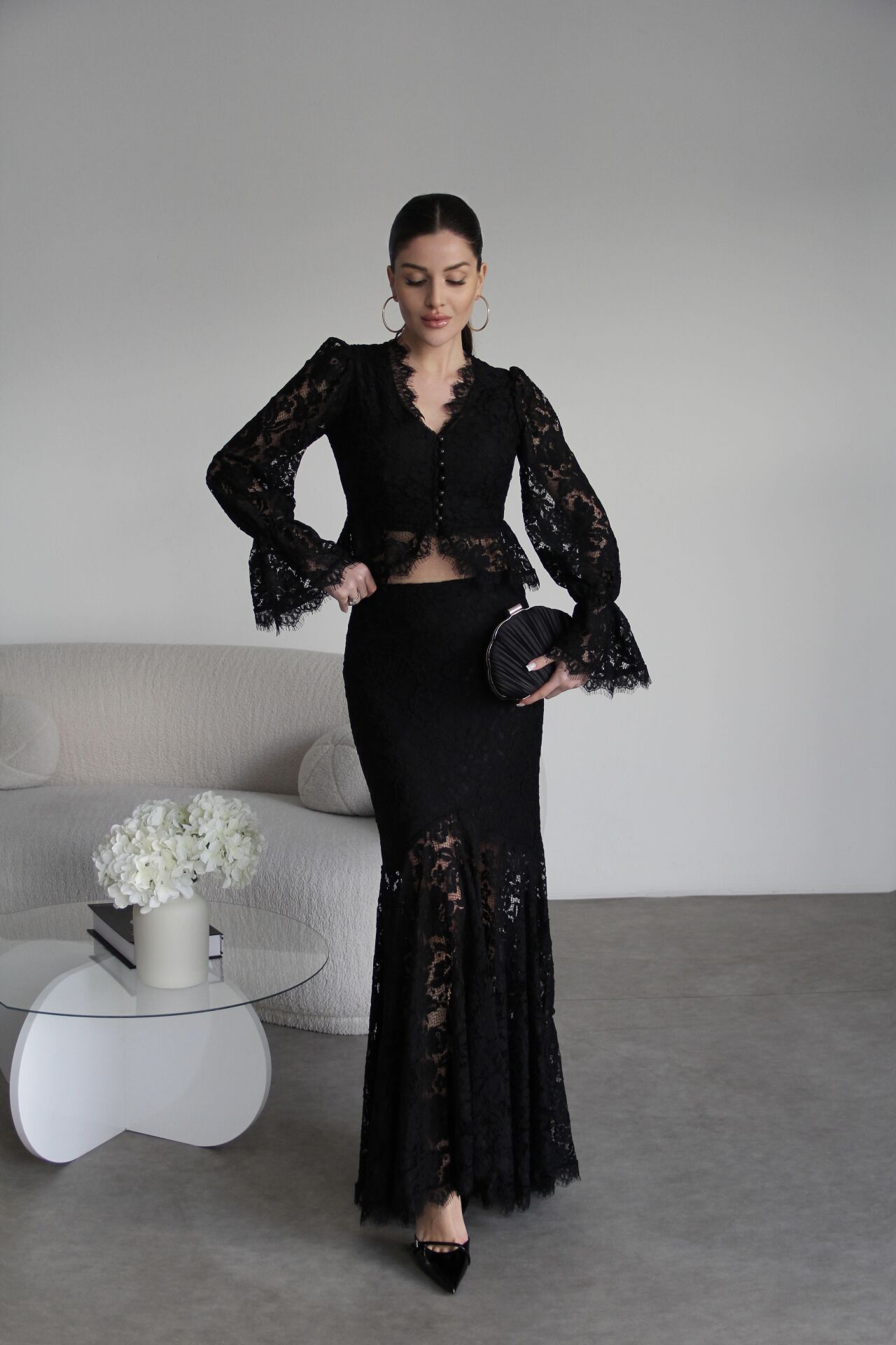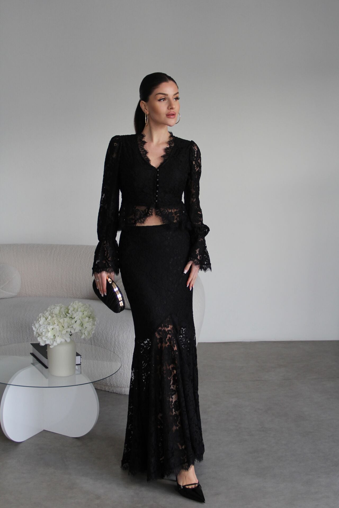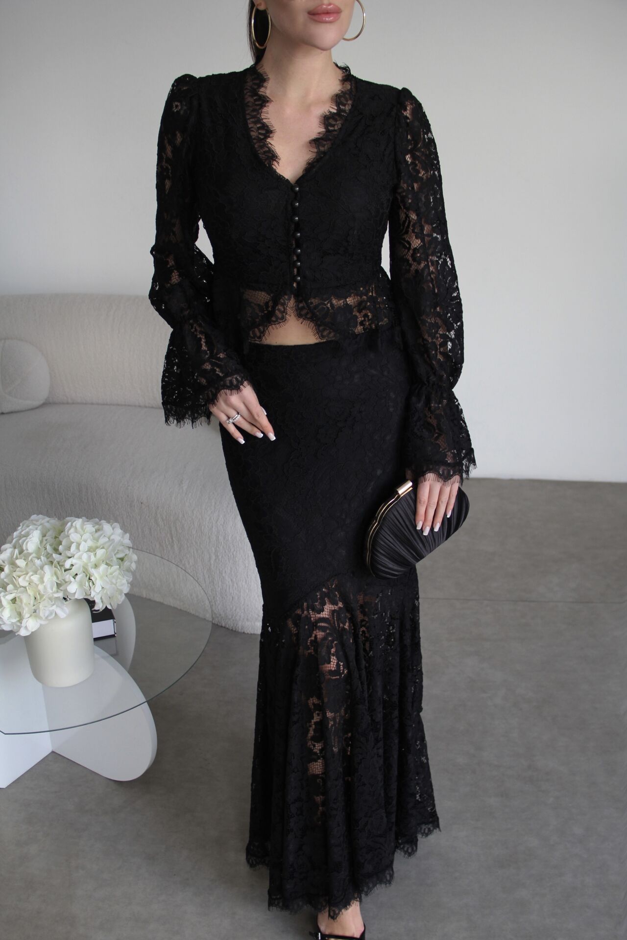 V Yaka Astarlı inci Düğmeli Bluz ve Maxi Etek Tasarım Dantel Takım