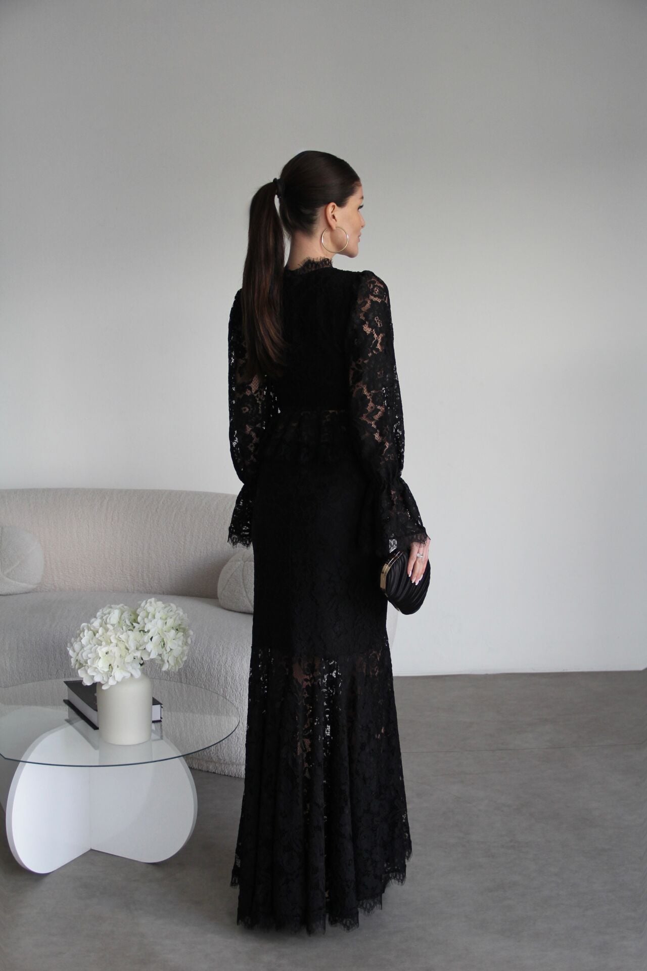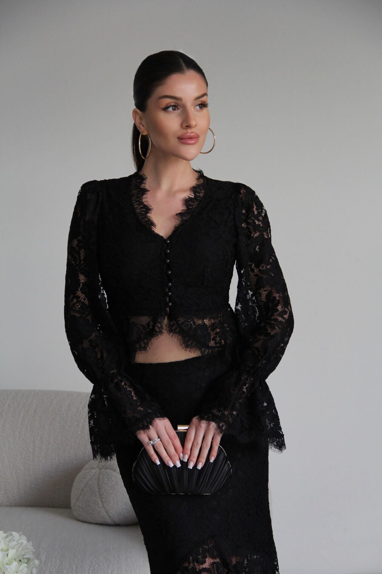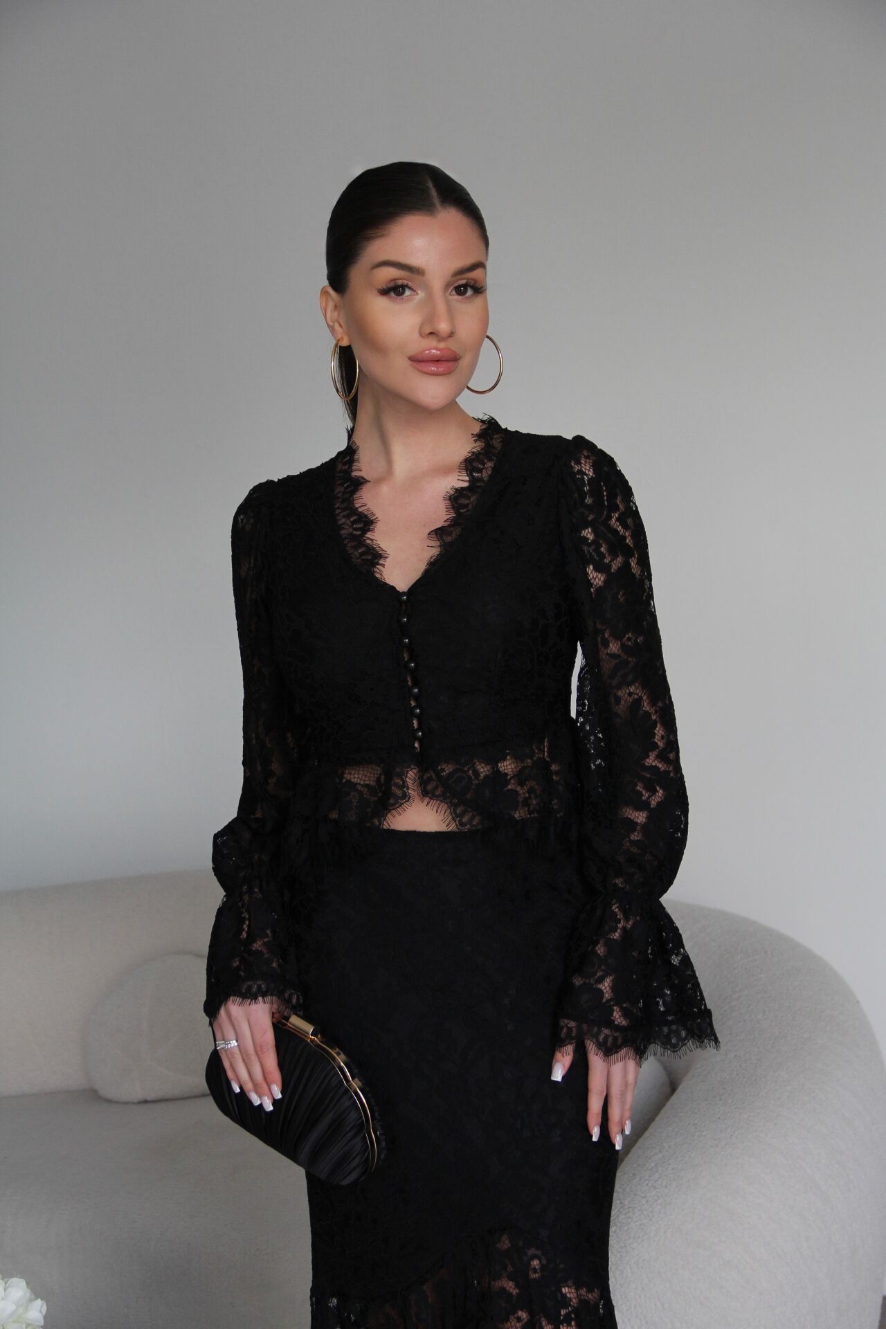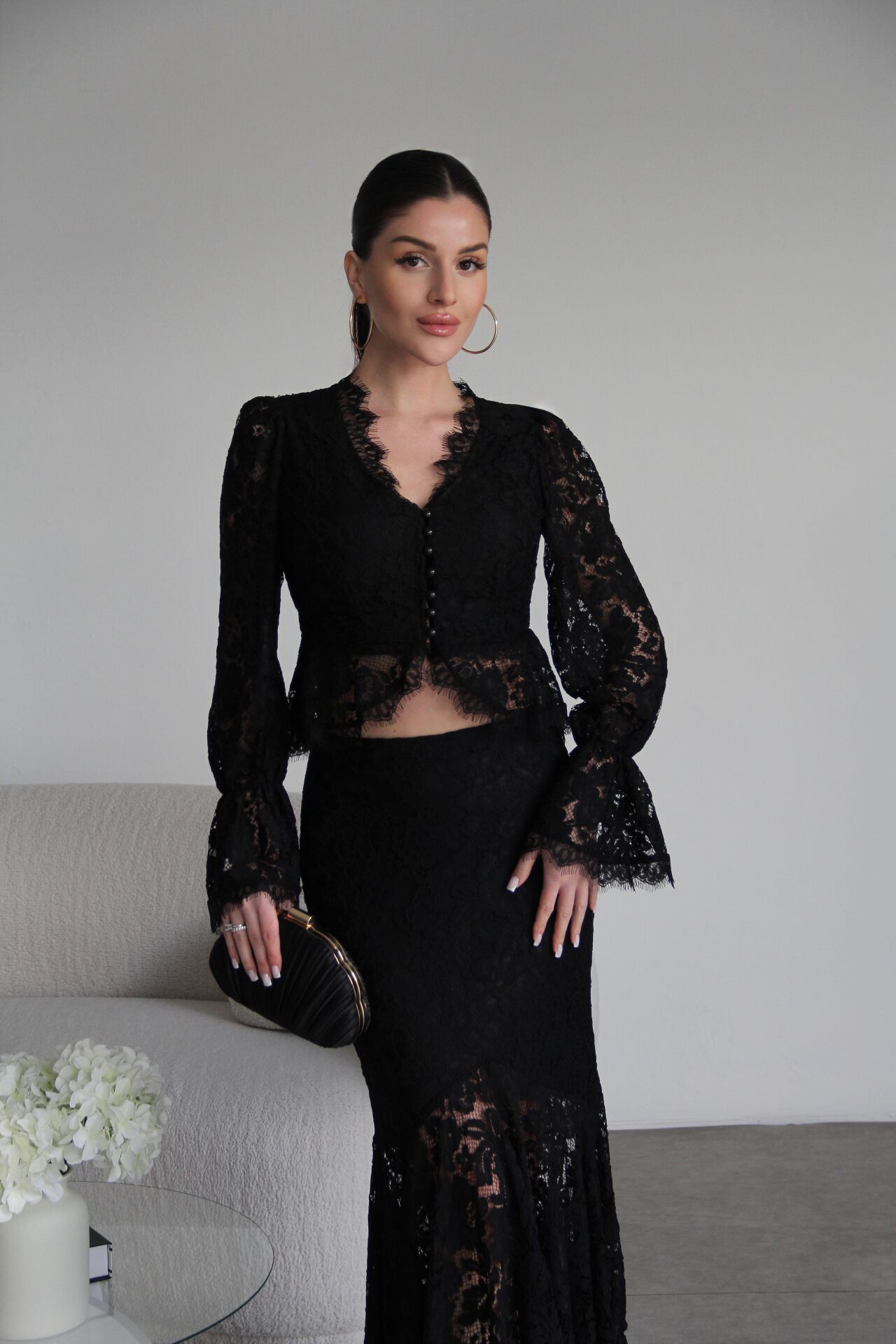 V Yaka Astarlı inci Düğmeli Bluz ve Maxi Etek Tasarım Dantel Takım
