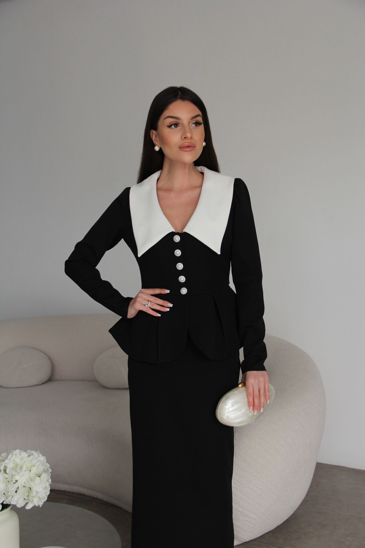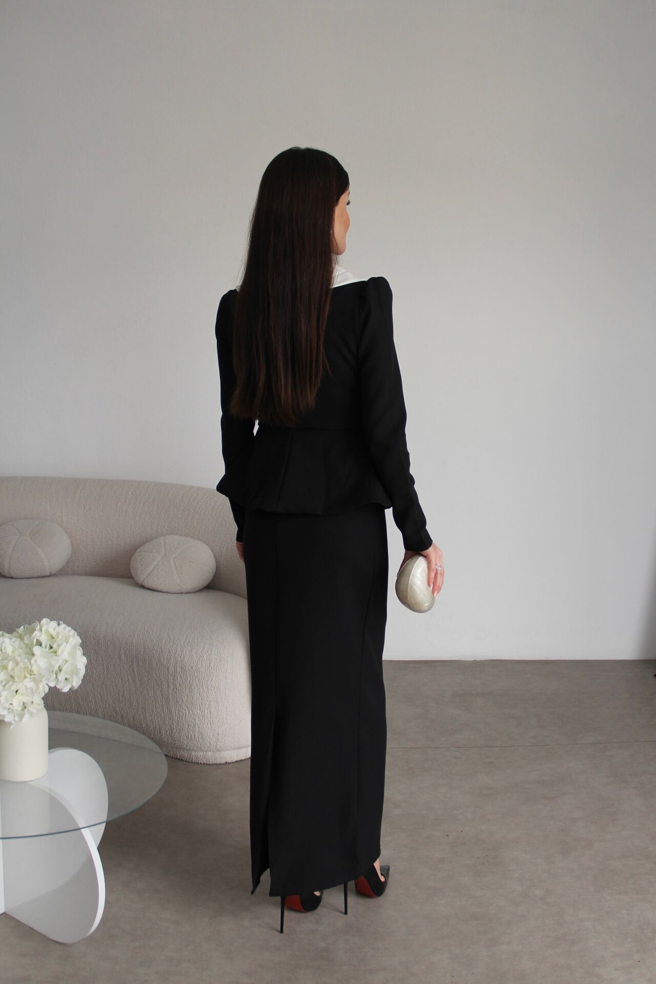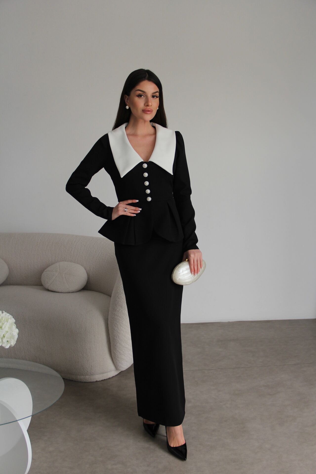 V Yaka Fırfırlı inci düğmeli Ceket ve Maxi Etek Premium Tasarım Takım