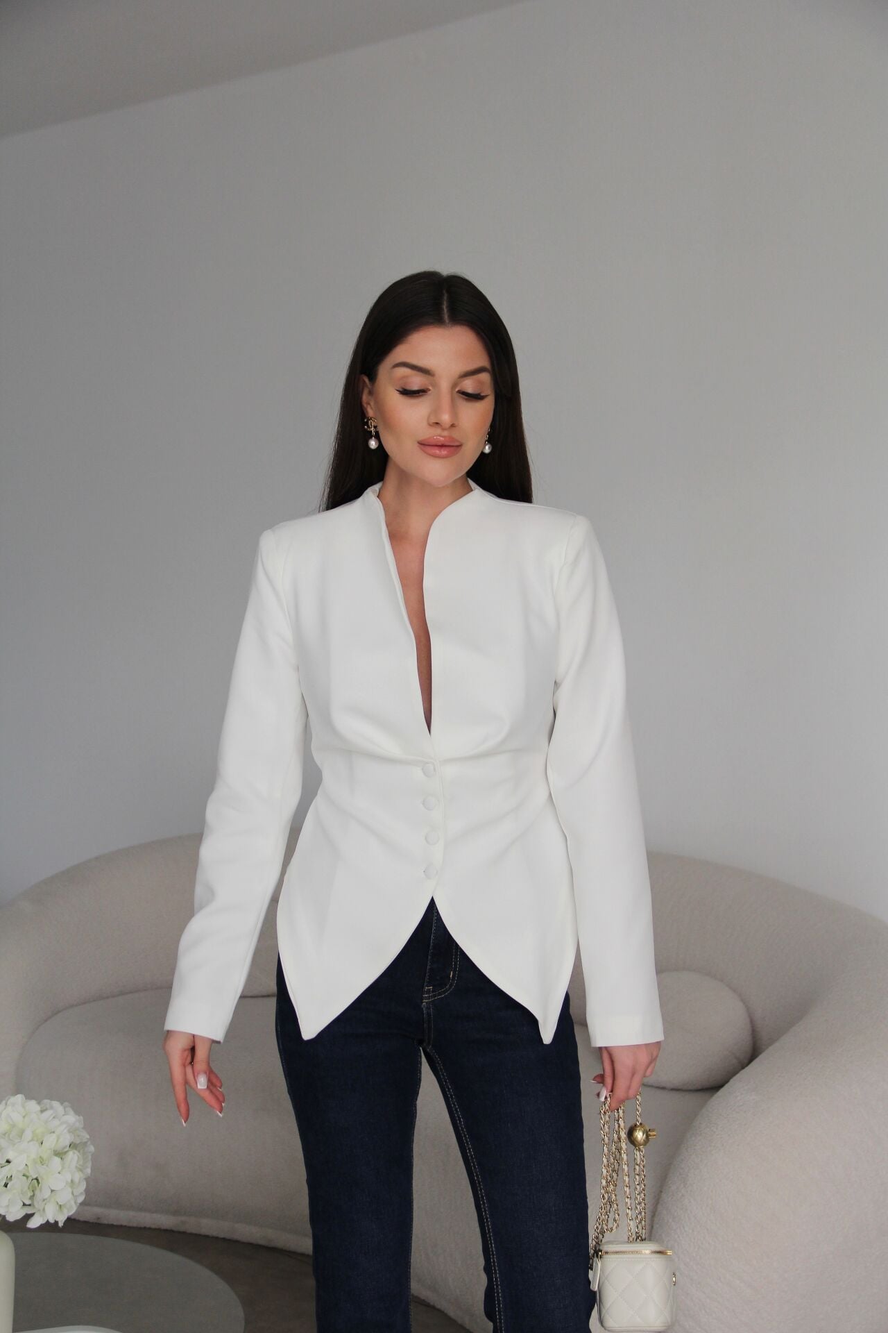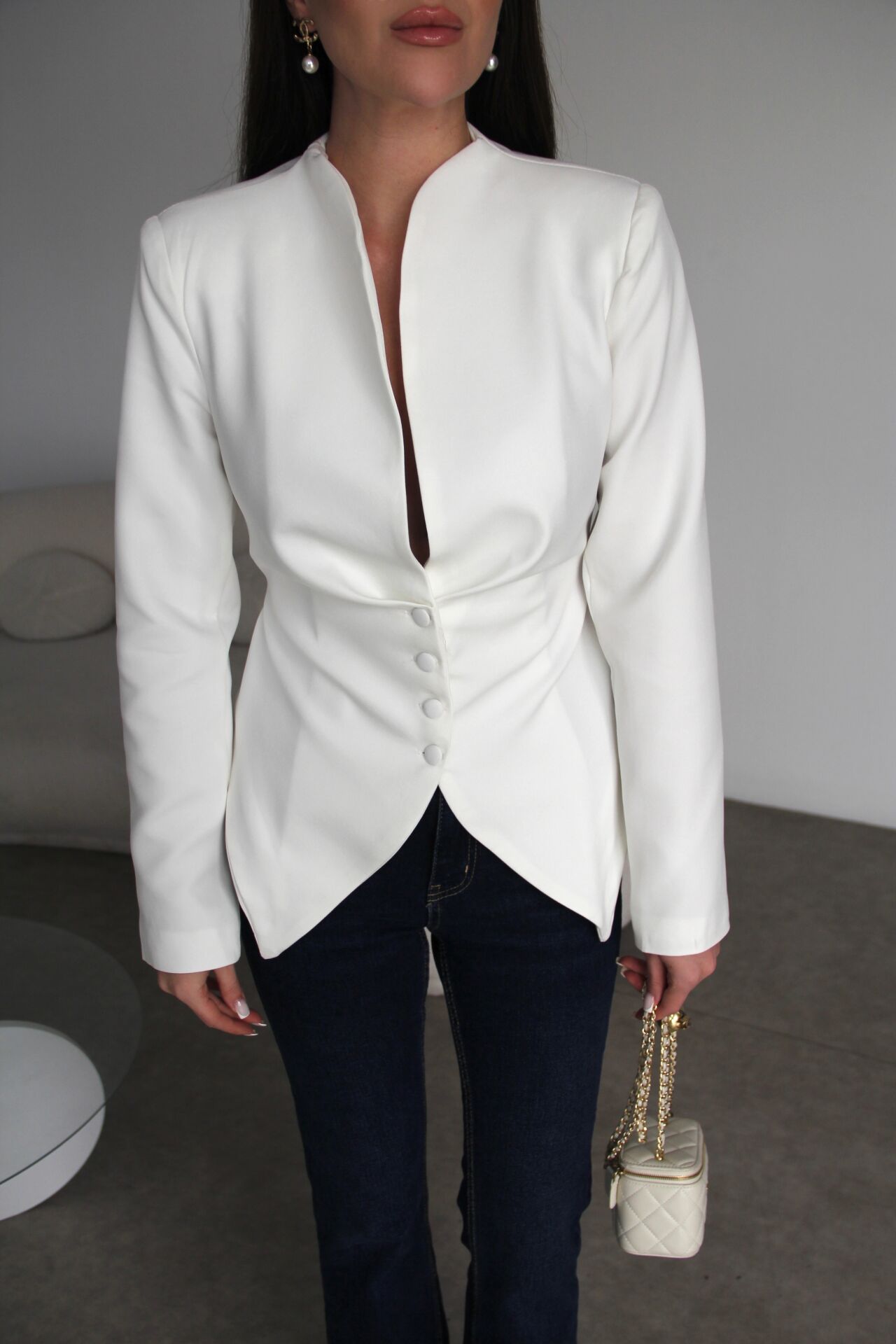 Vatkalı Pens ve Bağlama Detaylı Astarlı Premium Asimetrik Beyaz Ceket