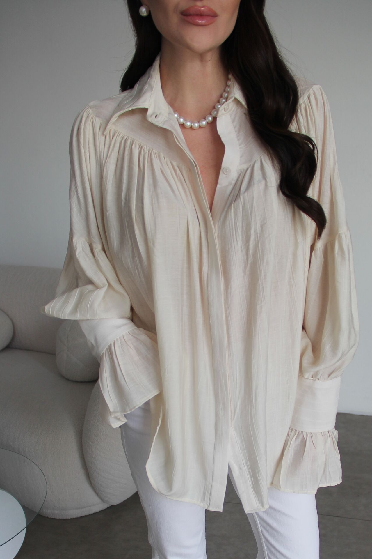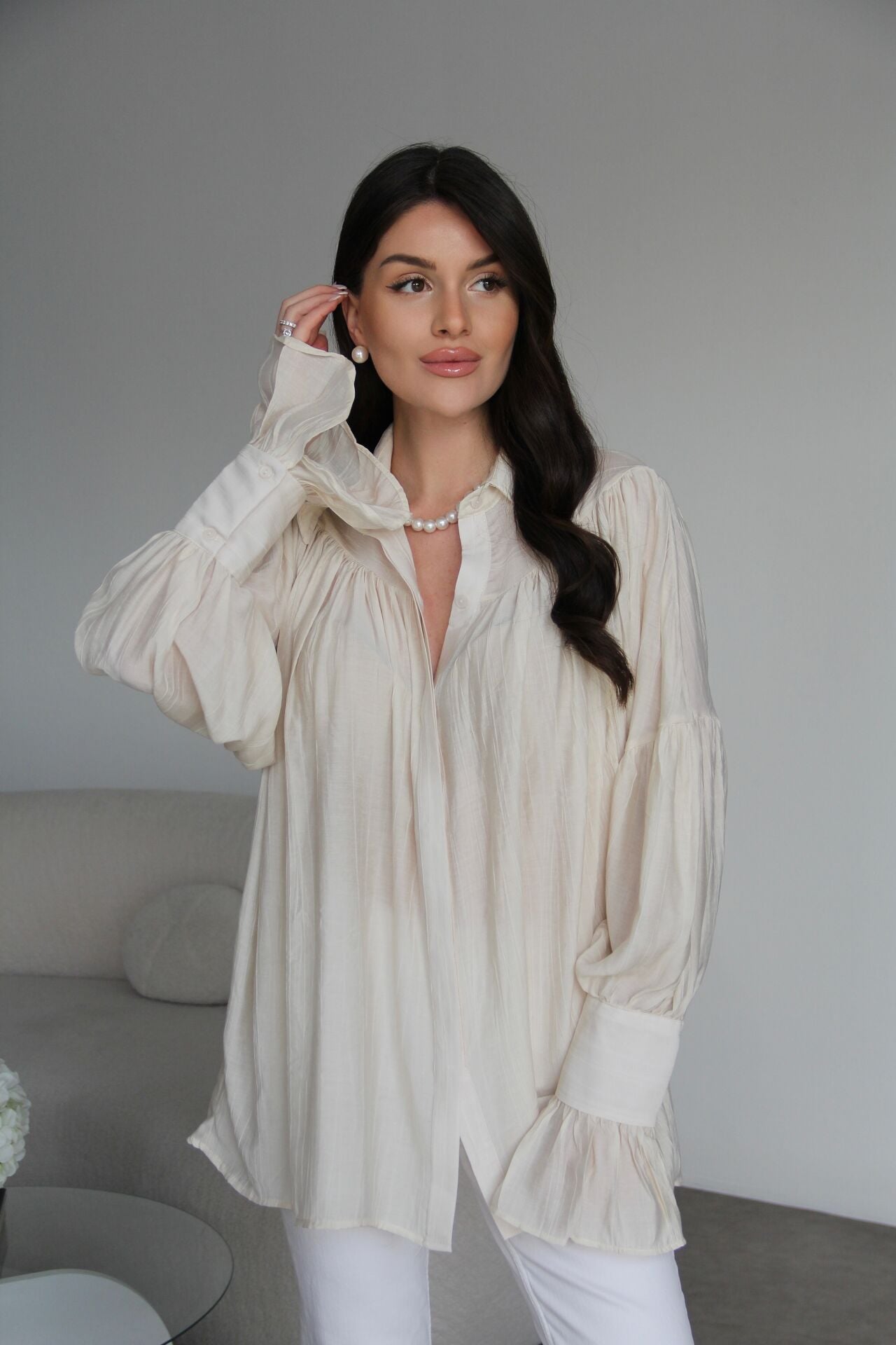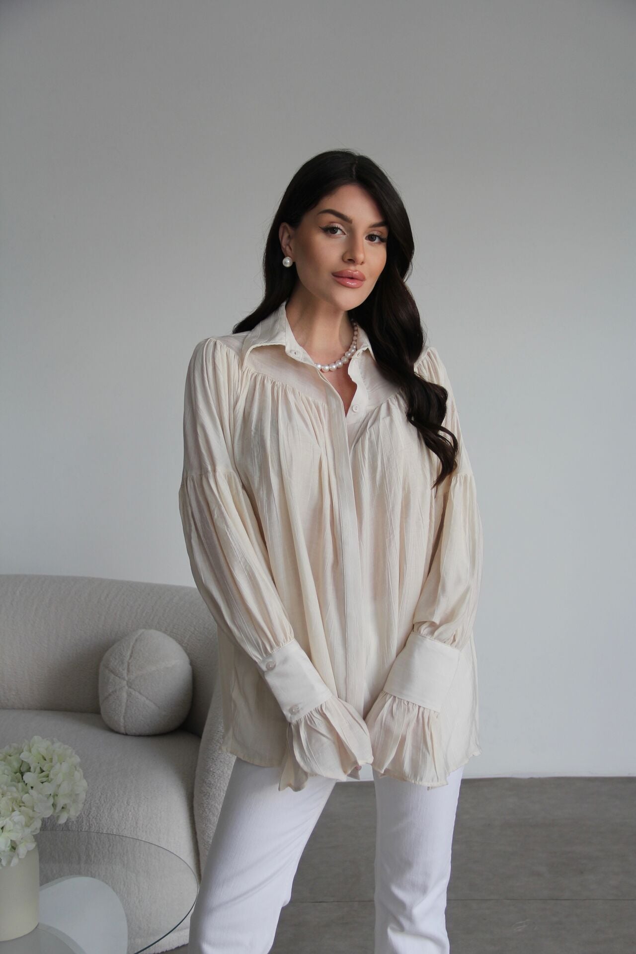 Krem Vintage Büzgü Kol Detaylı Premium Gömlek